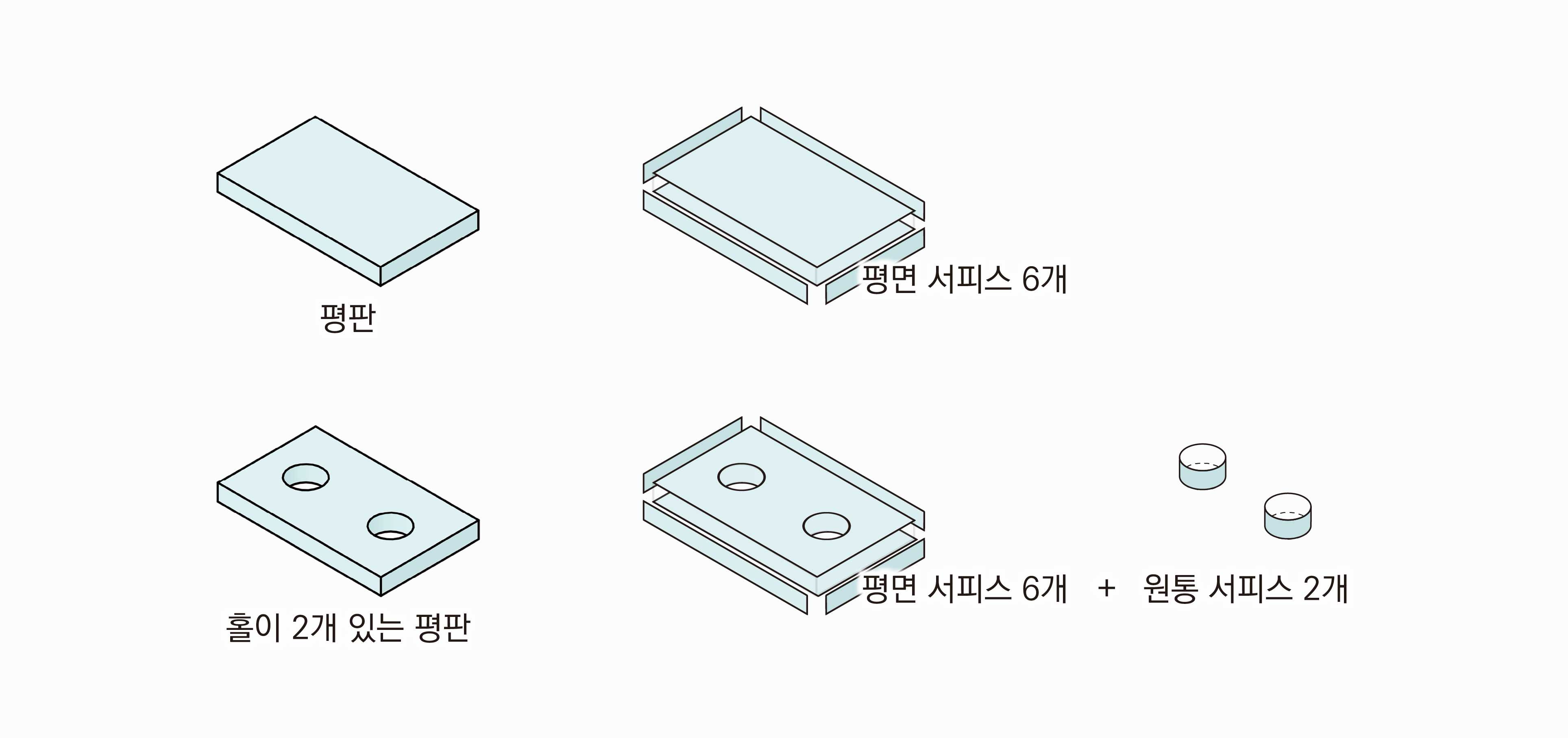 홀이 없을 때 평판은 평면 서피스 6개로 이루어진다. 이 평판에 홀이 2개 추가되면 이 평판은 평면 서피스 6개와 원통 서피스 2개로 이루어진다. 원통 서피스 2개를 경계로 평판의 재료가 제거되면서 홀이 생긴다.