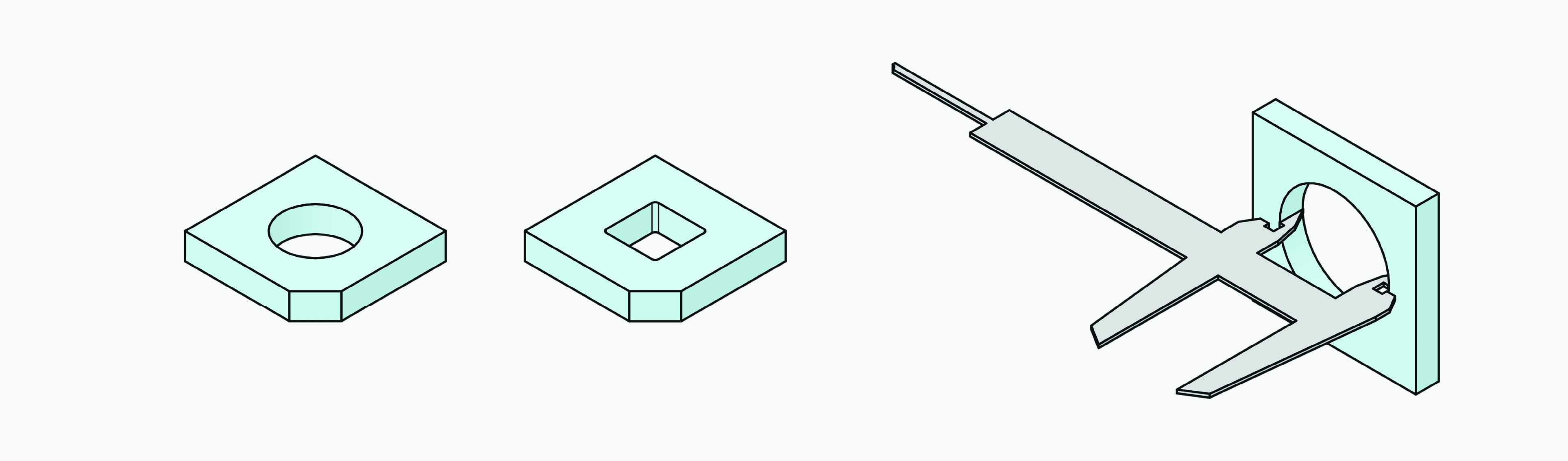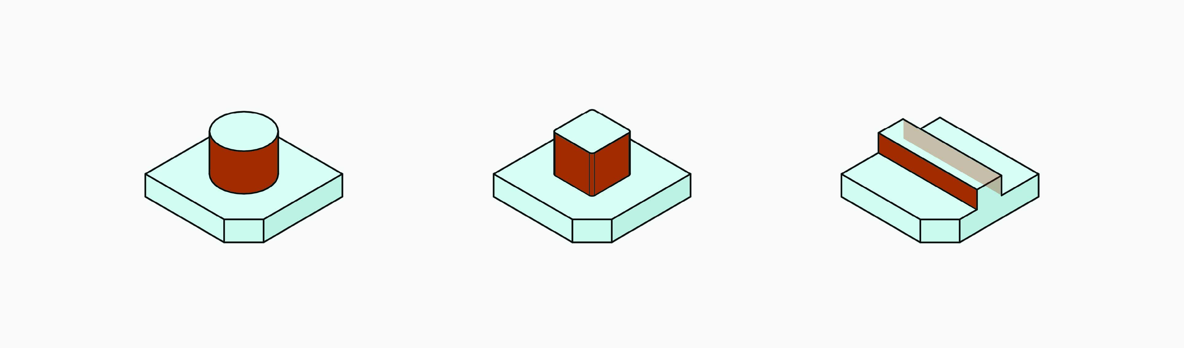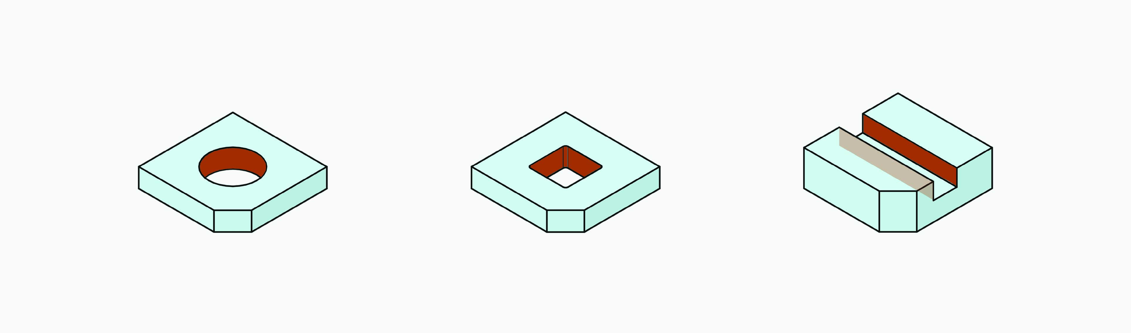 그런데 여기서 조금 특별한 경우가 있다. 긴 홈 형태인 슬롯은 홀처럼 안쪽에 재료가 없지만, 양쪽 끝이 막혀있지 않고 열려있다. 반대로 레일이라고 부르는 돌출된 형태는 축처럼 안쪽에 재료가 있지만, 양쪽 끝이 다른 서피스와 연결되어 있다.