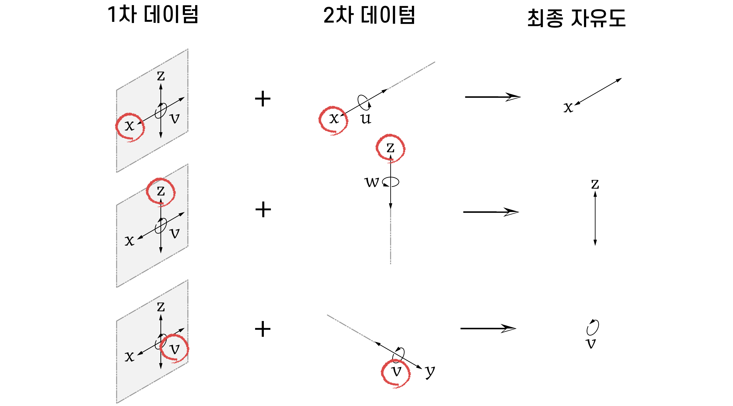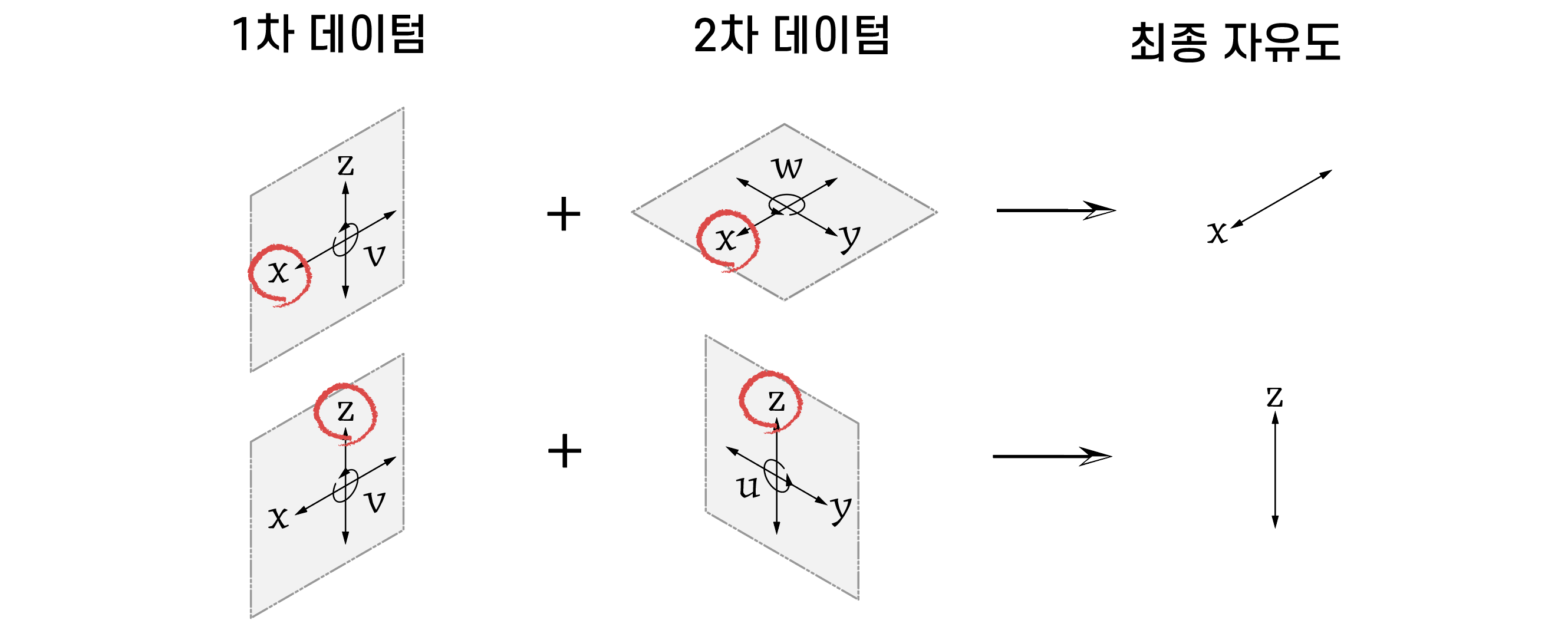 1차 데이텀에 의해 남아 있는 자유도가 2차 데이텀에 의해서도 남는다면, 최종적으로 해당 자유도가 남게 된다. 여러 가지 경우를 모두 살펴봤지만 결과적으로 1차 데이텀과 2차 데이텀에서 공통적으로 제한하지 못하는 방향의 병진자유도 1개가 남게 된다.