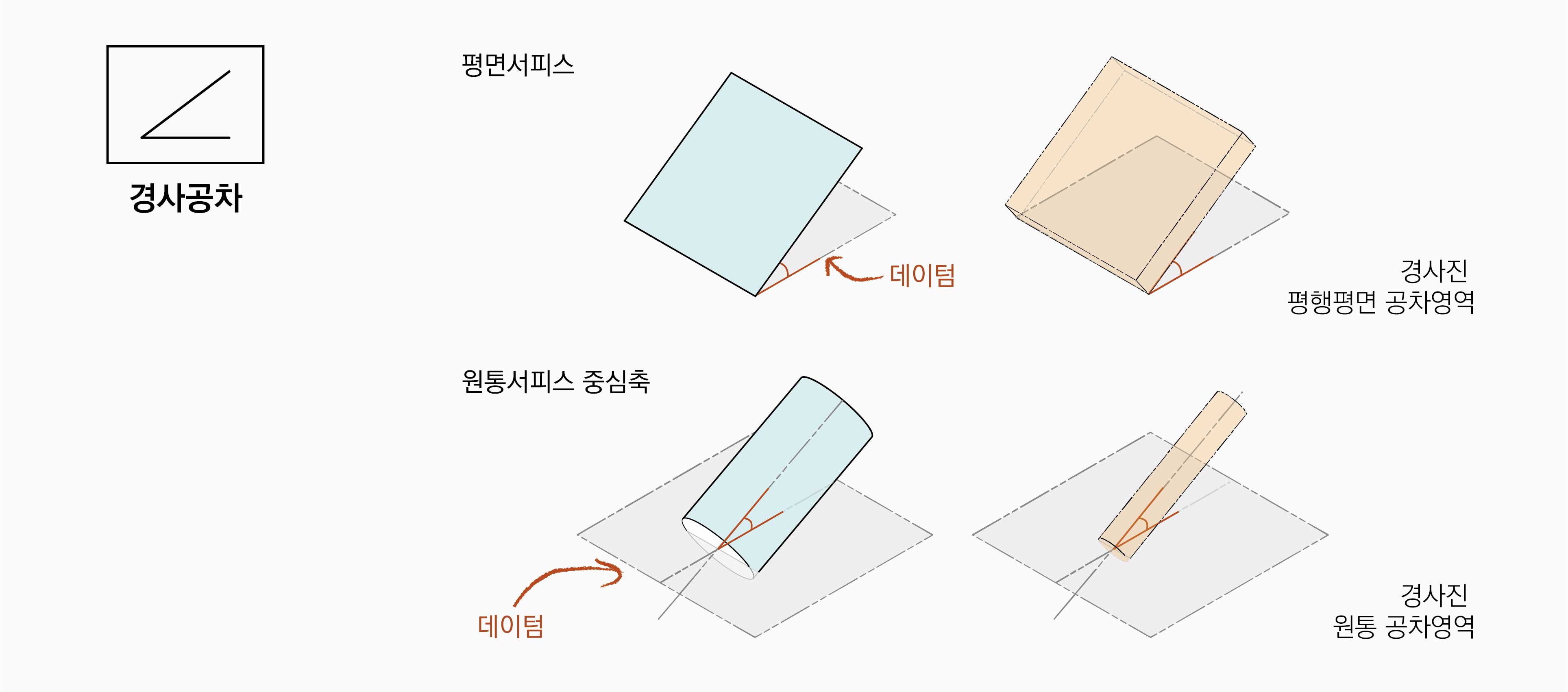 경사공차는 평면서피스에도 적용할 수 있고, 원통서피스에도 적용할 수 있다. 평면서피스에 적용된 경우를 살펴보면, 경사공차는 기준면에 대해 베이직 각도로 기울어진 공차영역을 생성한다.