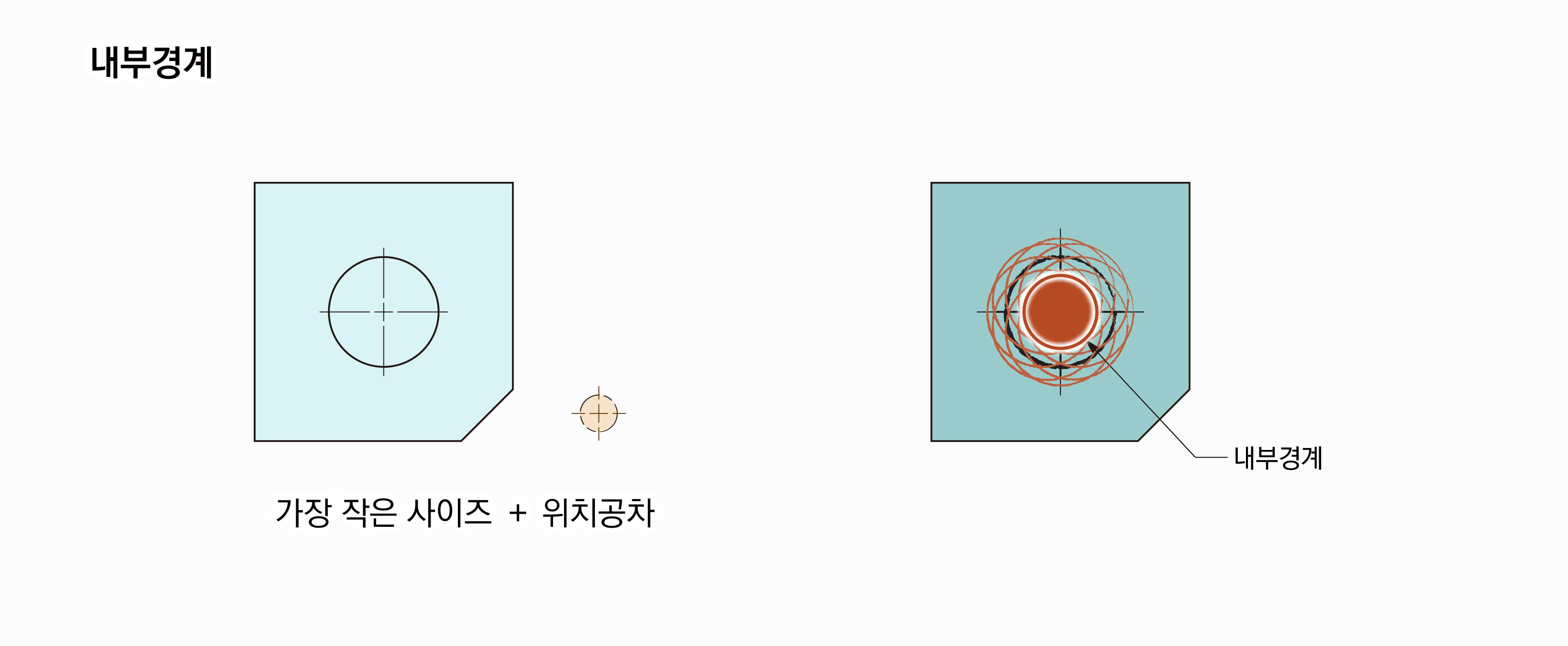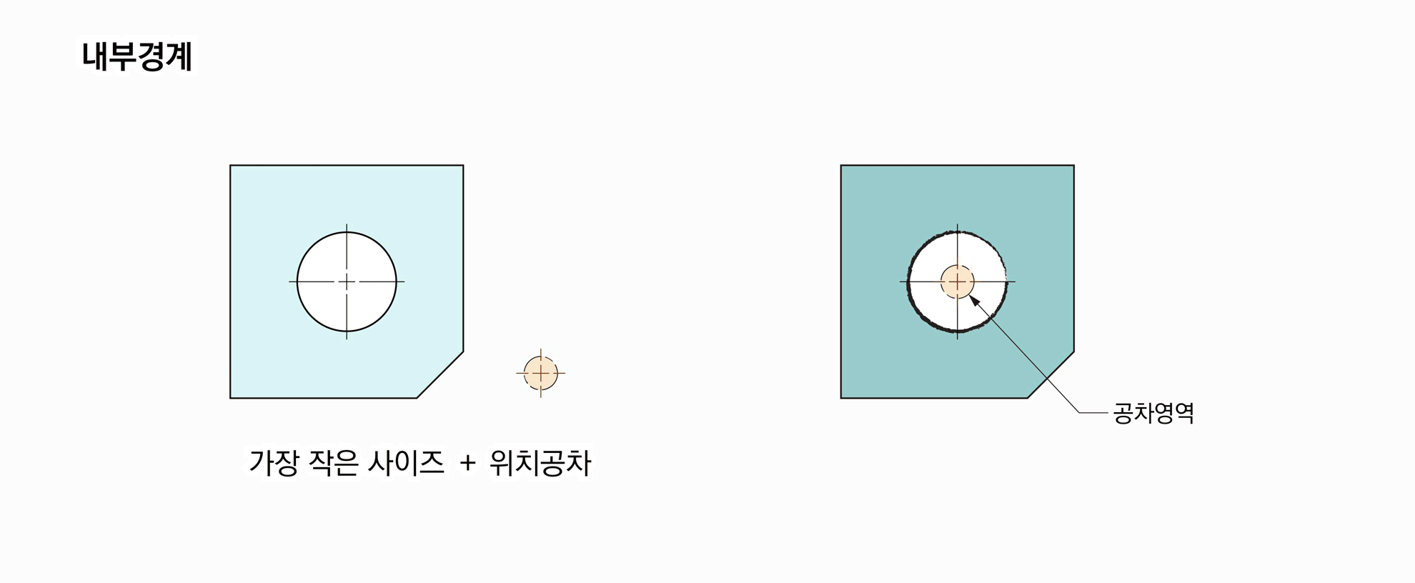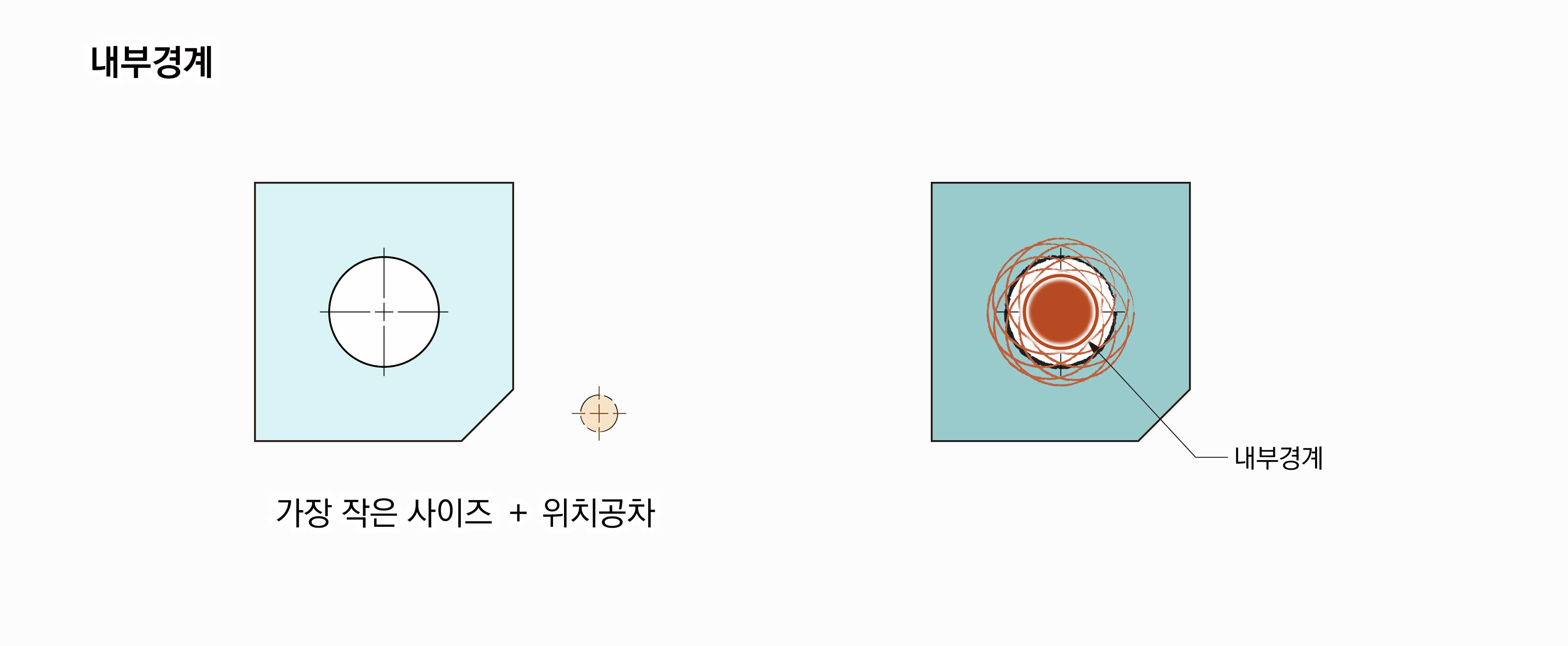 왼쪽 그림은 내부경계의 개념을 보여주고 있고, 오른쪽 그림은 실제 부품에서 가장 작은 사이즈의 홀이 최악의 위치에 있는 경우를 시각화하였다.