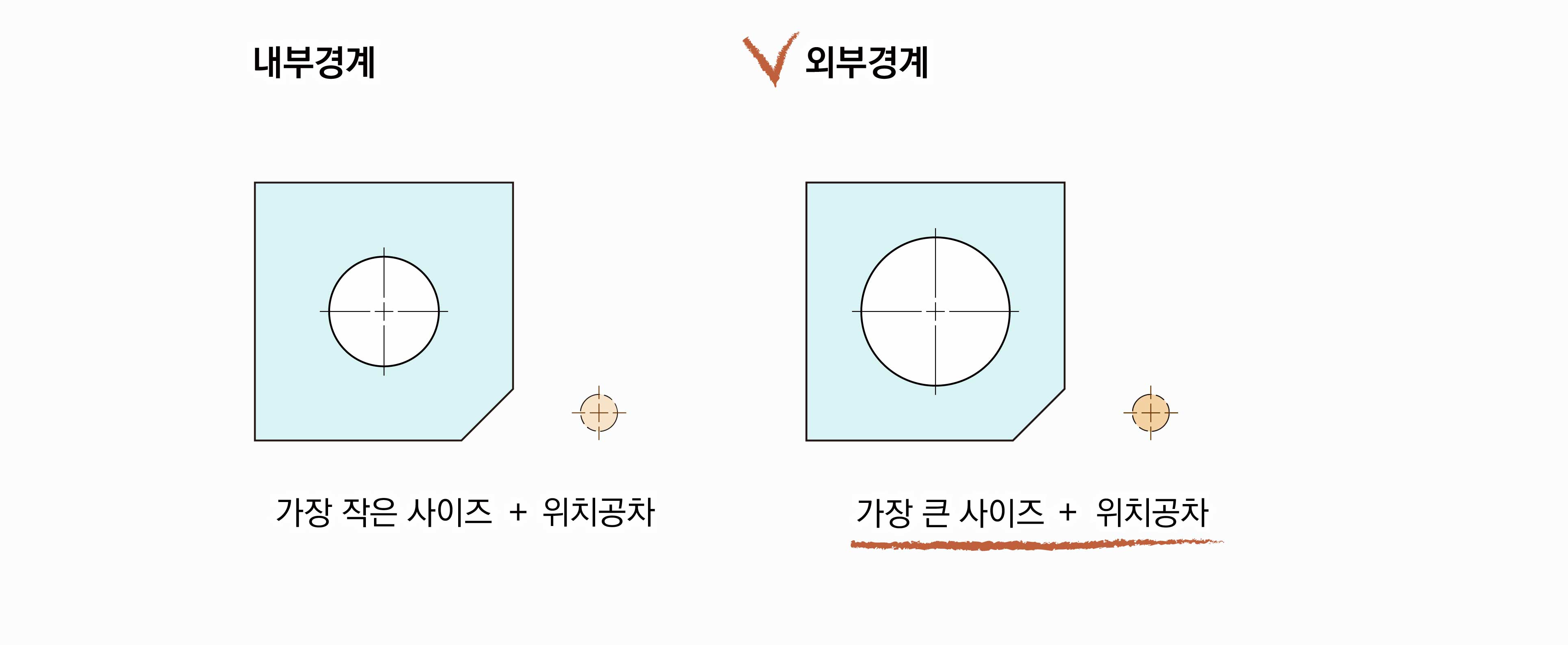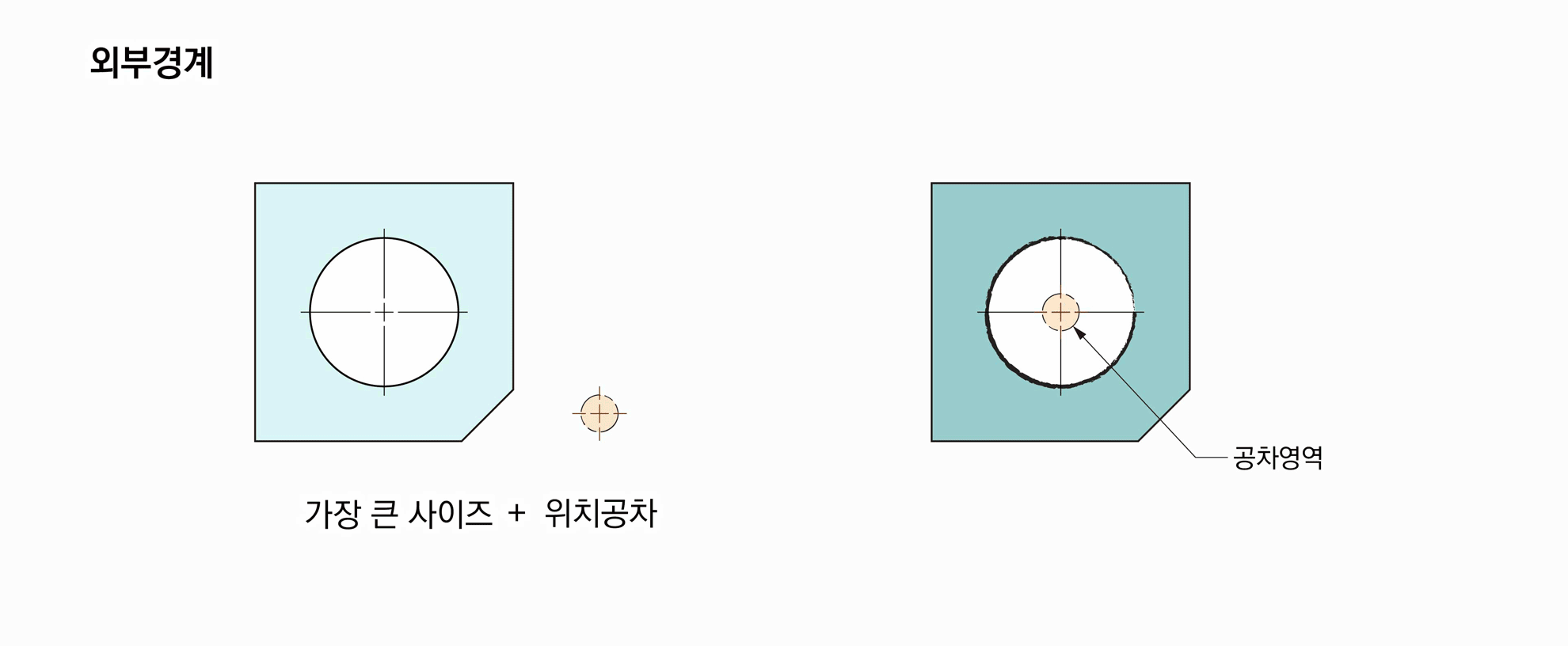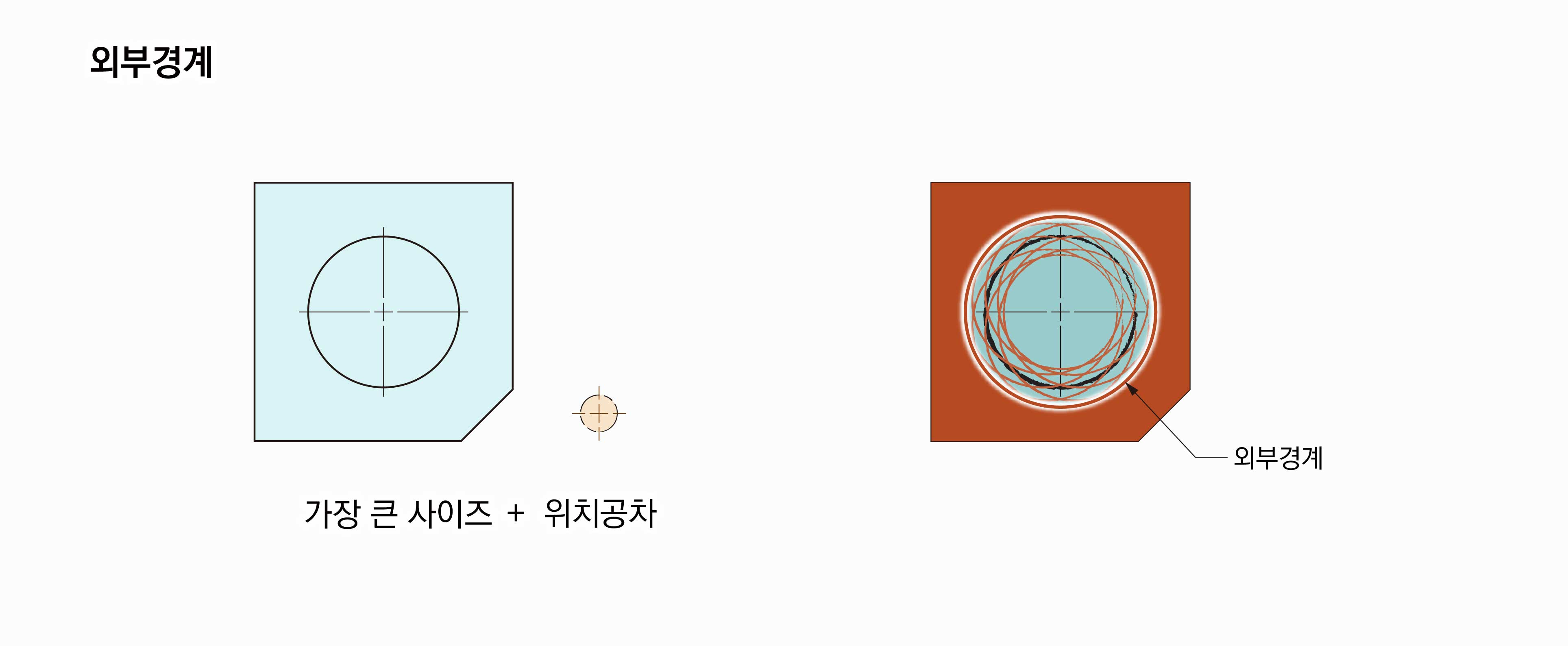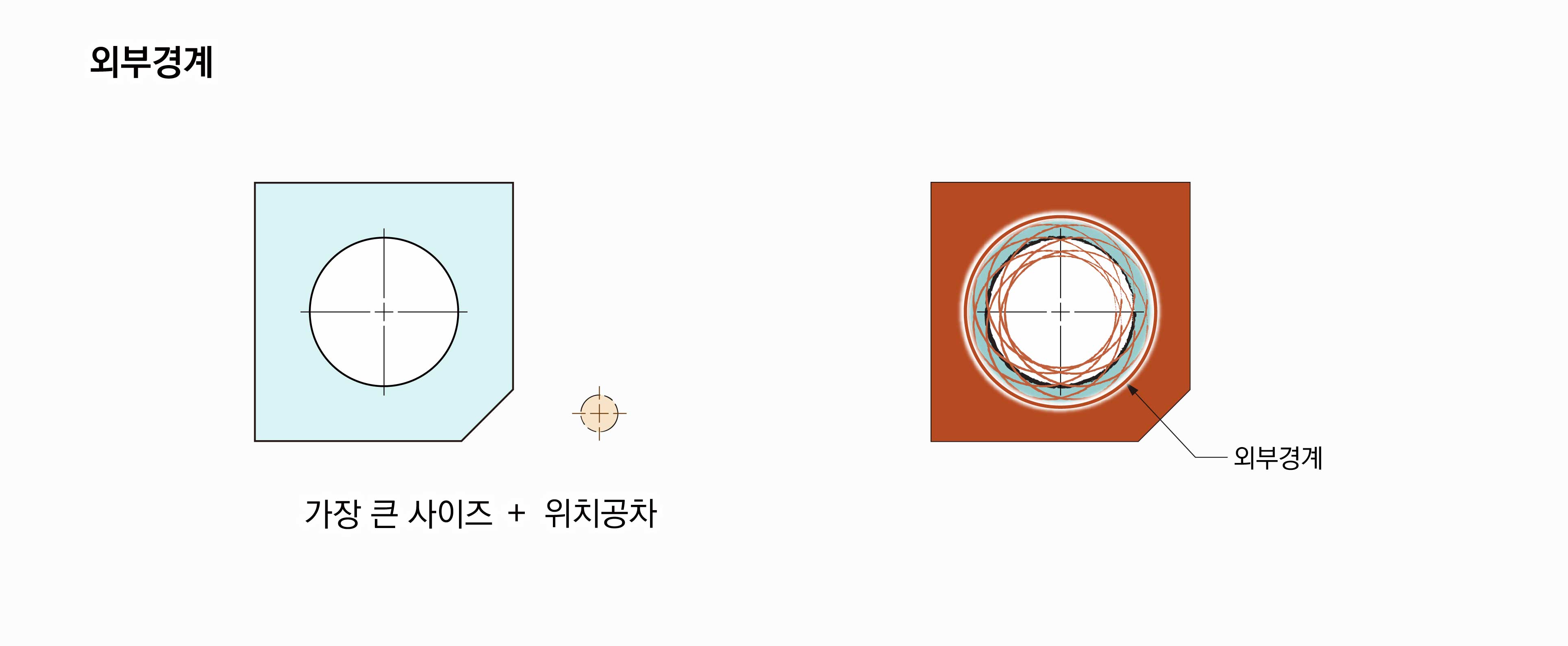 왼쪽 그림은 외부경계의 개념을 보여주고 있고, 오른쪽 그림은 실제 부품에서 가장 큰 사이즈의 홀이 최악의 위치에 있는 경우를 시각화하였다.