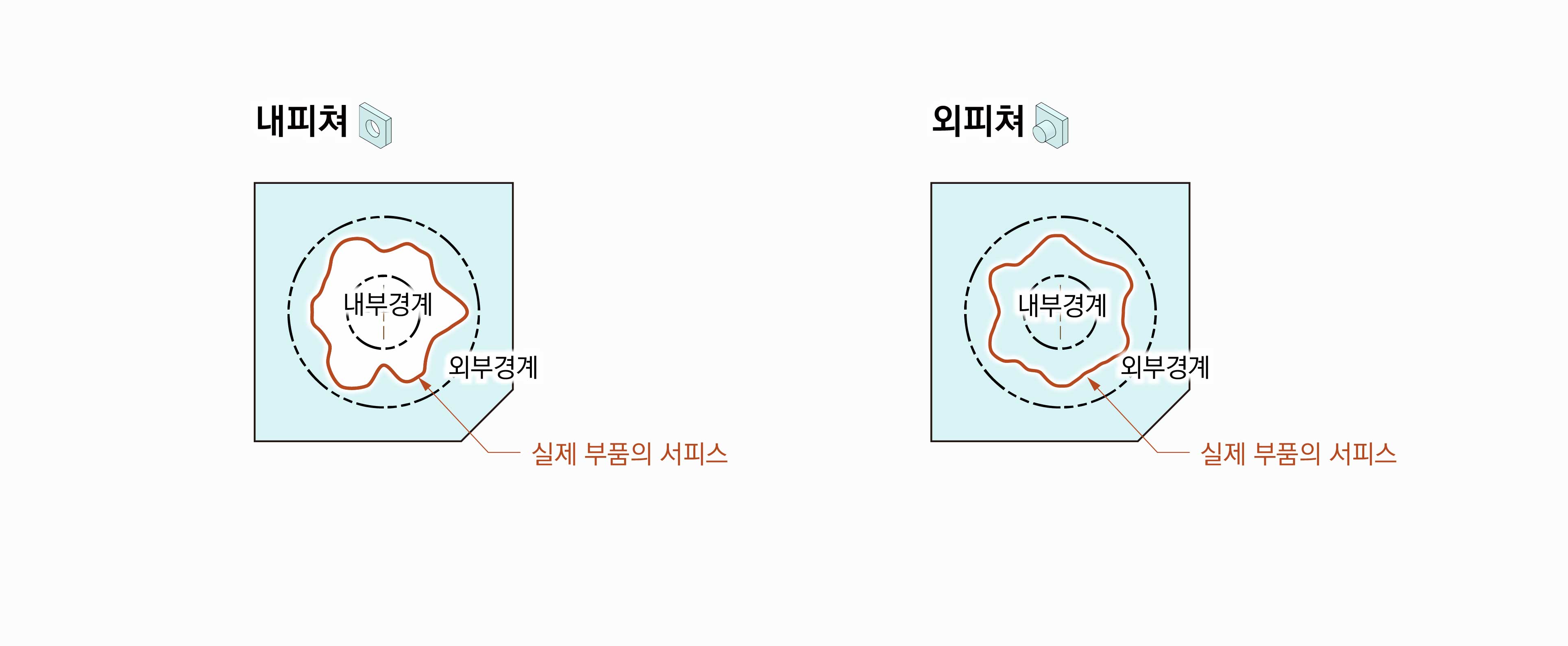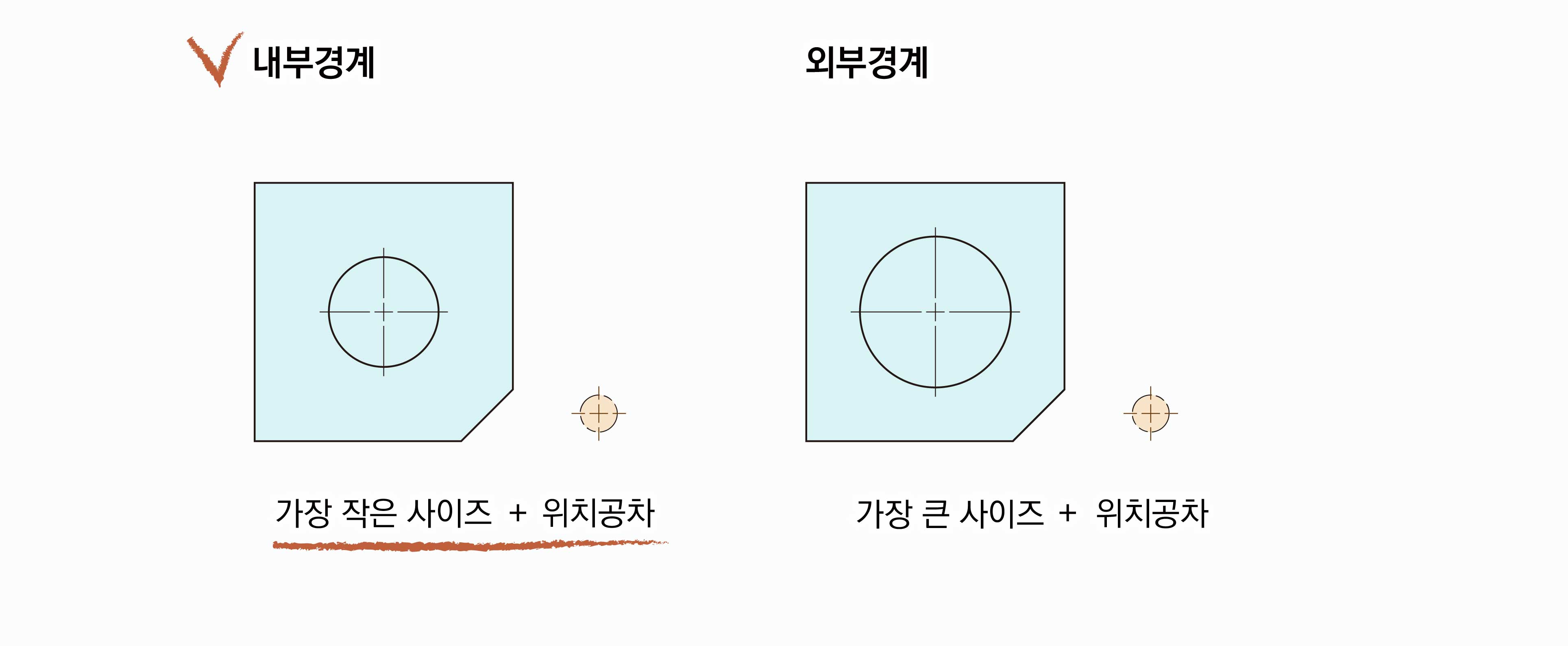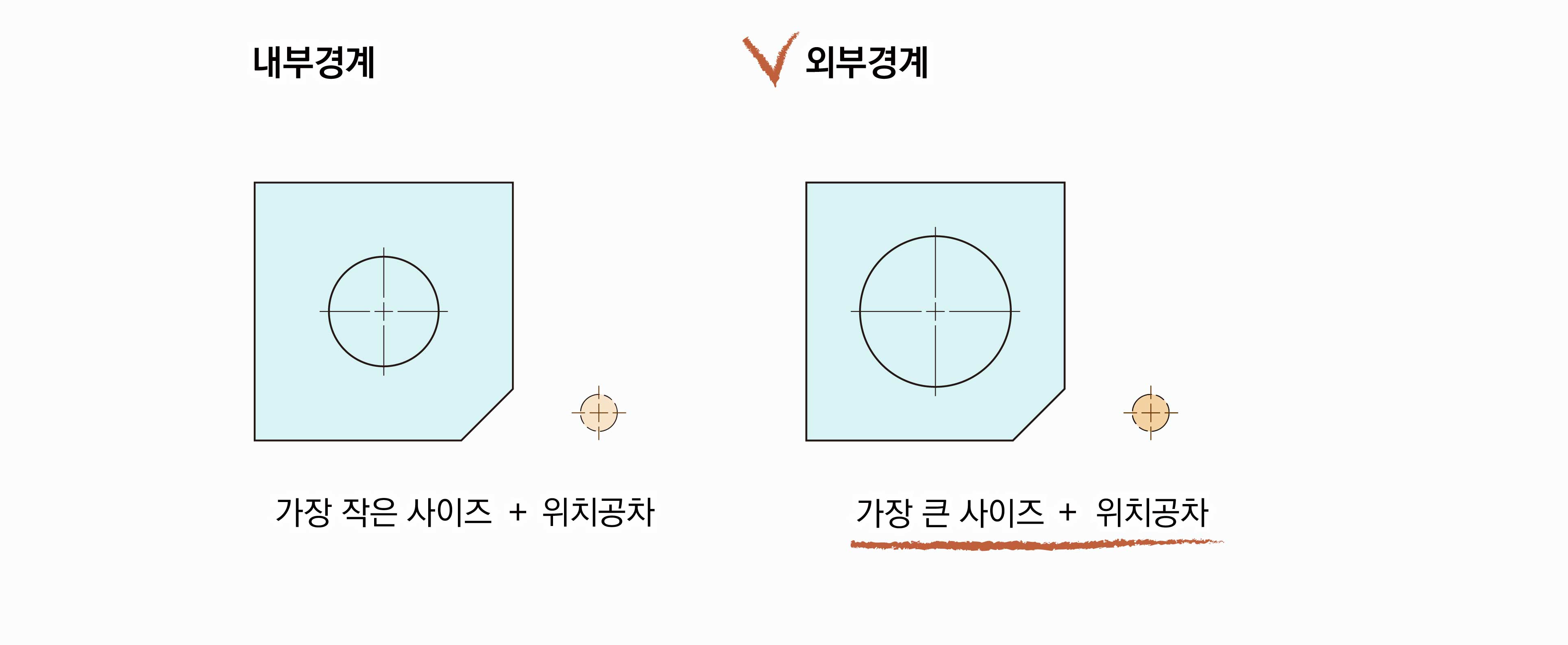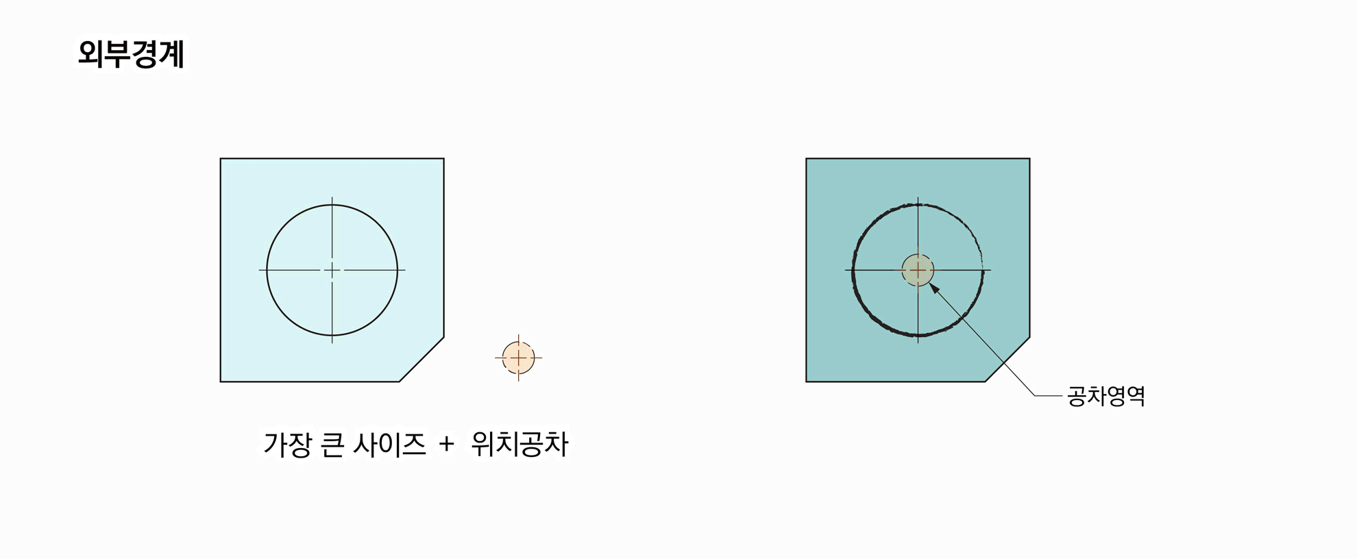 왼쪽 그림은 외부경계의 개념을 보여주고 있고, 오른쪽 그림은 실제 부품에서 가장 큰 사이즈의 홀이 최악의 위치에 있는 경우를 시각화하였다.