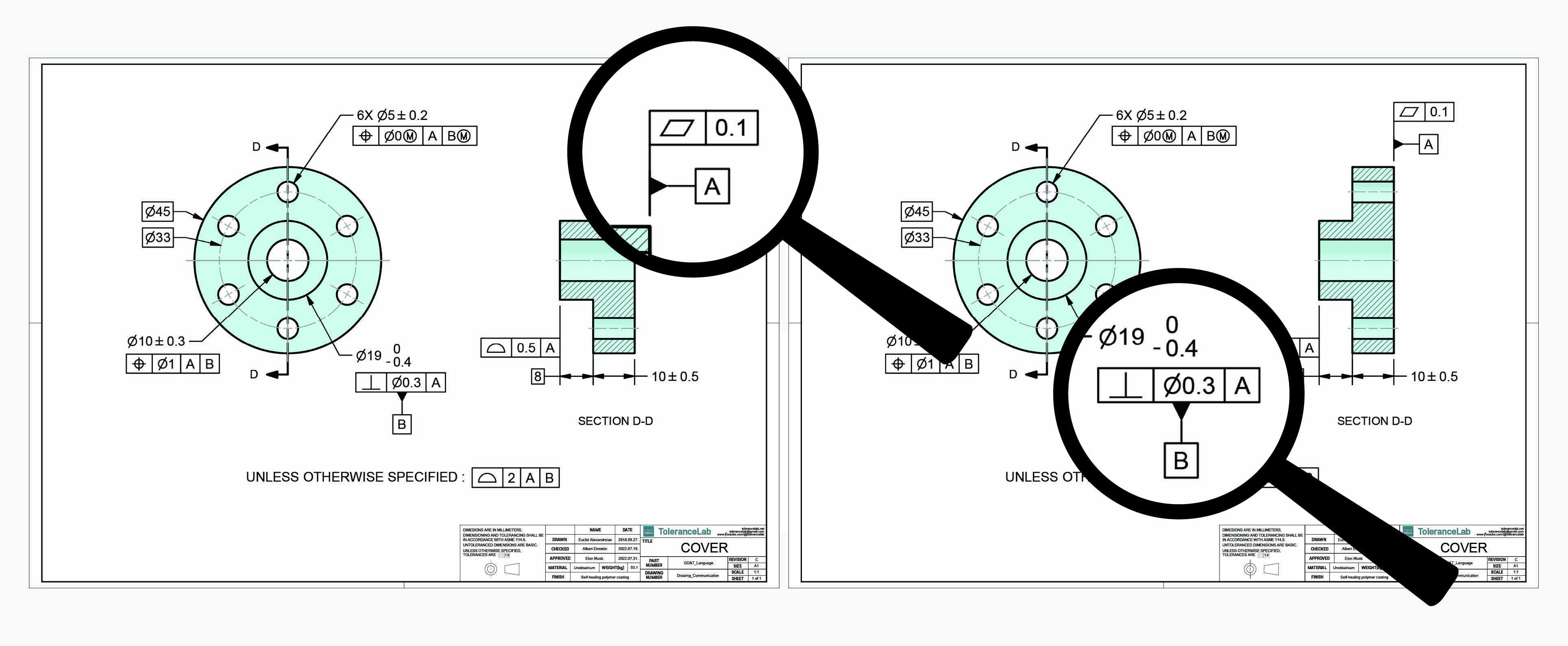 FCF를 읽은 다음에는 통제 기준으로 삼고 있는 데이텀 피쳐를 도면에서 찾는다. 동일한 문자로 식별된 데이텀 피쳐 심볼을 찾으면 된다. 데이텀 피쳐 심볼이 지시하고 있는 피쳐가 앞서 읽은 FCF가 지시한 피쳐를 통제할 때 기준으로 사용할 피쳐가 된다.