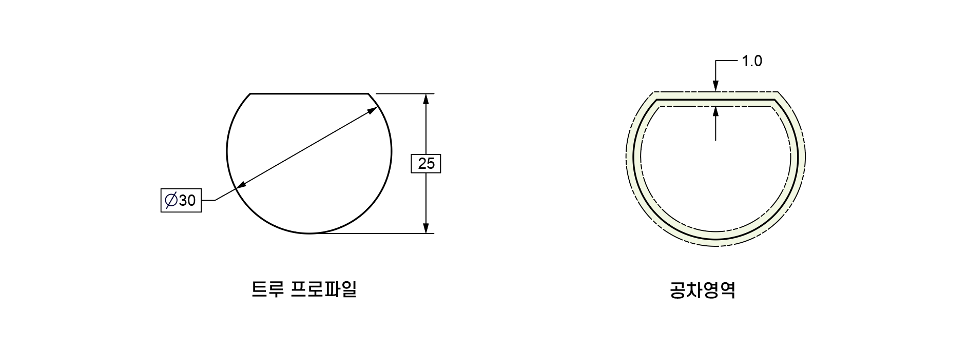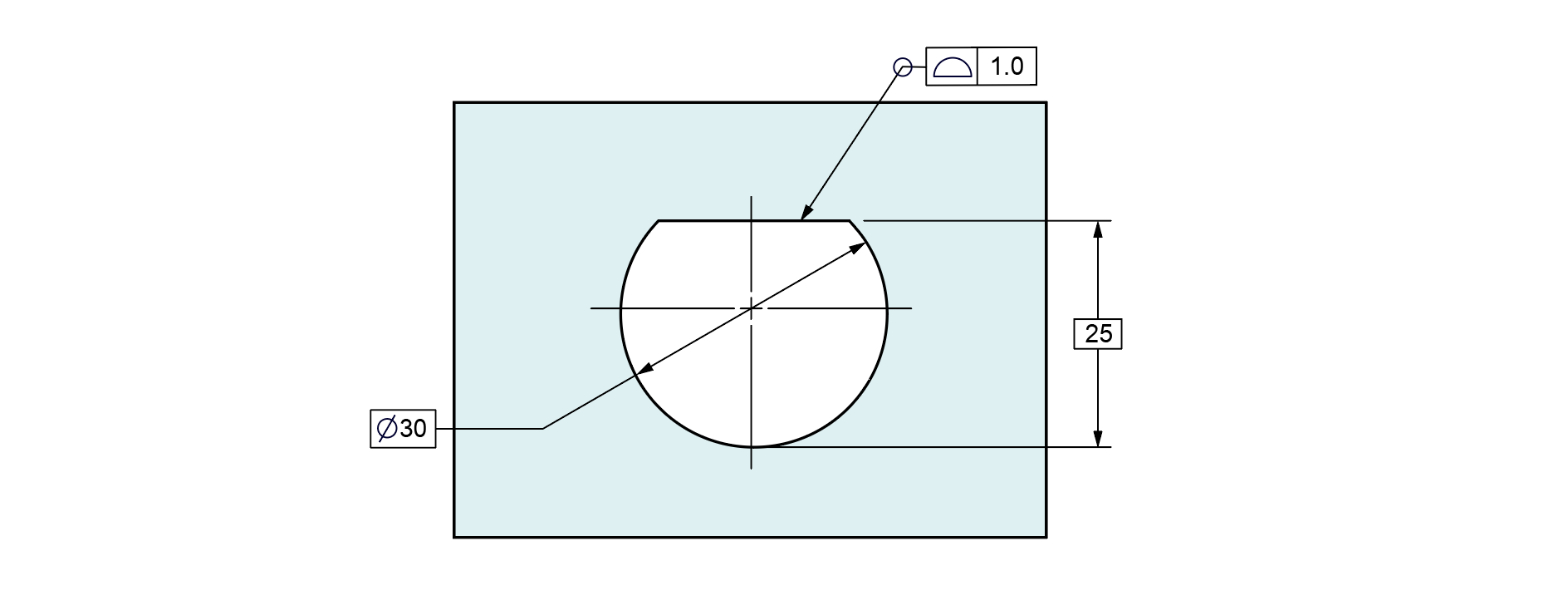 홀의 지름은 ∅30이고, 플랫면과 홀의 바닥과의 거리는 25이다. 이 치수는 베이직 치수로 정의한다. D형 홀의 형상은 베이직 치수로 정의되었다. 홀에는 윤곽공차가 1.0으로 적용되었다. 윤곽공차는 올어라운드 심볼로 윤곽공차의 적용범위가 정의되었다. 올어라운드 심볼에 의해 D형 홀 전체에 윤곽공차가 적용된다.