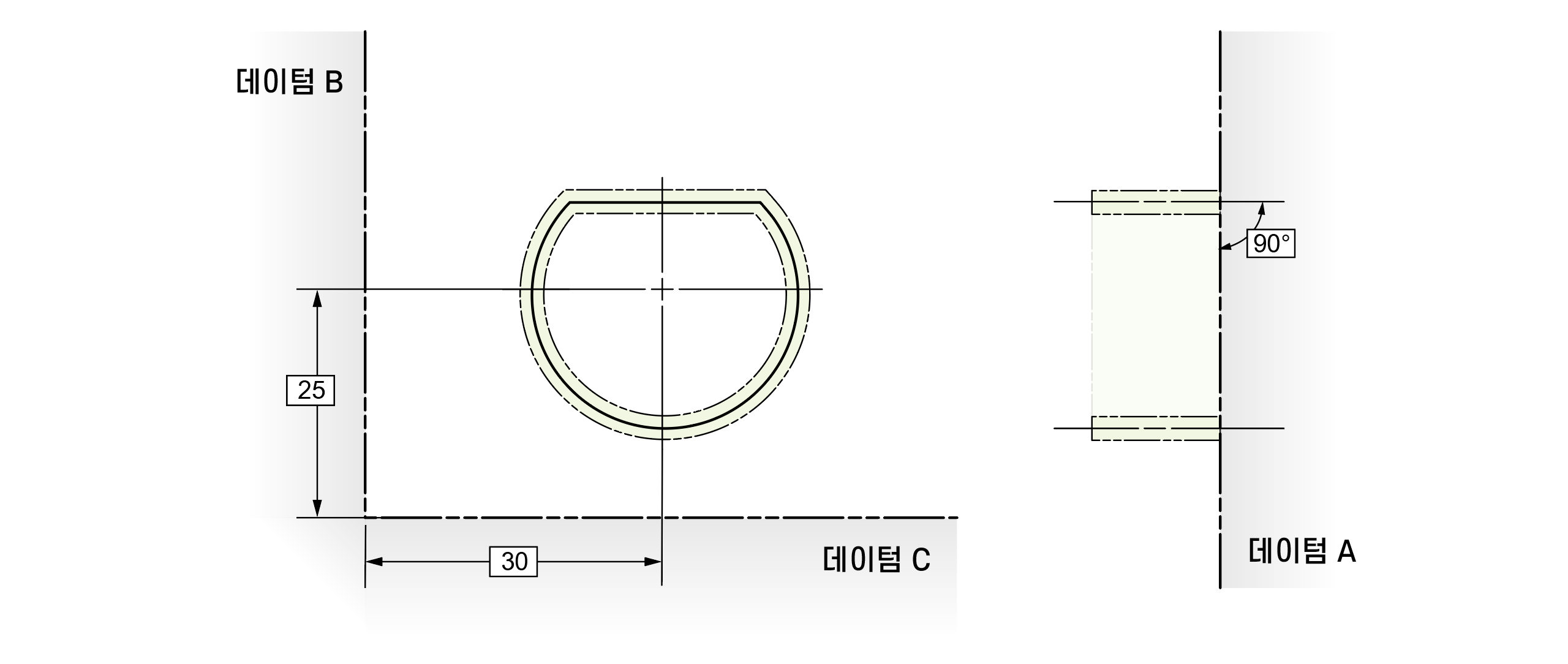 데이텀 피쳐를 참조하게 되면 트루 프로파일은 데이텀을 기준으로 고정된다. 따라서 트루 프로파일은 데이텀 A에 대해서는 90°만큼 기울어져 있고, 데이텀 B에 대해서는 30만큼 떨어져 있고, 데이텀 C에 대해서는 25만큼 떨어진 자세와 위치에 고정된다.