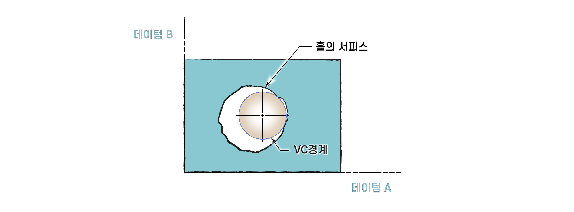 따라서 홀의 서피스가 VC 경계를 침범하지 않으면 홀의 위치공차에 의한 요구사항은 만족하게 된다.