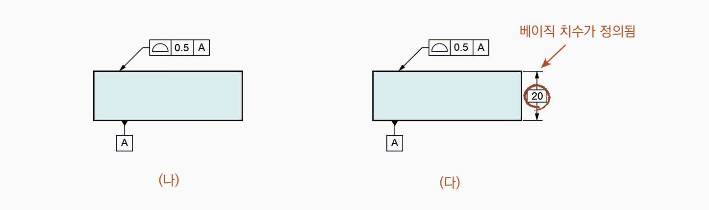 (다)는 베이직 치수로 프로파일의 위치를 정의하고 있다. 따라서 (다)의 공차영역이 데이텀 A로부터 20만큼 떨어진 곳에 생성된다.