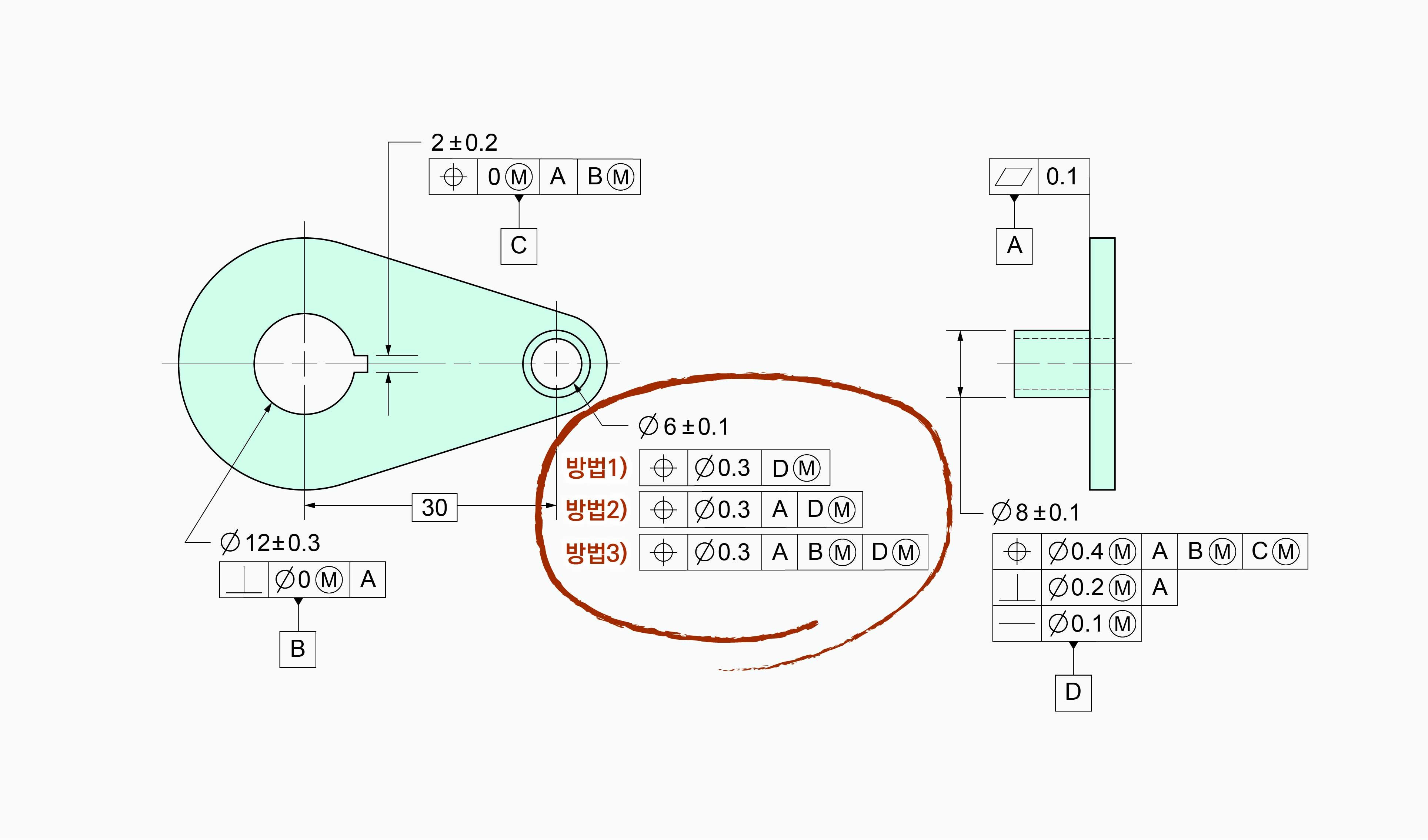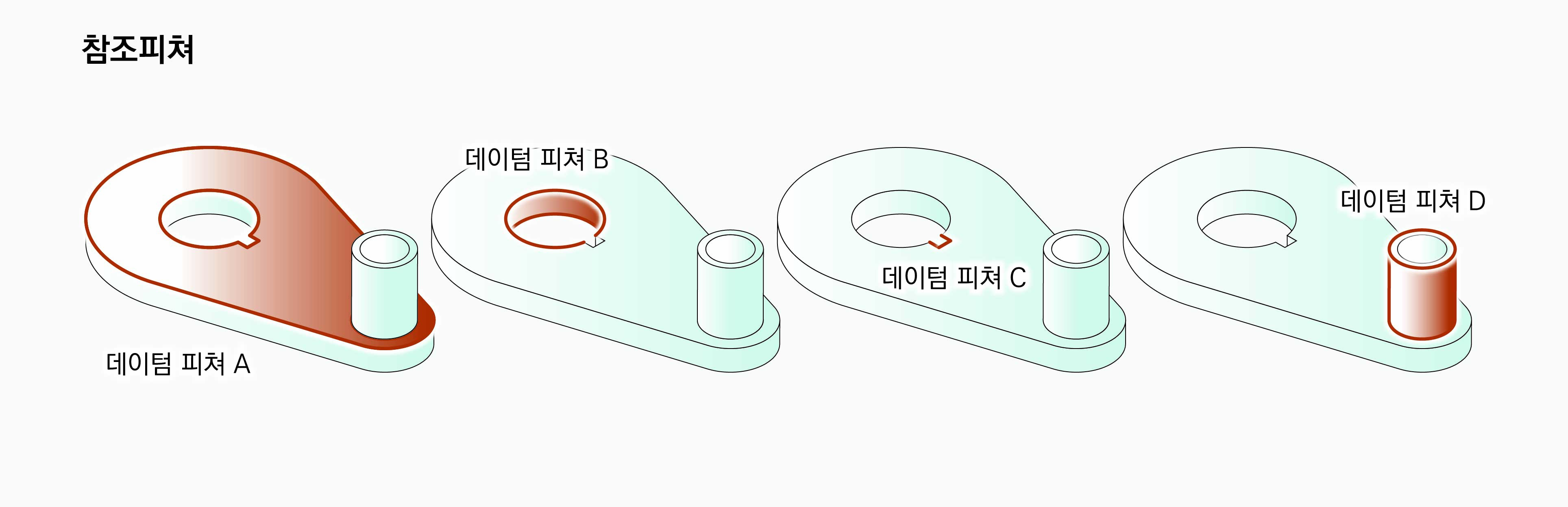 파트의 상면이 데이텀 피쳐 A, 키홀이 데이텀 피쳐 B, 키홈이 데이텀 피쳐 C이다. 이들을 참조하고 있는 왼쪽에 홀이 있는 보스가 데이텀 피쳐 D이다.