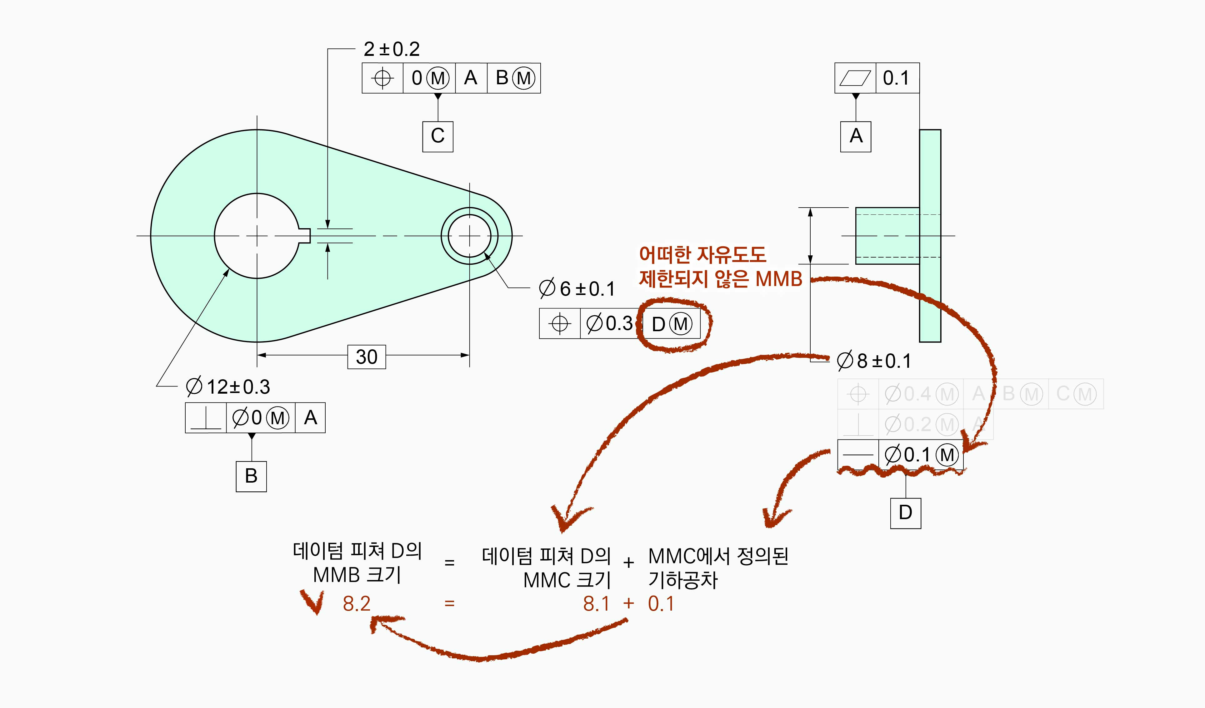 데이텀 피쳐 D는 진직공차로 통제되고 있고, 진직공차는 MMC에서 0.1로 정의되어 있다. 따라서 8.1에서 0.1을 더한 값인 8.2가 진직공차에 의한 데이텀 피쳐 D의 MMB 크기가 된다.