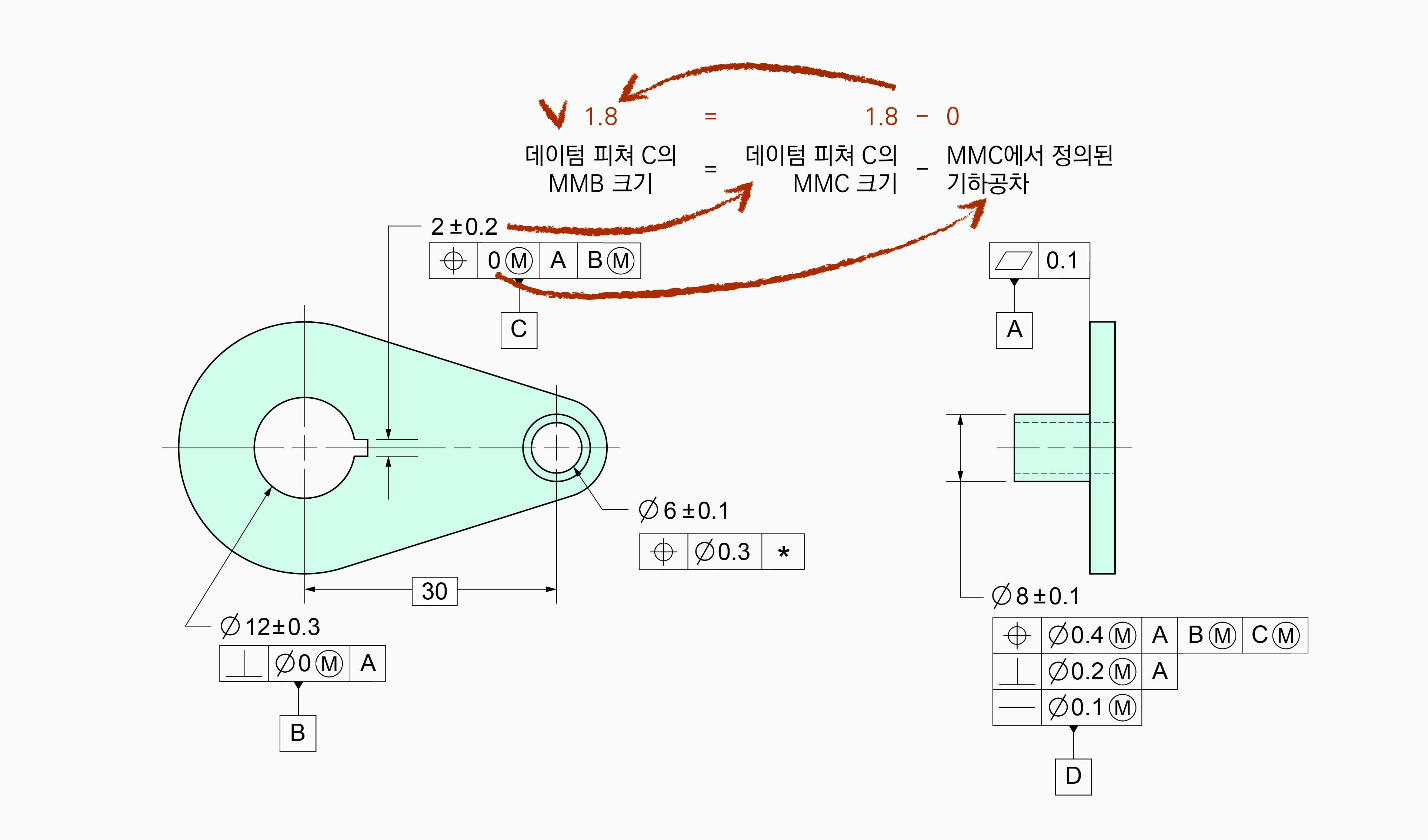 도면은 위와 같이 데이텀 피쳐 B의 MMB를 데이텀 피쳐로 참조하고 있다. 데이텀 피쳐 B의 MMB는 다음과 같이 계산할 수 있다.