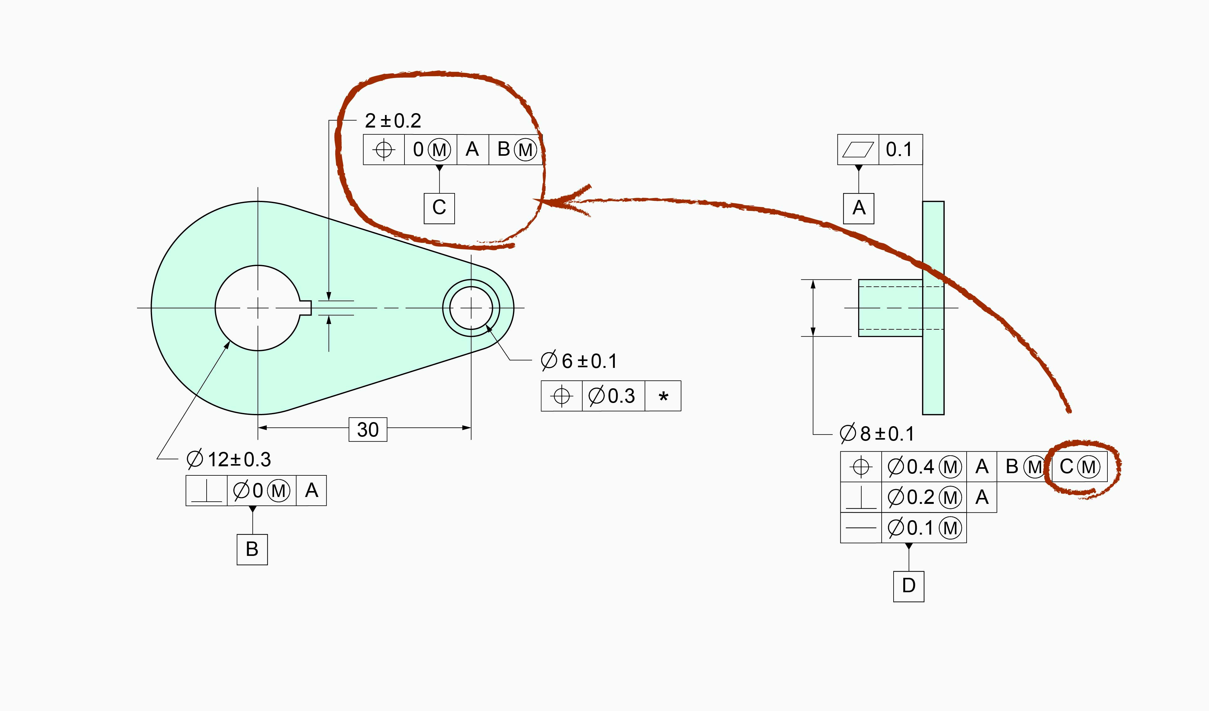 파트의 왼쪽에는 ∅12의 키홀과 너비가 2인 키홈이 있고, 파트의 오른쪽에는 ∅8 보스에 ∅6 홀이 있다. 통제하려는 피쳐를 제외한 나머지 피쳐는 모두 기하공차로 규제되어 있다.