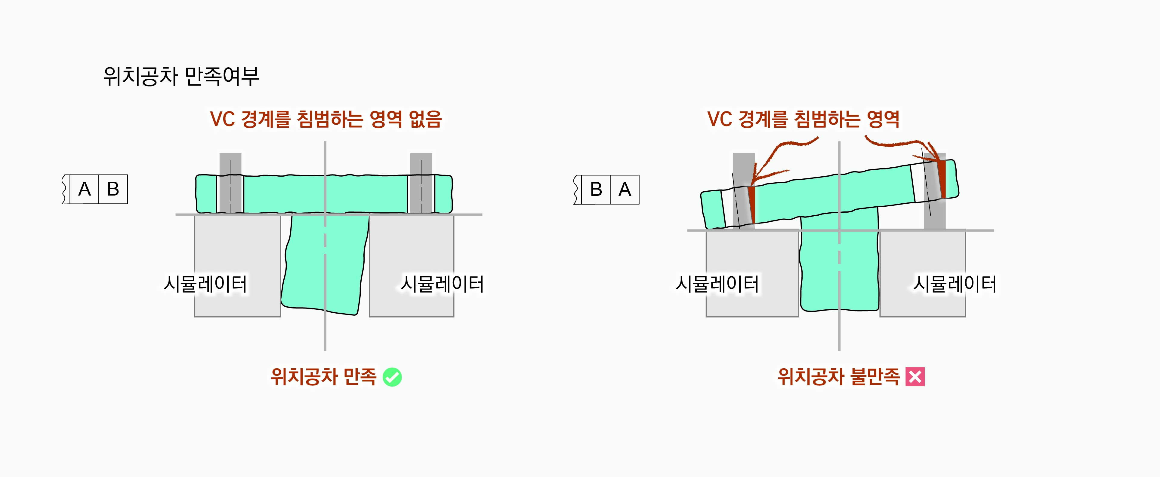 정의된 위치공차를 만족하기 위해서 홀은 VC경계를 침범하지 않아야 한다. 따라서 평판의 뒷면을 1차 데이텀 피쳐로 참조한 경우에는 위치공차를 만족하지 않지만 보스를 데이텀 피쳐로 참조한 경우에는 위의 그림과 같이 VC경계를 침범하는 영역이 있기 때문에 위치공차를 만족한다.