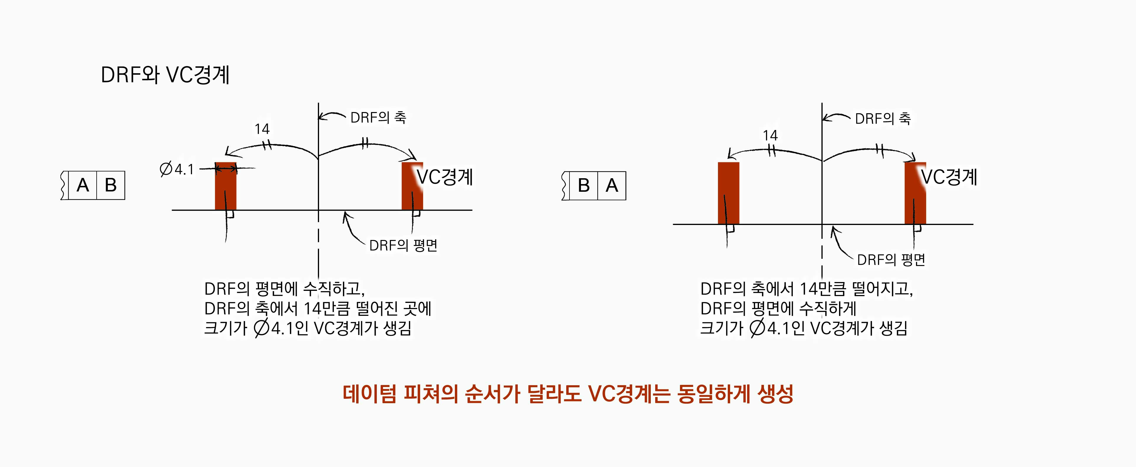 VC경계는 데이텀 평면 A에 수직하고, 데이텀 축에서 14만큼 떨어진 곳에 위치한다. VC경계의 크기는 통제피쳐인 홀의 MMC 크기로 정해진다. 따라서 위와 같은 경우의 VC경계의 크기는 ∅4.1이다. |A|B|인 경우와 |B|A|인 경우 DRF가 동일하기 때문에 VC경계는 결과적으로 동일하게 생성된다. 데이텀 피쳐의 순서를 다르게 했을 때 차이는 실제 파트의 편차때문에 발생하고, 실제 파트를 DRF에 연관시킬 때 발생한다.
