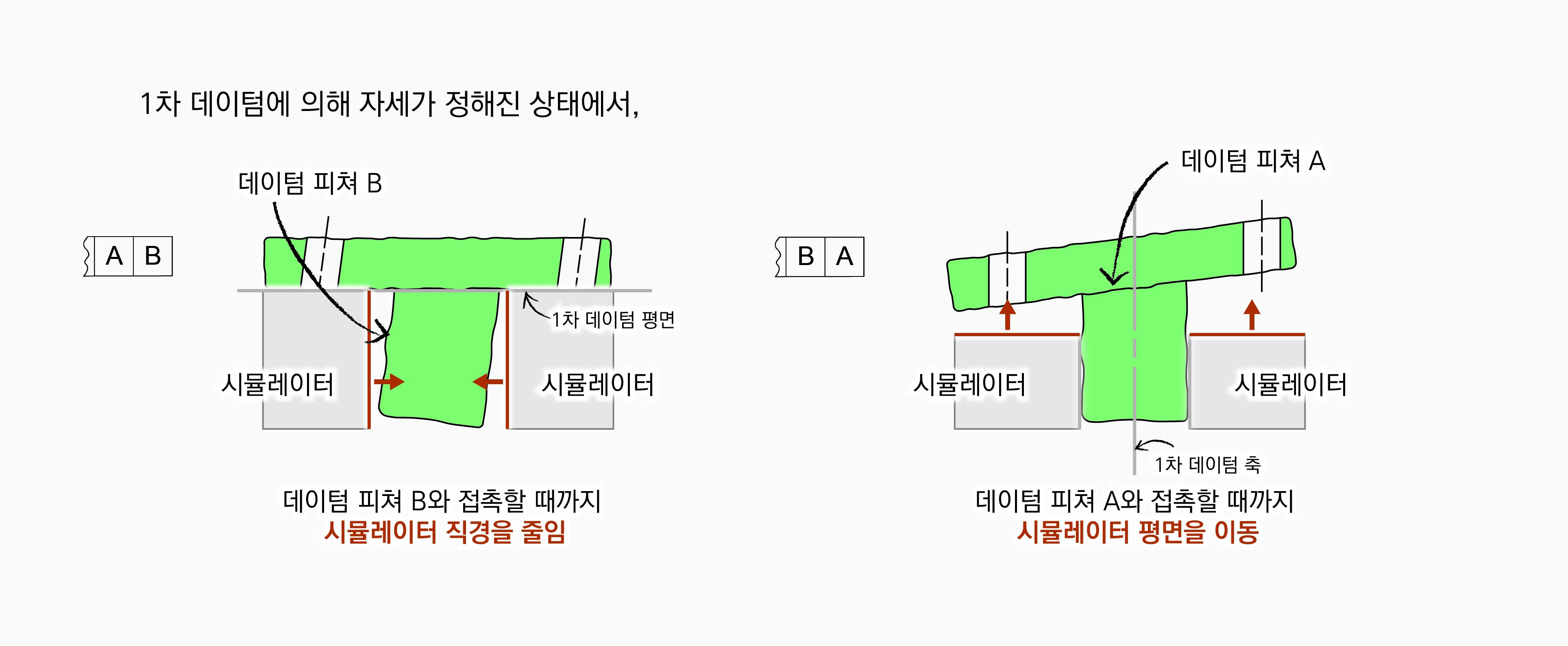 데이텀 피쳐와 시뮬레이터가 접촉하면, 두 파트의 자세가 서로 달라진다. 데이텀 피쳐 A의 모양편차에 따라 실제 자세가 약간 달라질 수 있겠지만 모양편차는 무시한다. |A|B|의 경우 시뮬레이터 평면에 안착하면서 데이텀 피쳐와 시뮬레이터가 접촉하게 된다. 파트는 자세가 달라지지 않는다. 이와 달리 |B|A|의 경우는 데이텀 피쳐 B의 자세편차 때문에 데이텀 피쳐와 시뮬레이터가 접촉할 때까지 시뮬레이터 직경을 줄이면, 파트가 회전하면서 데이텀 피쳐와 시뮬레이터가 접촉하게 된다. 결과적으로 파트의 자세는 달라진다.