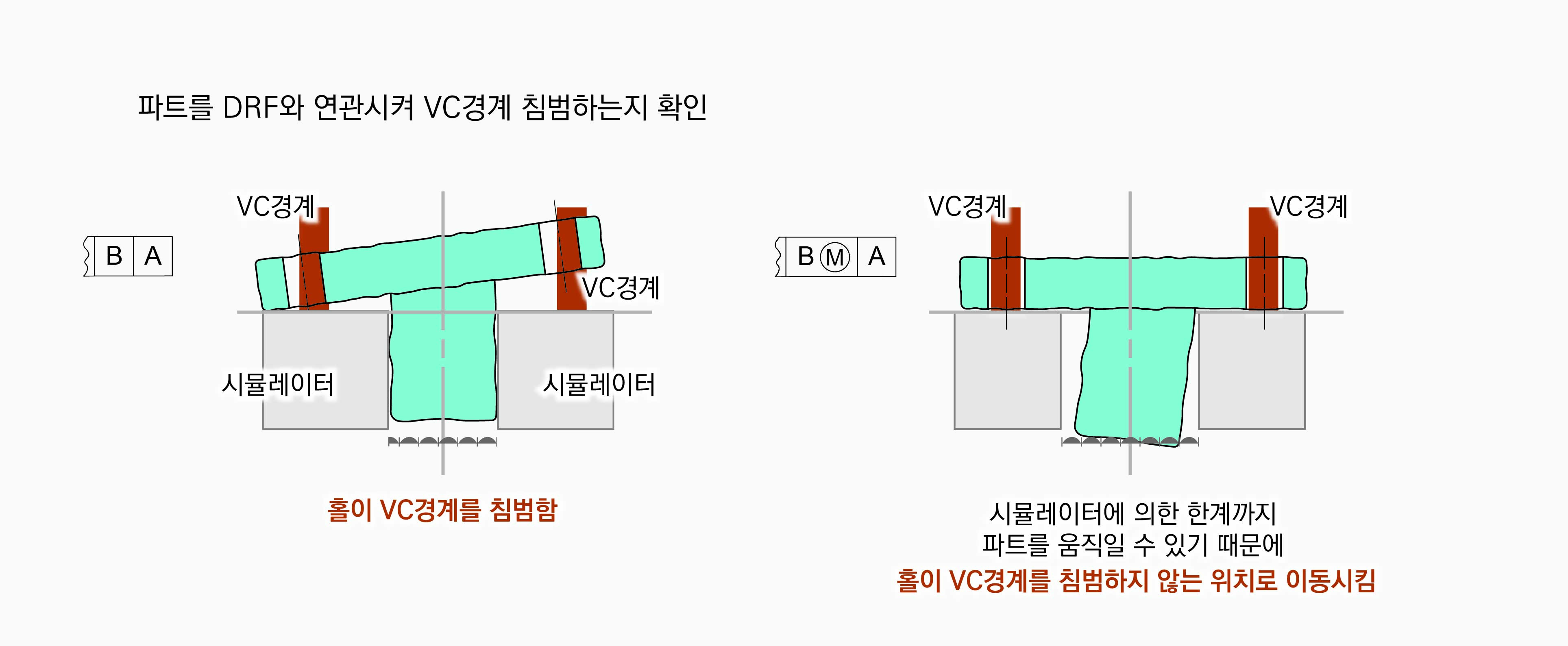 정의된 위치공차를 만족하기 위해서 홀은 VC경계를 침범하지 않아야 한다. 따라서 파트를 움직일 수 없는 |B|A|의 경우는 정해진 위치에 있는 VC경계를 침범하기 때문에 위치공차를 만족하지 않지만, |BⓂ︎|A|의 경우는 파트를 움직여서 VC경계를 침범하지 않는 위치를 찾을 수 있다면 위치공차를 만족할 수 있게 된다.