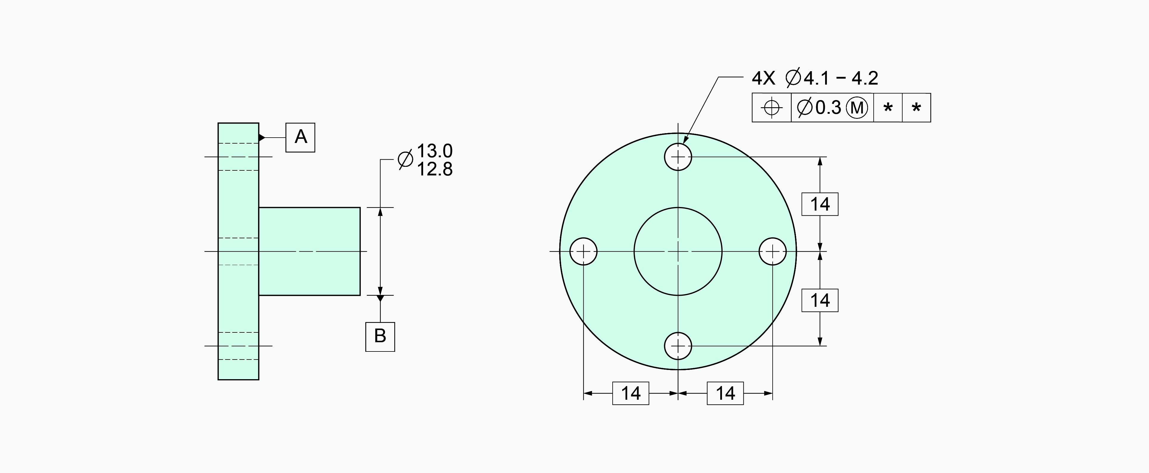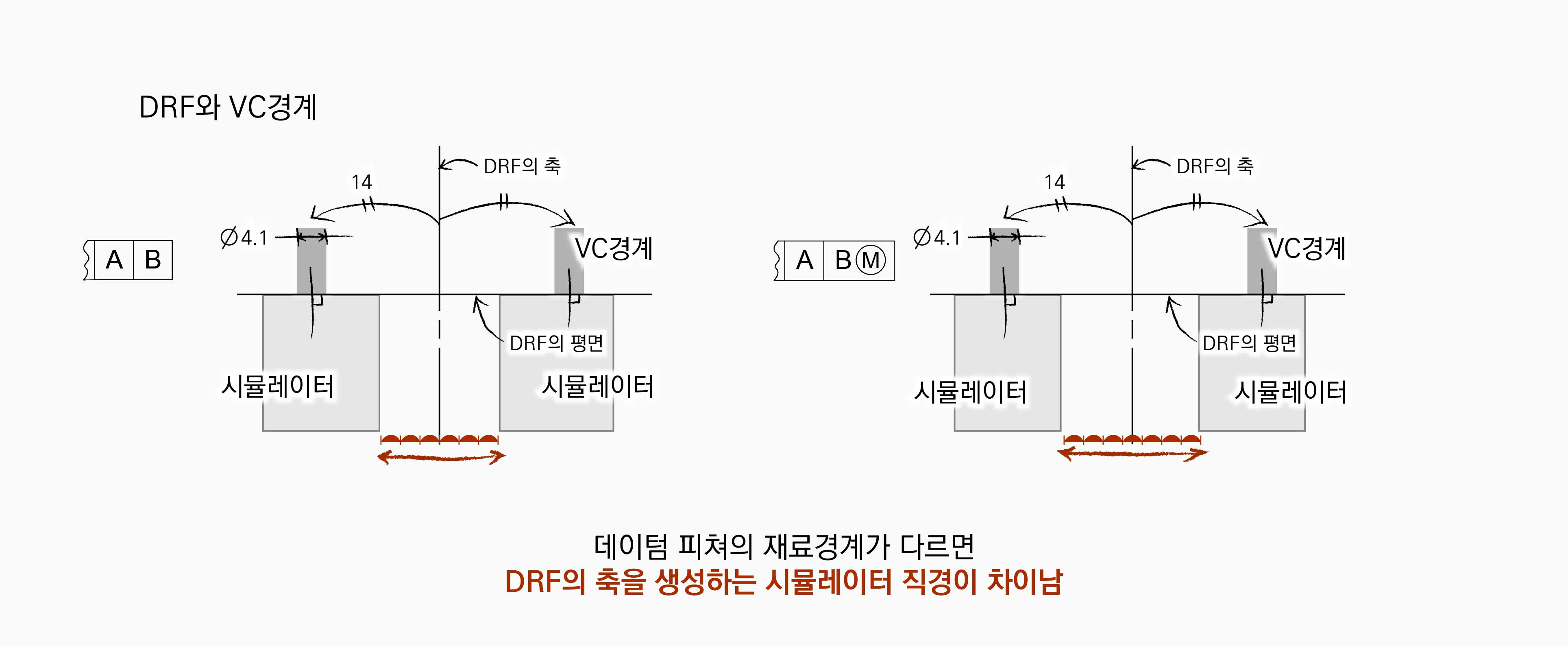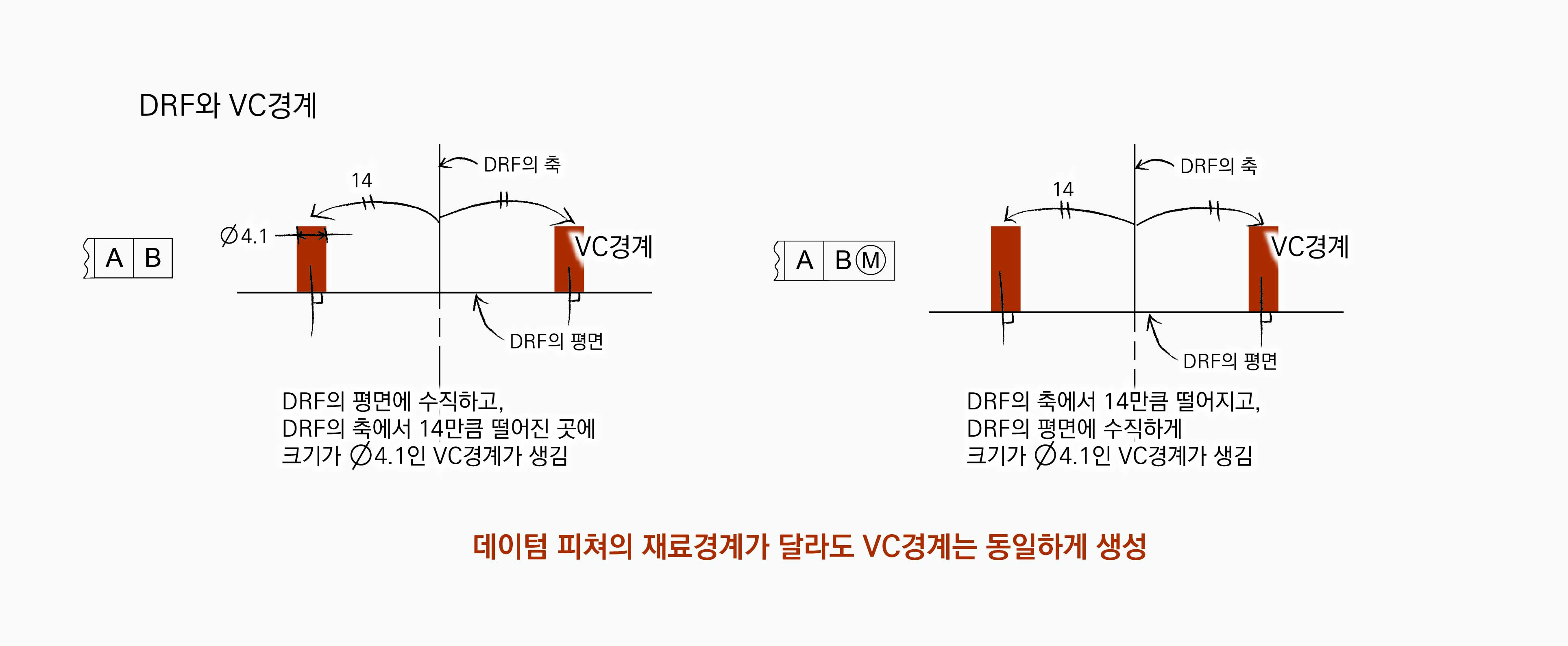 VC경계는 데이텀 평면 A에 수직하고, 데이텀 축에서 14만큼 떨어진 곳에 위치한다. VC경계의 크기는 통제피쳐인 홀의 MMC 크기로 정해진다. 따라서 위와 같은 경우의 VC경계의 크기는 ∅4.1이다. |A|B|인 경우와 |A|BⓂ︎|인 경우 DRF가 동일하기 때문에 VC경계는 결과적으로 동일하게 생성된다. 데이텀 피쳐의 재료경계를 다르게 참조했을 때 차이는 실제 파트의 편차 때문에 발생하고, 실제 파트를 DRF에 연관시킬 때 발생한다.
