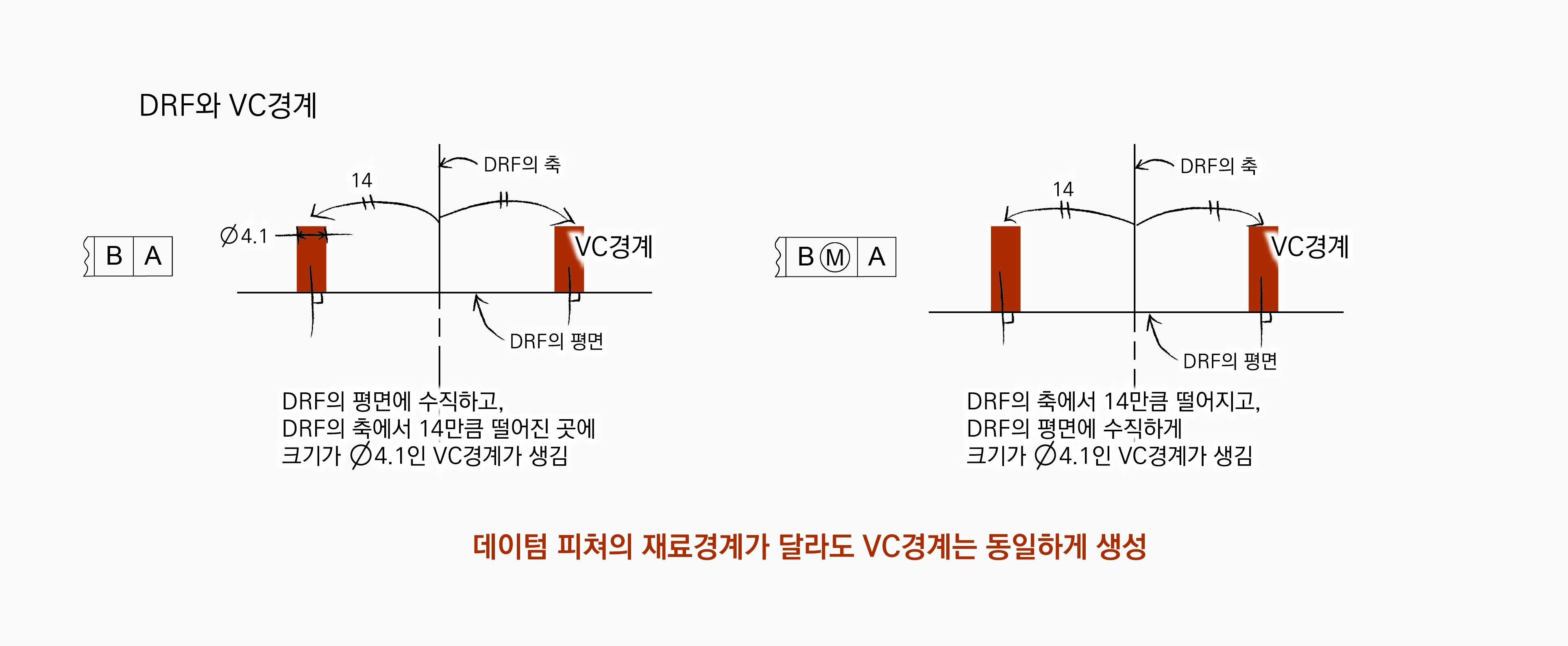 VC경계는 데이텀 평면 A에 수직하고, 데이텀 축에서 14만큼 떨어진 곳에 위치한다. VC경계의 크기는 통제피쳐인 홀의 MMC 크기로 정해진다. 따라서 위와 같은 경우의 VC경계의 크기는 ∅4.1이다. |B|A|인 경우와 |BⓂ︎|A|인 경우 DRF가 동일하기 때문에 VC경계는 결과적으로 동일하게 생성된다. 데이텀 피쳐의 재료경계를 다르게 참조했을 때 차이는 실제 파트의 편차 때문에 발생하고, 실제 파트를 DRF에 연관시킬 때 발생한다.