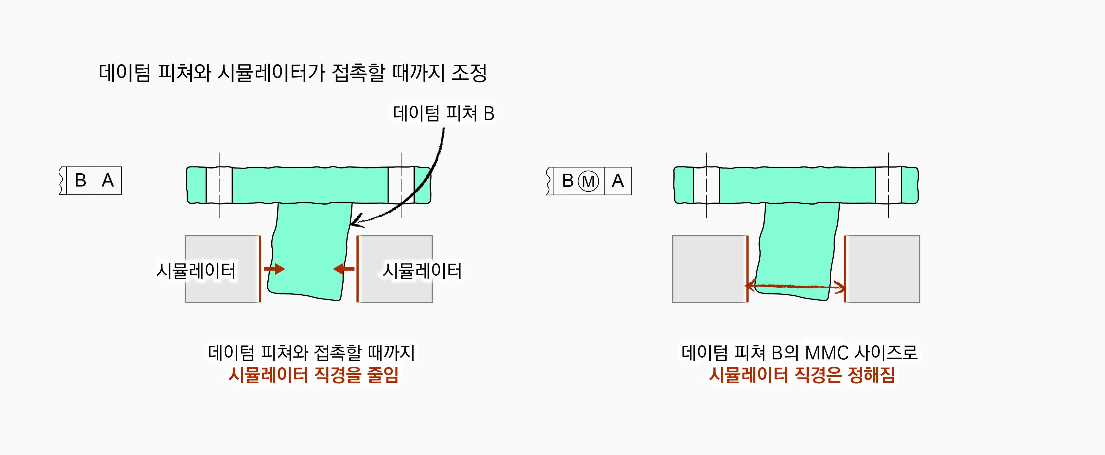 두 경우 모두 1차 데이텀 피쳐는 데이텀 피쳐 B로 원통 서피스이다. 따라서 데이텀 피쳐 B의 시뮬레이터는 원통 서피스의 역형상인 원통서피스가 된다. 하지만 |B|A|의 경우는 데이텀 피쳐와 접촉할 때까지 시뮬레이터 직경을 줄이는 반면, |BⓂ︎|A|의 경우는 시뮬레이터 직경의 크기가 데이텀 피쳐 B의 MMC 사이즈로 정해진다.