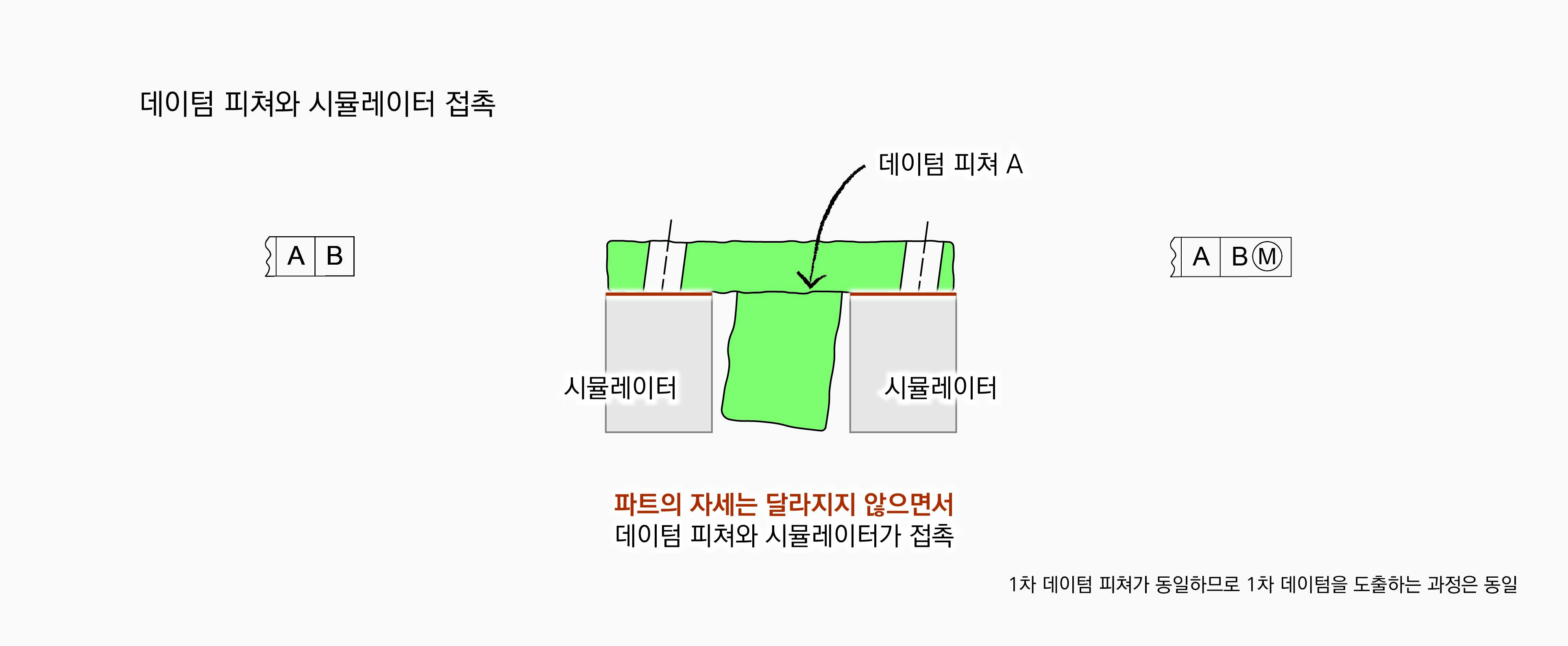 데이텀 피쳐 A의 모양편차에 따라 실제 자세가 약간 달라질 수 있겠지만 모양편차는 무시한다. 데이텀 피쳐와 시뮬레이터가 접촉하면, 시뮬레이터 평면에 데이텀 피쳐가 안착하게 된다. 두 경우에 파트 자세는 다르지 않다.