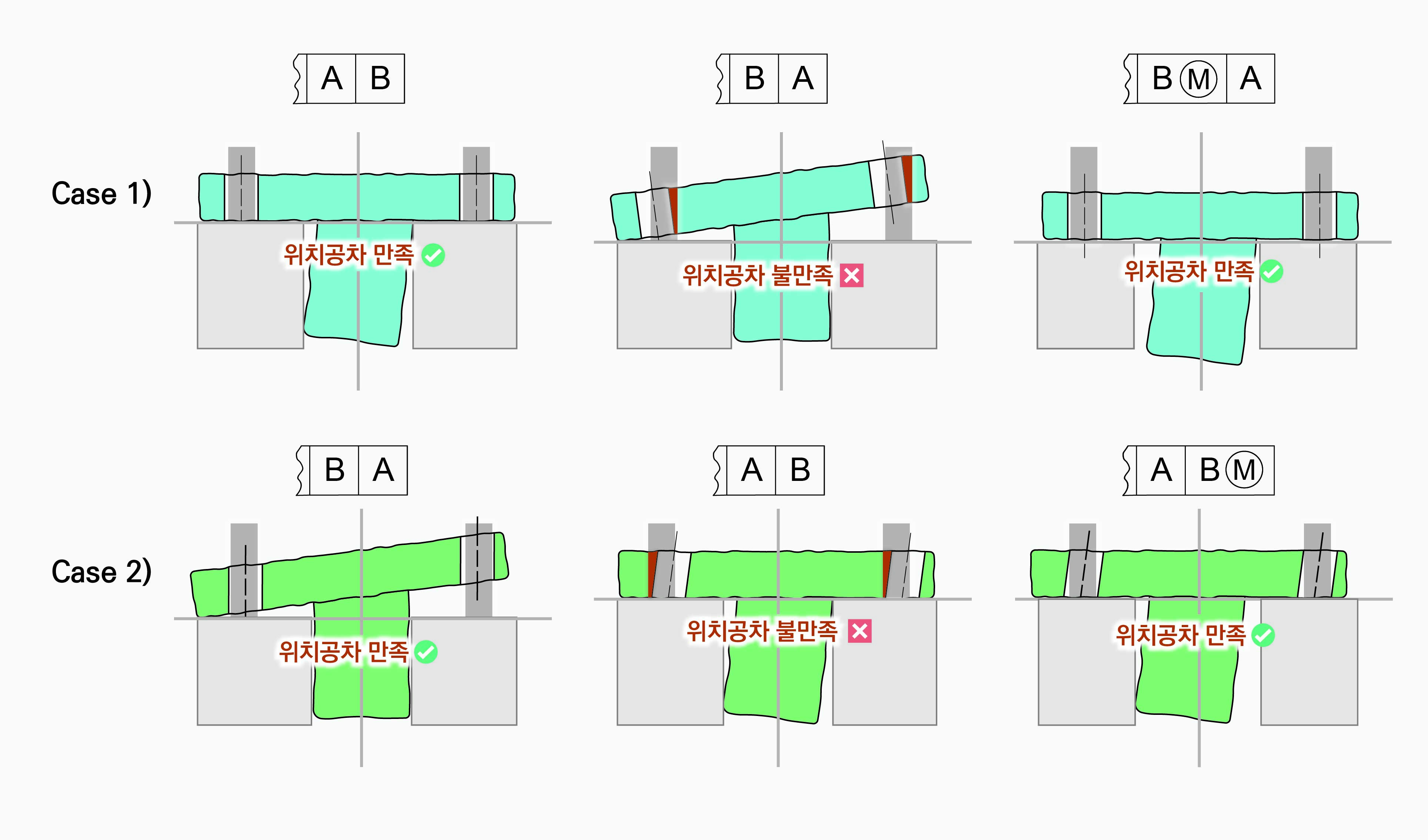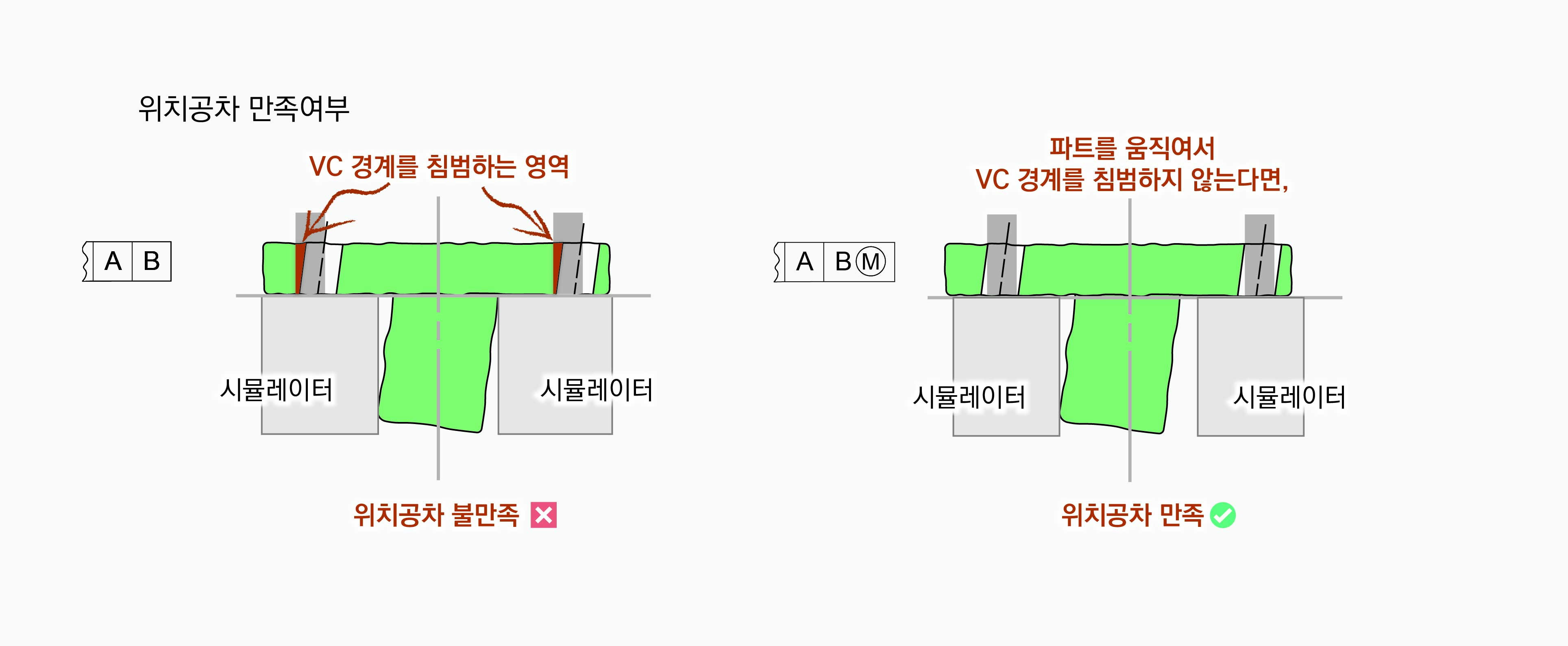 정의된 위치공차를 만족하기 위해서 홀은 VC경계를 침범하지 않아야 한다. 따라서 파트를 움직일 수 없는 |A|B|의 경우는 정해진 위치에 있는 VC경계를 침범하기 때문에 위치공차를 만족하지 않지만, |A|BⓂ︎|의 경우는 파트를 움직여서 VC경계를 침범하지 않는 위치를 찾을 수 있다면 위치공차를 만족할 수 있게 된다.
