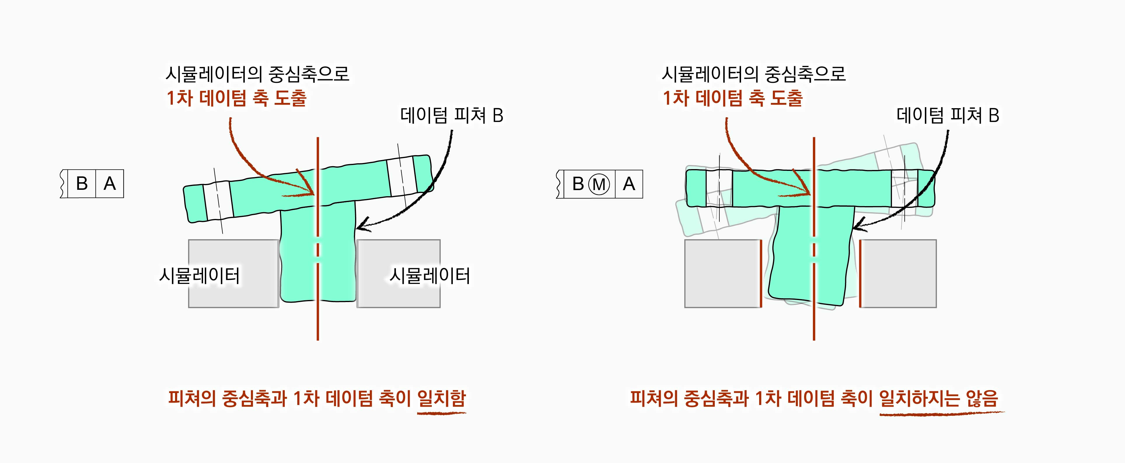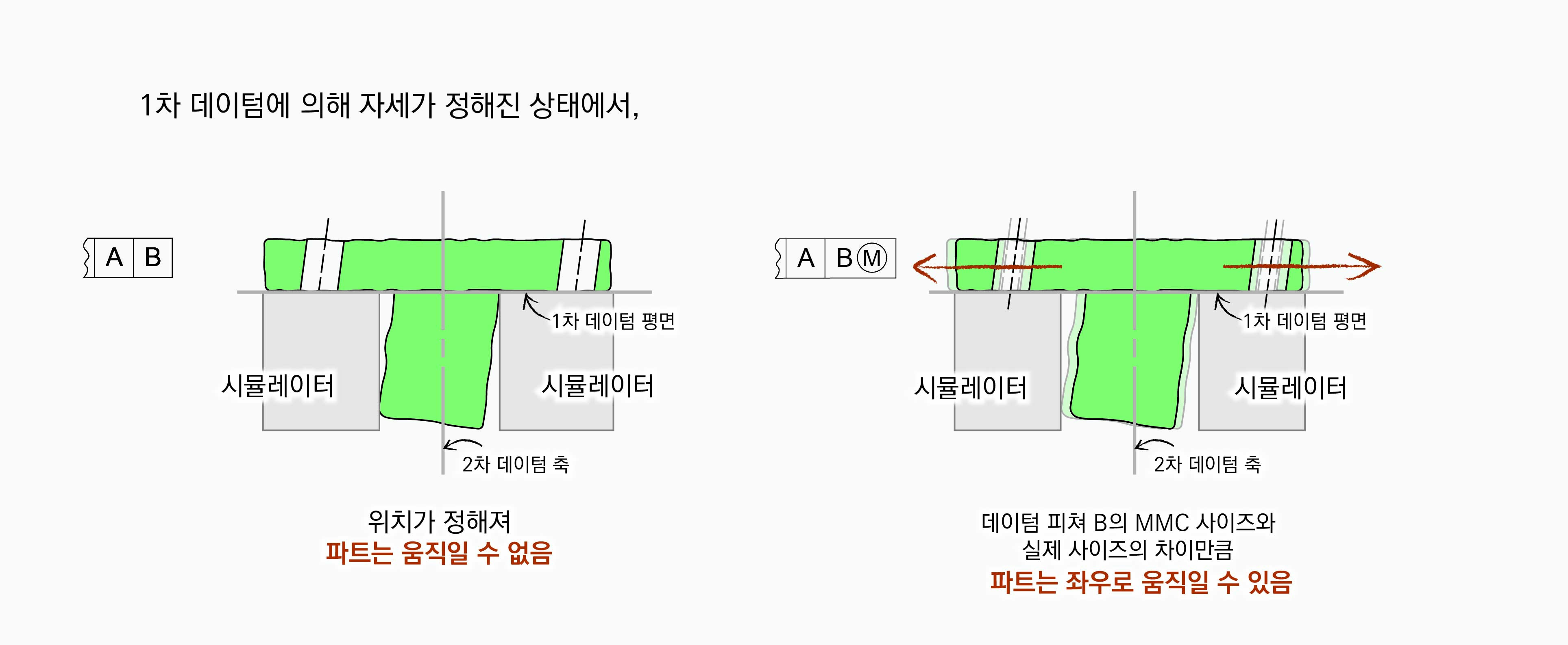 2차 데이텀 축은 시뮬레이터의 중심축으로 도출된다. |A|B|의 경우에 파트와 시뮬레이터의 접촉에 의해 실제 피쳐인 보스의 중심축 위치가 정해지는 반면에, |A|BⓂ︎|의 경우는 파트와 시뮬레이터가 서로 접촉하지 않을 수 있고, 접촉하지 않으면 유격이 있을 수 있다. 파트는 그 유격 범위안에서 움직일 수 있기 때문에 실제 피쳐인 보스의 줌심축 위치가 정해지지 않는다.