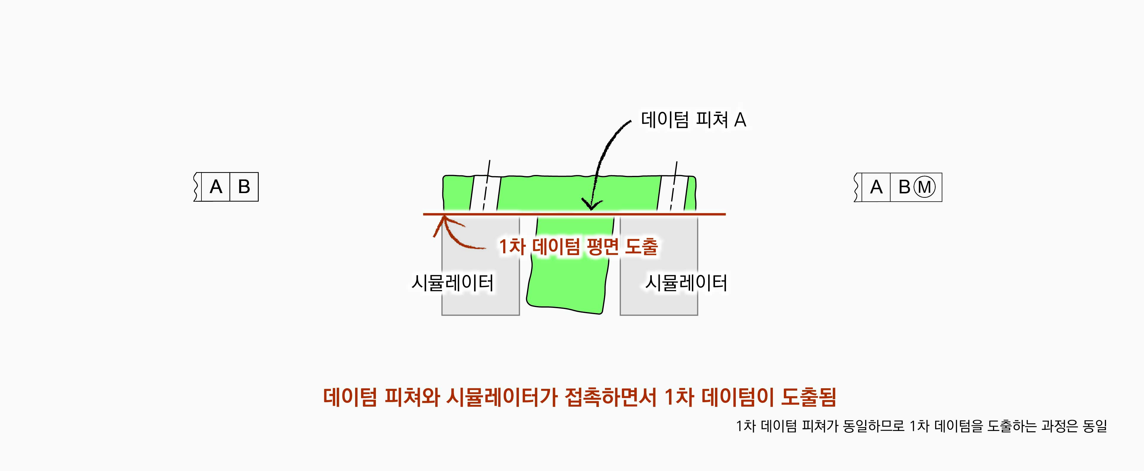 1차 데이텀에 의해 자세가 정해진 상태에서 |A|B|의 경우는 데이텀 피쳐와 접촉할 때까지 시뮬레이터 직경을 줄이는 반면,