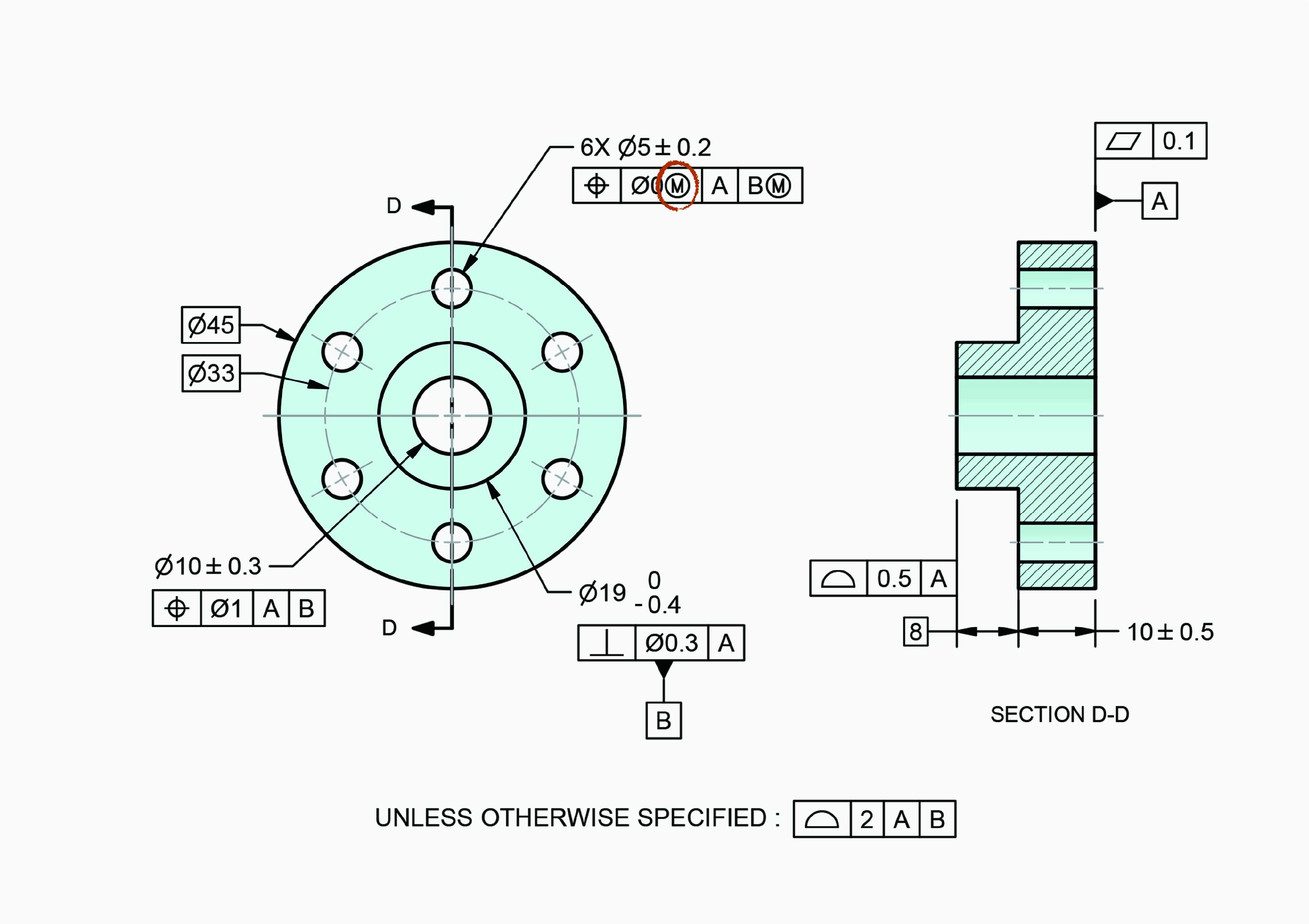 위 그림의 파트에서 ∅5 패턴홀은 위치공차 ∅0Ⓜ︎으로 정의되어 있다. 공차값 다음에 위치한 심볼 Ⓜ︎을 MMC 심볼이라고 부른다. (데이텀 피쳐 문자 다음에 위치한 심볼 Ⓜ︎은 MMC 심볼과 같은 심볼이지만 MMB 심볼이라고 부른다.) 위치공차 ∅0는 ∅5 패턴홀이 MMC 상태일 때 요구되는 위치공차이다. ∅5 패턴홀이 MMC 상태일 때, 즉 ∅4.8일 때는 위치공차 ∅0를 만족해야 한다. ∅5 패턴홀은 ∅4.8에서 ∅5.2 사이에서 제작될 수 있다. 위치공차 ∅0은 홀이 MMC 상태일 때, 즉, 홀 사이즈가 ∅4.8일 때 만족하면 되고, 홀이 MMC 상태가 아닐 때, 즉, 홀 사이즈가 ∅4.8보다 커지면 허용할 수 있는 위치편차는 아래 그림과 같이 달라진다. 홀 사이즈가 ∅4.8보다 커지면, 커지는 만큼 위치편차가 더 허용된다.