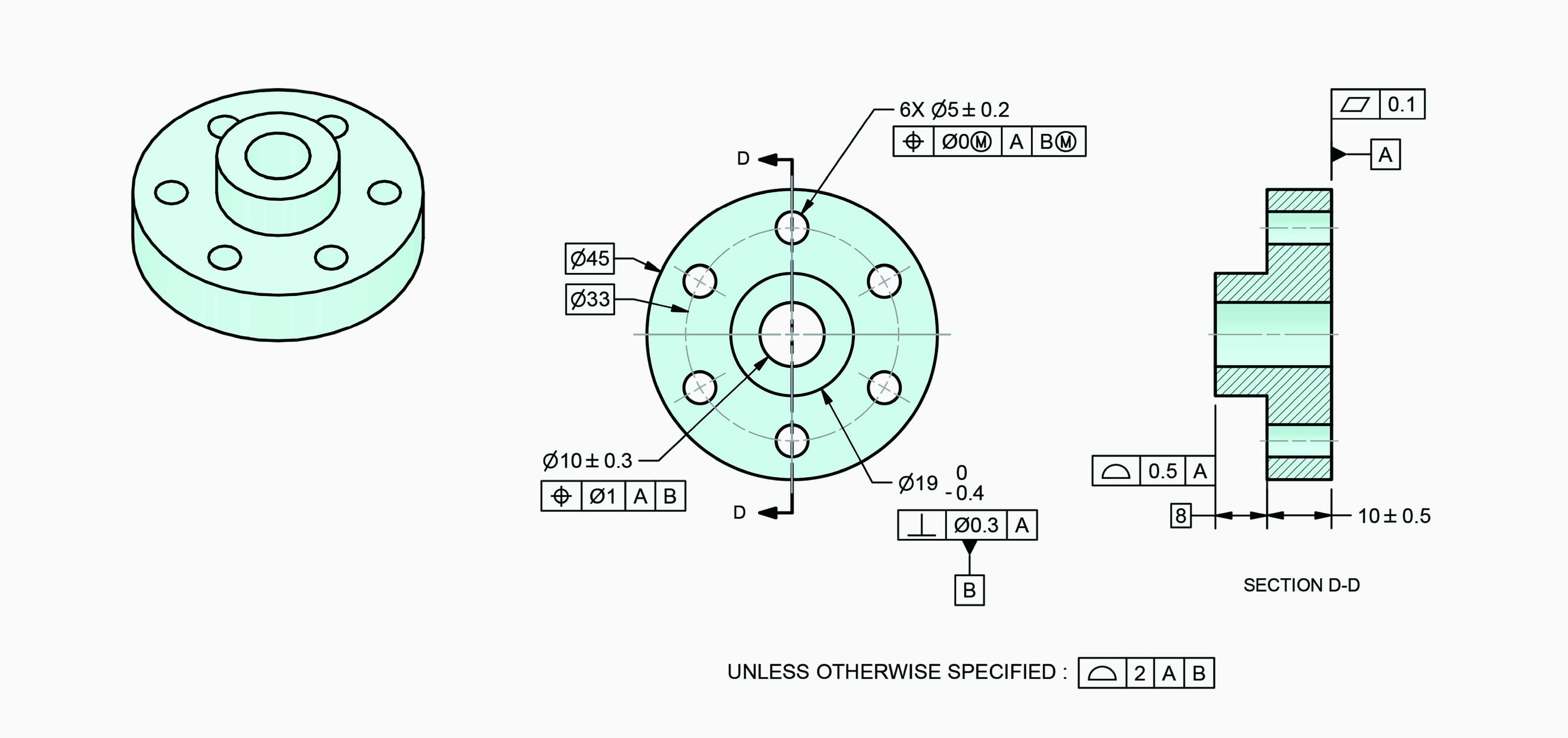 위 그림의 파트는 ∅33원 위에 ∅5 패턴홀이 6개 있다. ∅5홀의 공차는 ±0.2로 정의되어 있다. 따라서 이 홀은 ∅4.8에서 ∅5.2사이에서 제작되어야 한다. 홀의 하한은 ∅4.8이고, 상한은 ∅5.2이다. 홀은 내피쳐이기 때문에 하한일 때 즉, 가장 작을 때 재료가 가장 많다. 따라서 ∅4.8일 때 재료가 최대 상태가 된다. 다르게 말하면, ∅4.8일 때 MMC 상태가 되고, ∅4.8가 MMC 사이즈가 된다. 그리고 반대인 상한일 때 즉, 가장 클 때 재료가 가장 적다. 따라서 ∅5.2일 때 재료가 최소 상태가 된다. 다르게 말하면, ∅5.2일 때 LMC 상태가 되고, ∅5.2가 LMC 사이즈가 된다.
