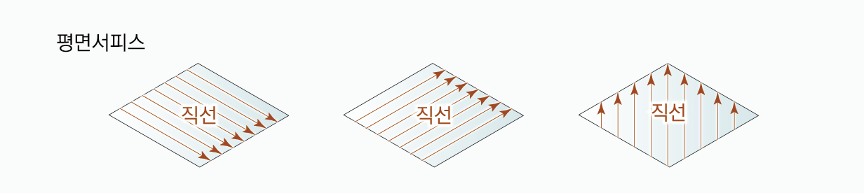 서피스는 결국 면의 형태이기 때문에 직선, 곡선, 원이 연속적으로 모여서 면을 구성하게 된다. 직선이 모이면 평면이 되고, 곡선이 모이면 곡면이 된다. 원이 모이면 원통면이 된다. 이러한 기하학적 특징을 가지는 서피스를 평면서피스, 곡면서피스, 원통서피스라고 한다. 평면과 평면서피스를 구분할 수 있어야 한다. 평면은 기하학적으로 완전하게 평평한 면을 말한다. 반면 평면서피스는 실제 부품의 서피스를 말하는 것이기 때문에 실제로 기하학적으로 완전하게 평평한 면은 아니다. 평면이 의도되지만 실제로 평면인 서피스는 존재하지 않는다.