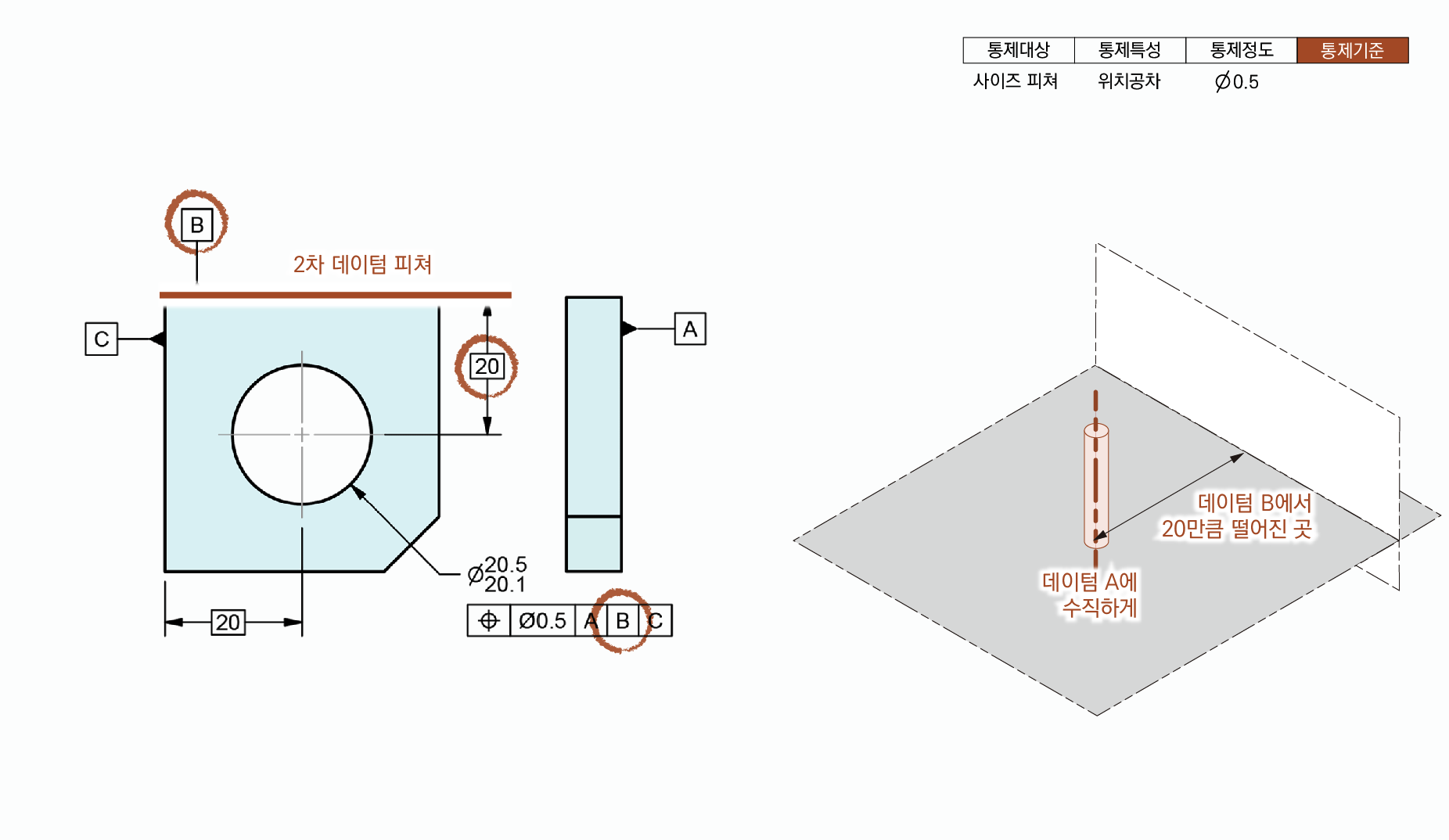 위 그림의 FCF는 사이즈 치수 아래 FCF가 표기되어 있다. 이는 사이즈 피쳐를 통제할 때 도면에 표현하는 방법이다. 따라서 이 FCF는 ∅20.5-20.1인 원통 사이즈 피쳐를 통제한다. 원통형 사이즈 피쳐이기 때문에 피쳐의 중심축이 통제요소가 된다. 이 사이즈 피쳐의 사이즈와 모양은 사이즈 공차와 Rule #1에 의해 통제된다.