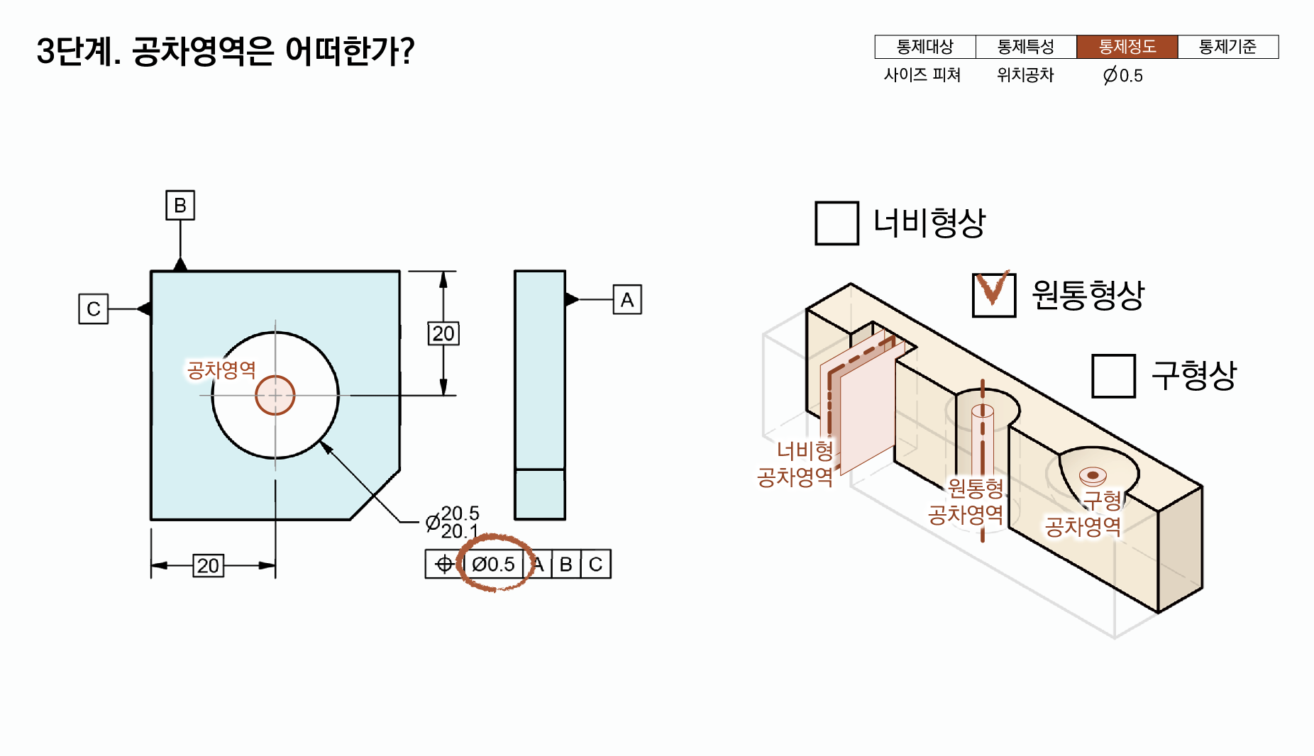 그 다음으로 어느 정도로 통제해야 하는지 확인한다. 이는 공차영역으로 통제정도를 전달한다. 공차영역의 형상은 무엇이고, 공차영역의 크기는 무엇인가? 이 피쳐의 중심축은 FCF에 정의한 공차영역 안에 있어야 한다.