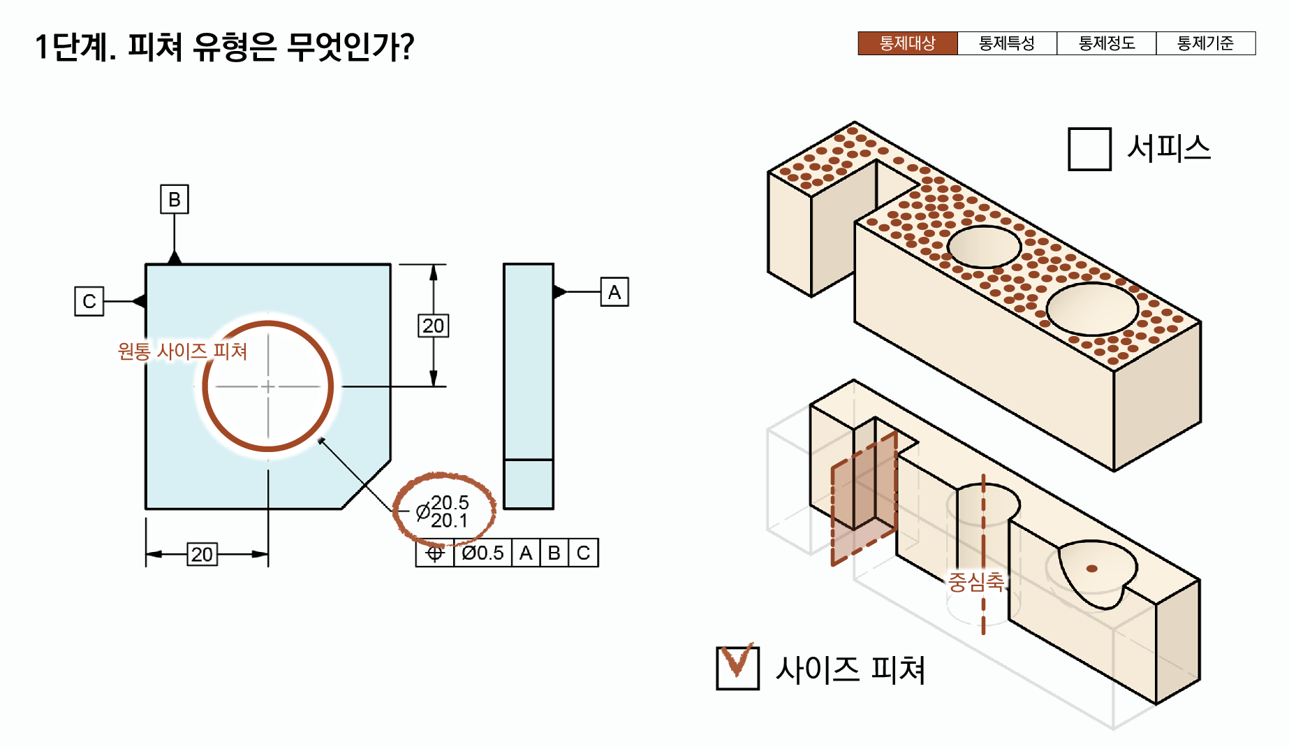 가장 먼저 확인해야 할 것은 무엇을 통제하는지 확인하는 것이다. 이 FCF가 서피스를 통제하는지 사이즈 피쳐를 통제하는지 확인한다. 서피스를 통제하는지 사이즈 피쳐를 통제하는지는 FCF가 도면에 어떻게 표현되었느냐에 따라 달라진다. 서피스를 통제하는 경우에는 서피스의 표면요소를 통제하고, 사이즈 피쳐를 통제하는 경우에는 사이즈 피쳐의 중심요소를 통제한다. 그리고 사이즈 피쳐는 사이즈 피쳐 종류에 따라 통제하는 중심요소가 달라진다. 너비형 사이즈 피쳐라면 중심평면을 원통형 사이즈 피쳐라면 중심축을 구형 사이즈 피쳐라면 중심점을 통제한다. 무엇을 통제하느냐에 따라 통제요소가 달라지기 때문에 무엇을 통제하는지 확실히 확인할 수 있어야 한다.