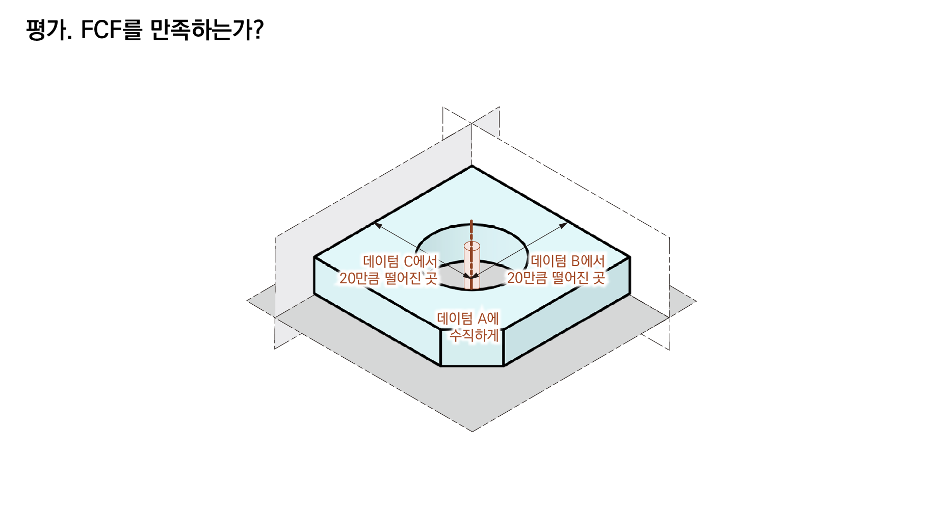마지막으로 정의한 FCF에 만족하는지 확인해야 한다. 공차영역은 데이텀 A에 수직하고, 데이텀 B에서 20만큼 떨어지고, 데이텀 C에서 20만큼 떨어진 곳에 위치한다. 데이텀 A, B, C는 모두 데이텀 피쳐 A, B, C에 의해 생성된다. 데이텀이 가상적인 요소가 되면서 데이텀 피쳐와 별개인 것처럼 느껴질 수 있지만, 그렇지 않다. 데이텀 A, B, C는 모두 데이텀 피쳐 A, B, C가 있어야만 생성되는 것이다. 가상적인 요소로 부터 홀의 위치편차를 검사하는 것 같지만, 위치편차를 검사하는 것은 실제로 부품 내에서 피쳐 사이의 관계를 검사하는 것이다.
