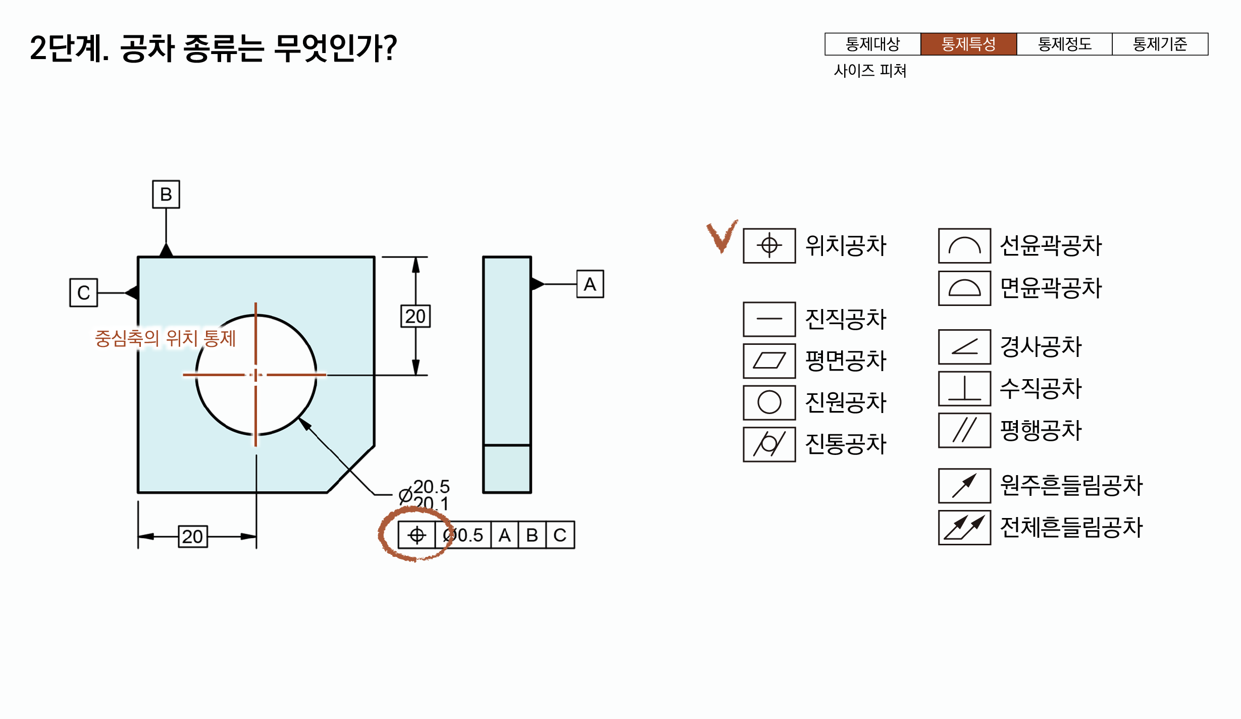그 다음으로 공차종류를 확인한다. 공차 종류는 12가지가 있다. 각각의 공차는 피쳐의 어떤 기하학적 특성을 통제하려고 하는지 직관적으로 알려준다. 예를 들면 진직공차는 직선에 가까운 정도를 통제한다. 진통공차는 원통에 가까운 정도를 통제한다. 면윤곽공차는 특정 윤곽에 가까운 정도를 통제한다.