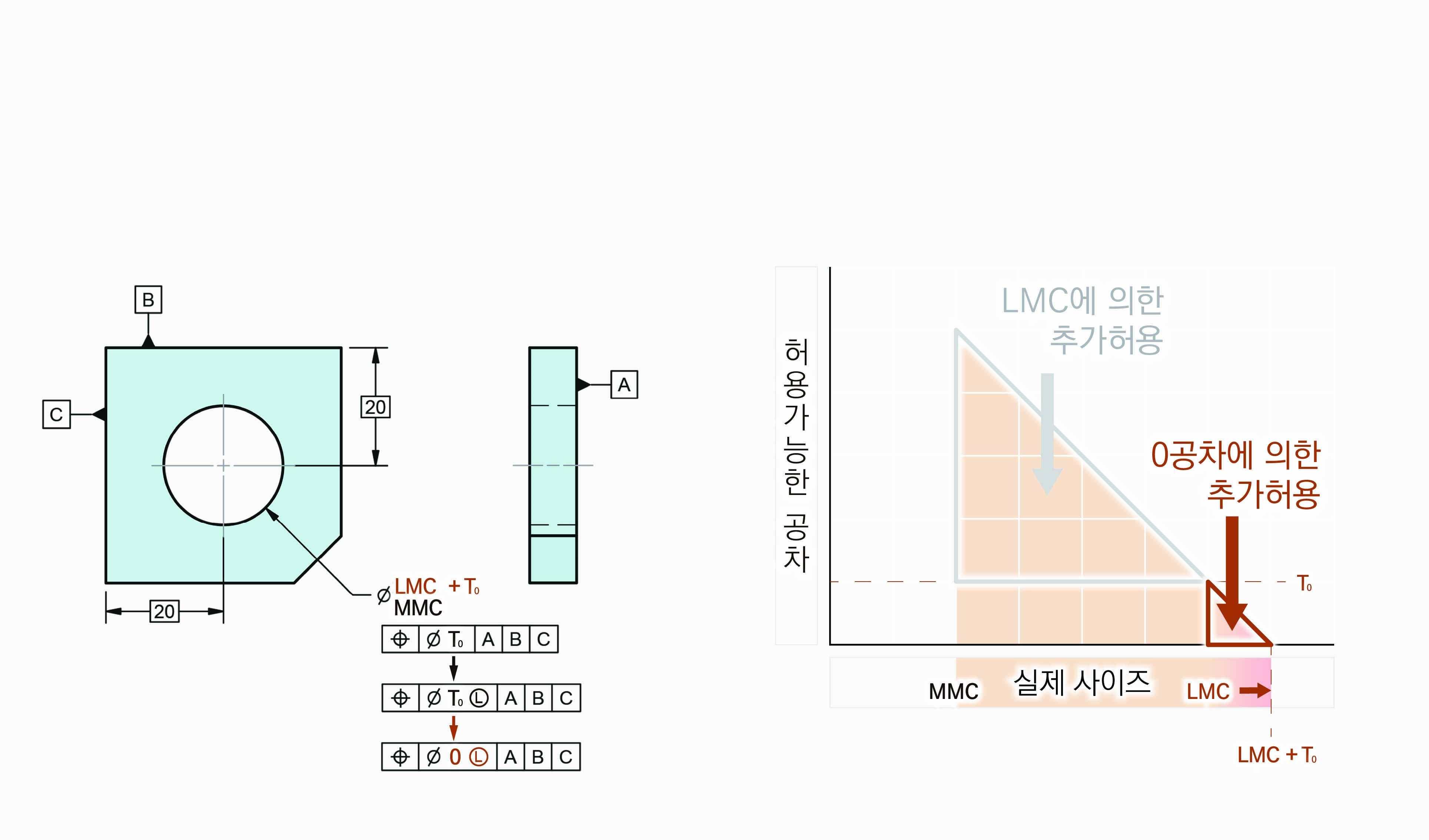이제 홀의 위치공차가 T0에서 T0Ⓛ로 변경되었다. 재료조건 모디파이어 Ⓛ이 공차조건으로 적용됨에 따라 FCF에 명시된 위치공차값은 피쳐가 LMC 상태일 때 적용된다. 따라서 홀이 가장 클 때가 LMC 상태이기 때문에 위치공차 T0는 LMC 상태일 때 적용되고, 홀이 LMC 상태에서 멀어진다면, 멀어지는 만큼 허용가능한 위치공차가 증가된다. LMC에 의해 추가적으로 허용되는 위치공차는 위 그림의 오른쪽 그래프에 나타내었다.