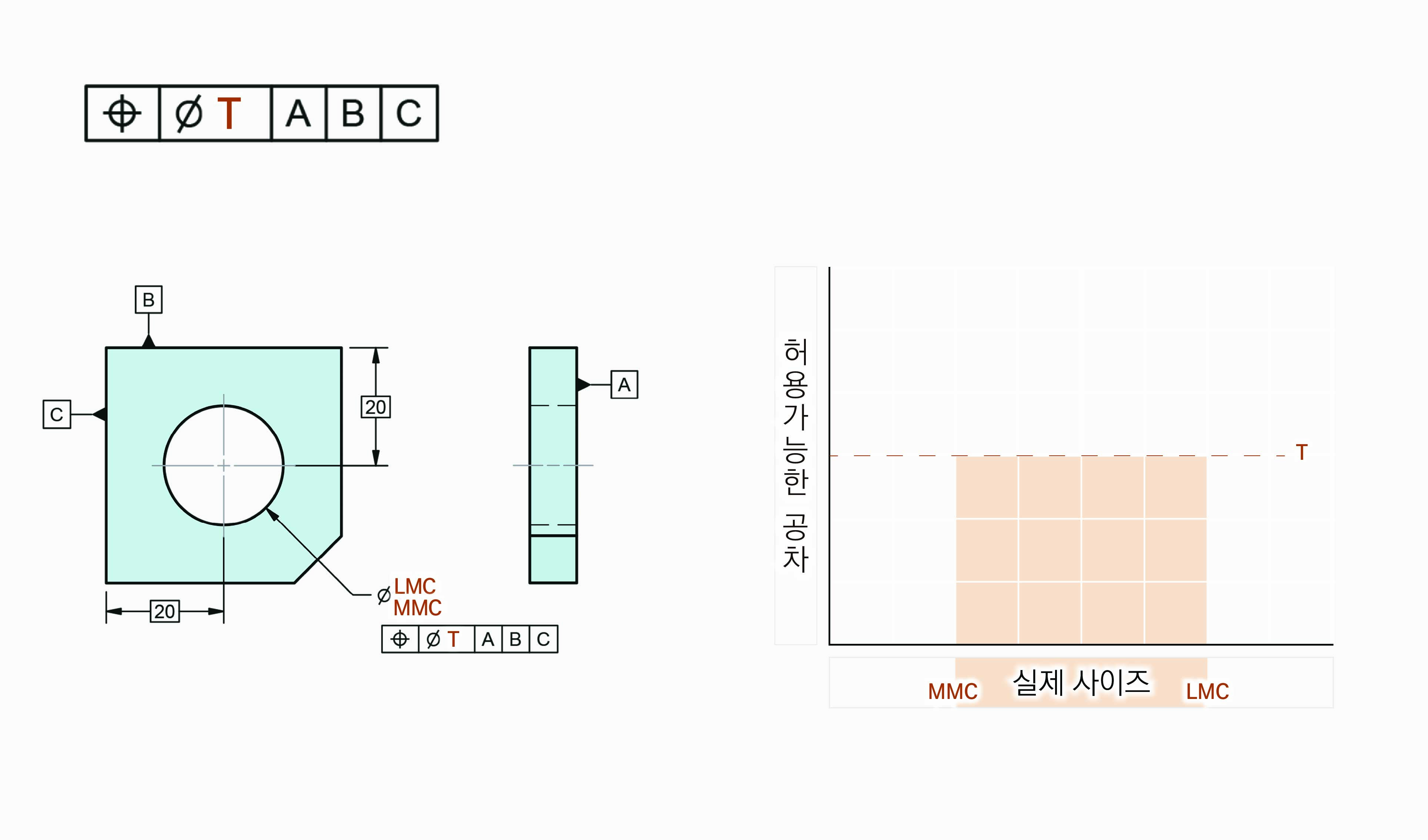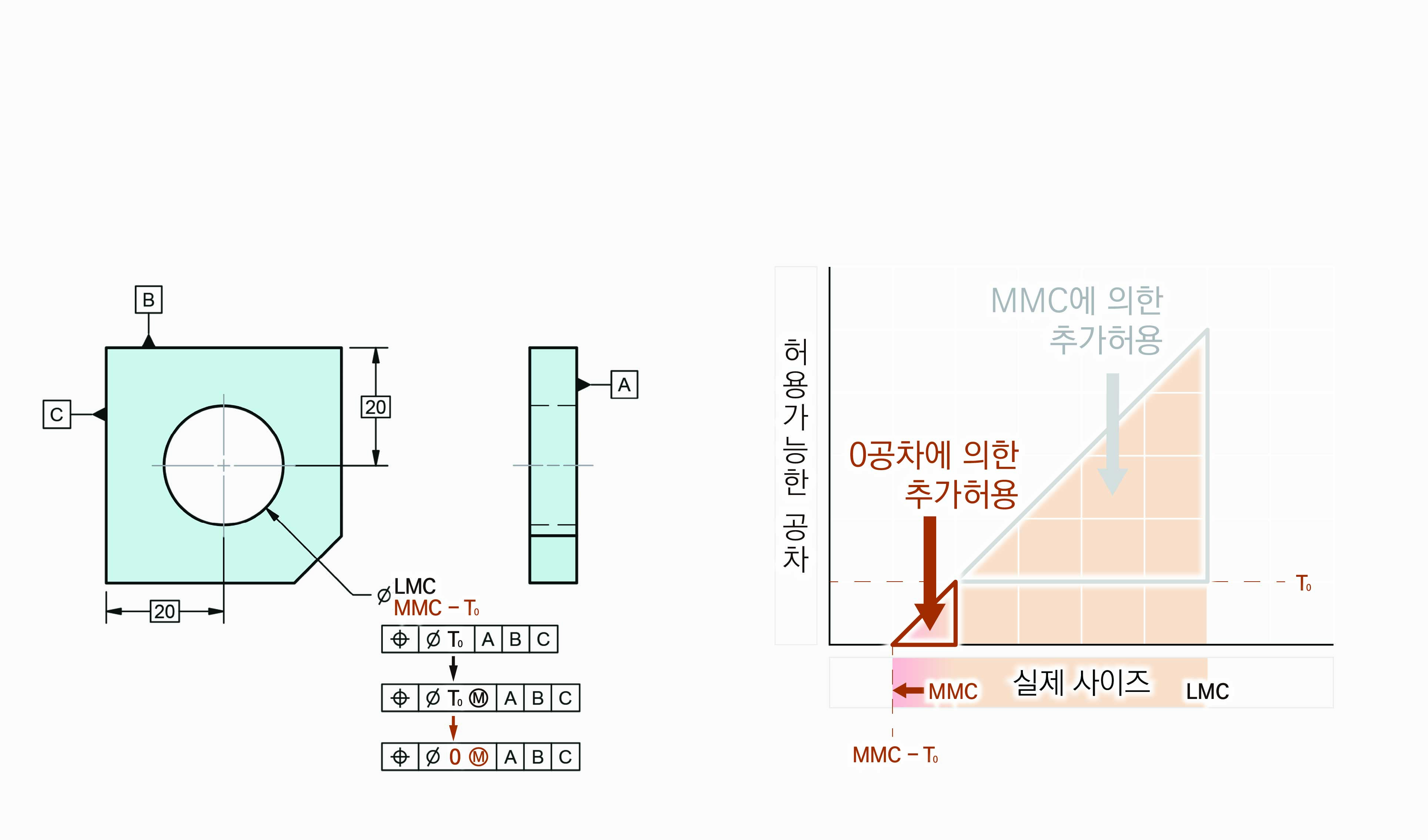 최초로 정의된 위치공차 값을 T0로 보고, MMC에서 0공차까지 단계적으로 설명한다.