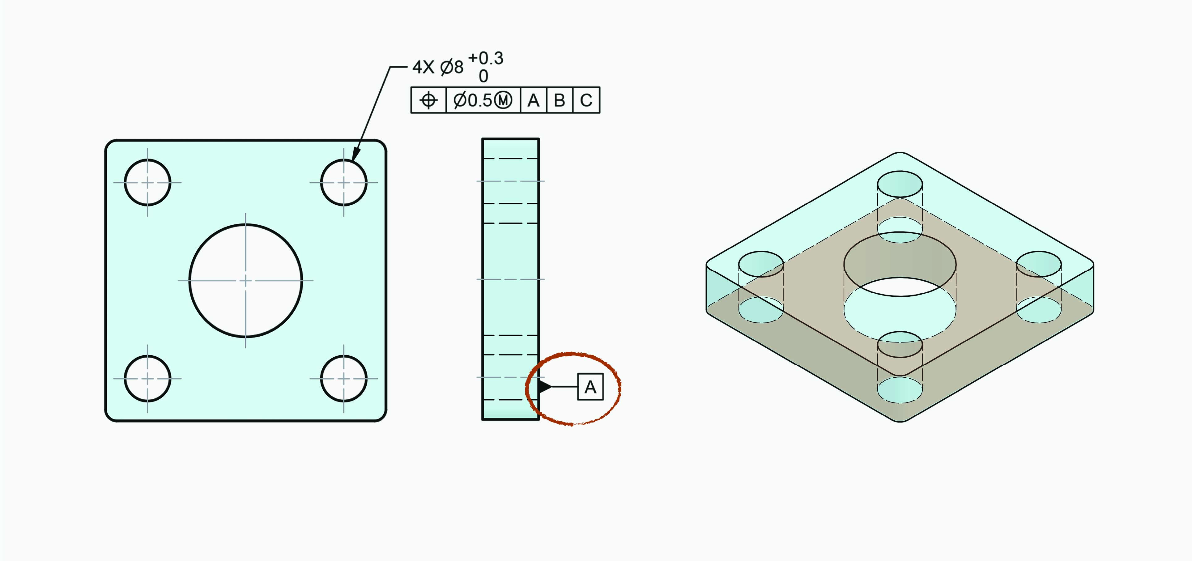 이전에 배운 것처럼 데이텀 피쳐 심볼의 위치를 통해 사이즈 피쳐를 데이텀 피쳐로 정하는지 서피스를 데이텀 피쳐로 정하는지 알 수 있다. 이전 예시에서는 평면 서피스를 데이텀 피쳐로 정한 것을 살펴보았다. 이번 예시는 사이즈 치수에 데이텀 피쳐 심볼이 연결되어 있으므로, 사이즈 피쳐를 데이텀 피쳐로 사용하겠다는 것을 의미한다. 데이텀 시뮬레이터는 데이텀 피쳐에 동시에 접촉하면서 서로 평행한 상태를 유지해야 한다. 데이텀 각 서피스의 높은 점들이 평행한 두 개의 데이텀 시뮬레이터 내에서 부품의 자세를 결정하게 된다. 이 경우에 데이텀은 두 개의 데이텀 시뮬레이터 사이에 정확하게 중심에 있는 평면이 된다.