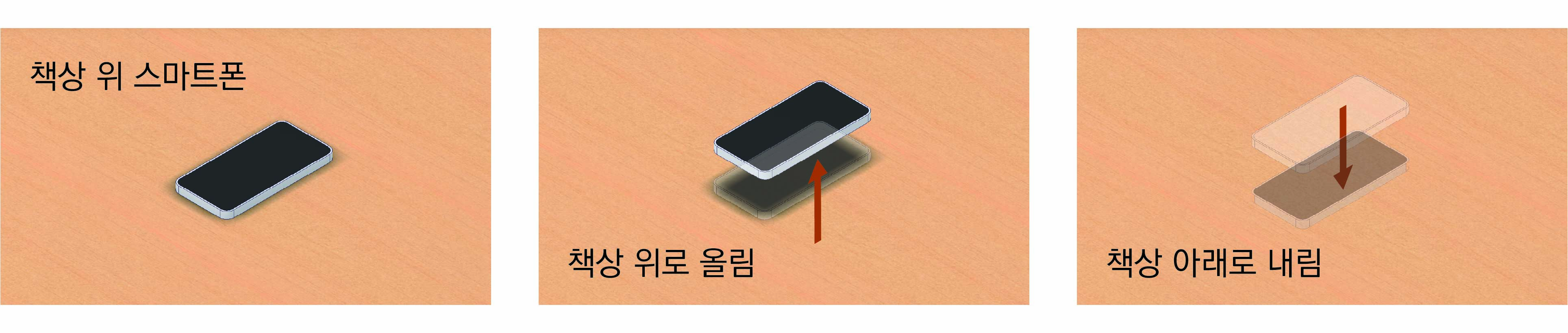 먼저 스마트폰은 책상 아래로 내려갈 수 없다. 스마트폰이 책상을 뚫고 내려갈 수 없기 때문에 책상 위 스마트폰을 책상 아래로 내릴 수 없다. 다음으로 스마트폰 뒷면과 책상 상면이 맞닿은 상태에서는 스마트폰을 좌우로 회전할 수 없다. 마찬가지로 앞뒤로도 회전할 수 없다.