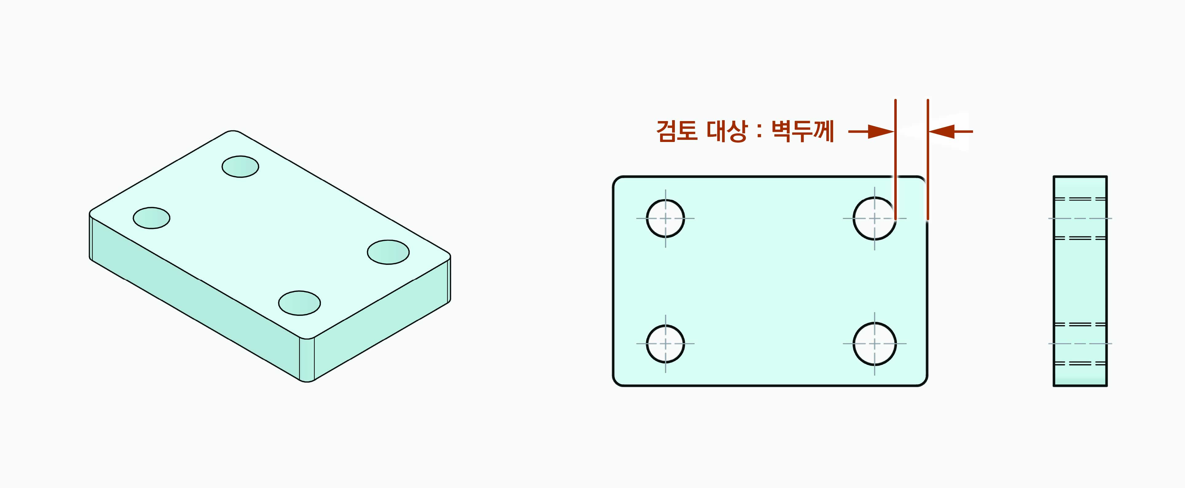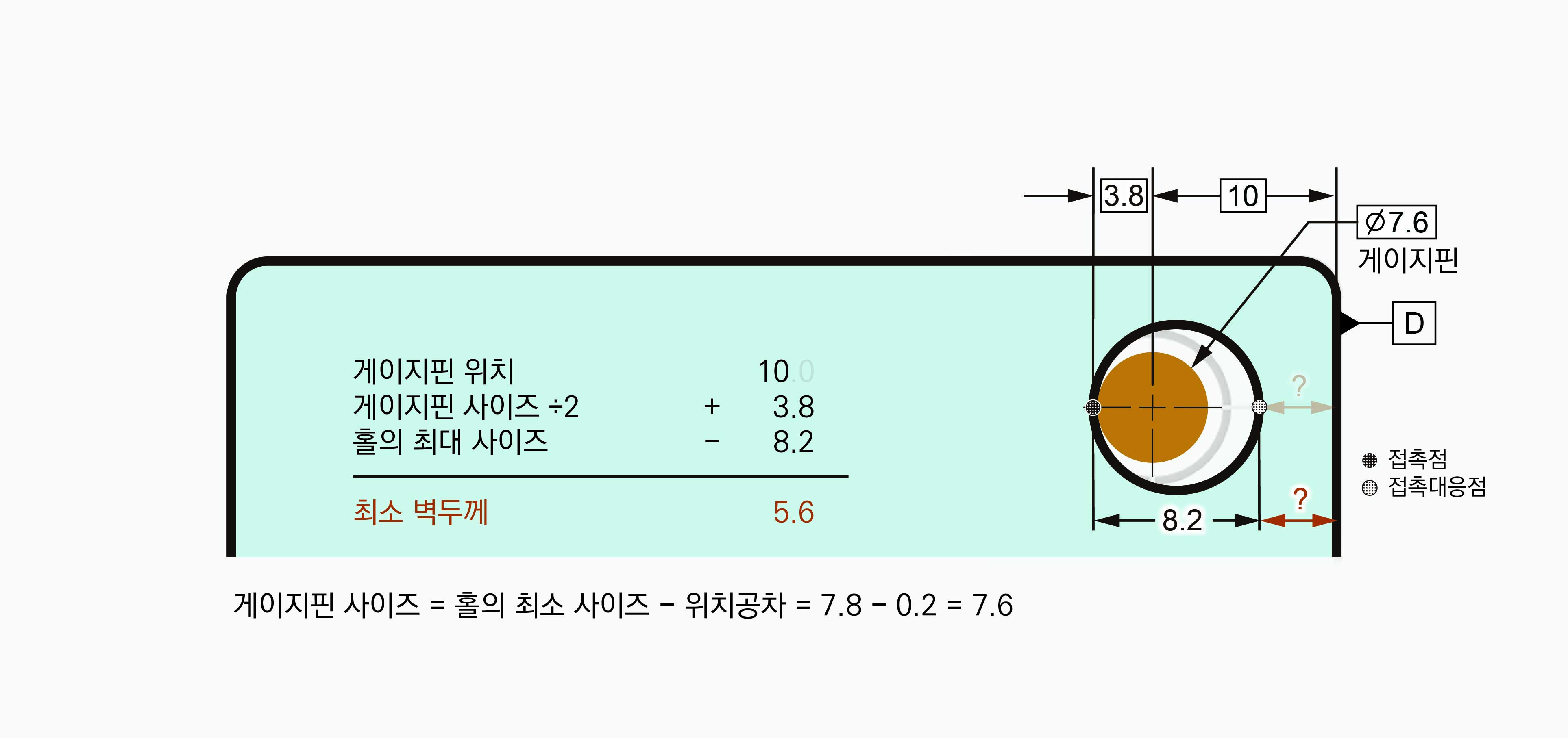 벽두께가 최소가 되는 때는 홀이 벽쪽으로 가장 가깝게 있을 때이다. 홀 안에는 게이지핀이 있어야 한다. 게이지핀 위치는 고정되어 있다. 홀은 게이지핀을 통과할 수 없기 때문에 홀 왼쪽과 게이지핀 왼쪽이 접촉할 때 홀이 벽에서 가장 가깝게 있게 된다. 게이지핀 위치는 고정되어 있기 때문에 이 접촉점 위치도 고정된다. 게이지 핀 위치 10에 게이지핀 사이즈의 반 3.8을 더하면 13.8로 데이텀 D를 기준으로 한 접촉점 위치가 구해진다.