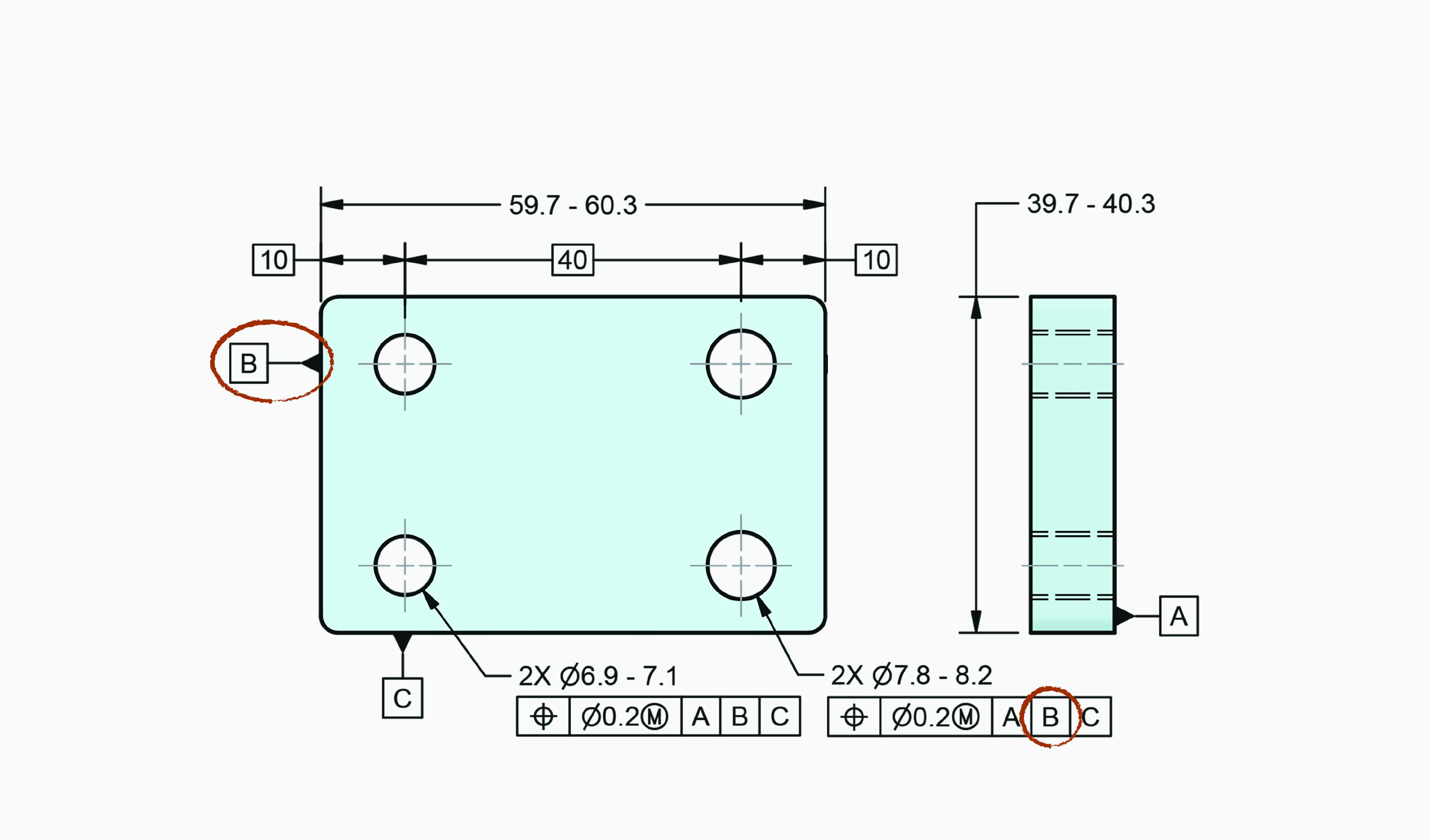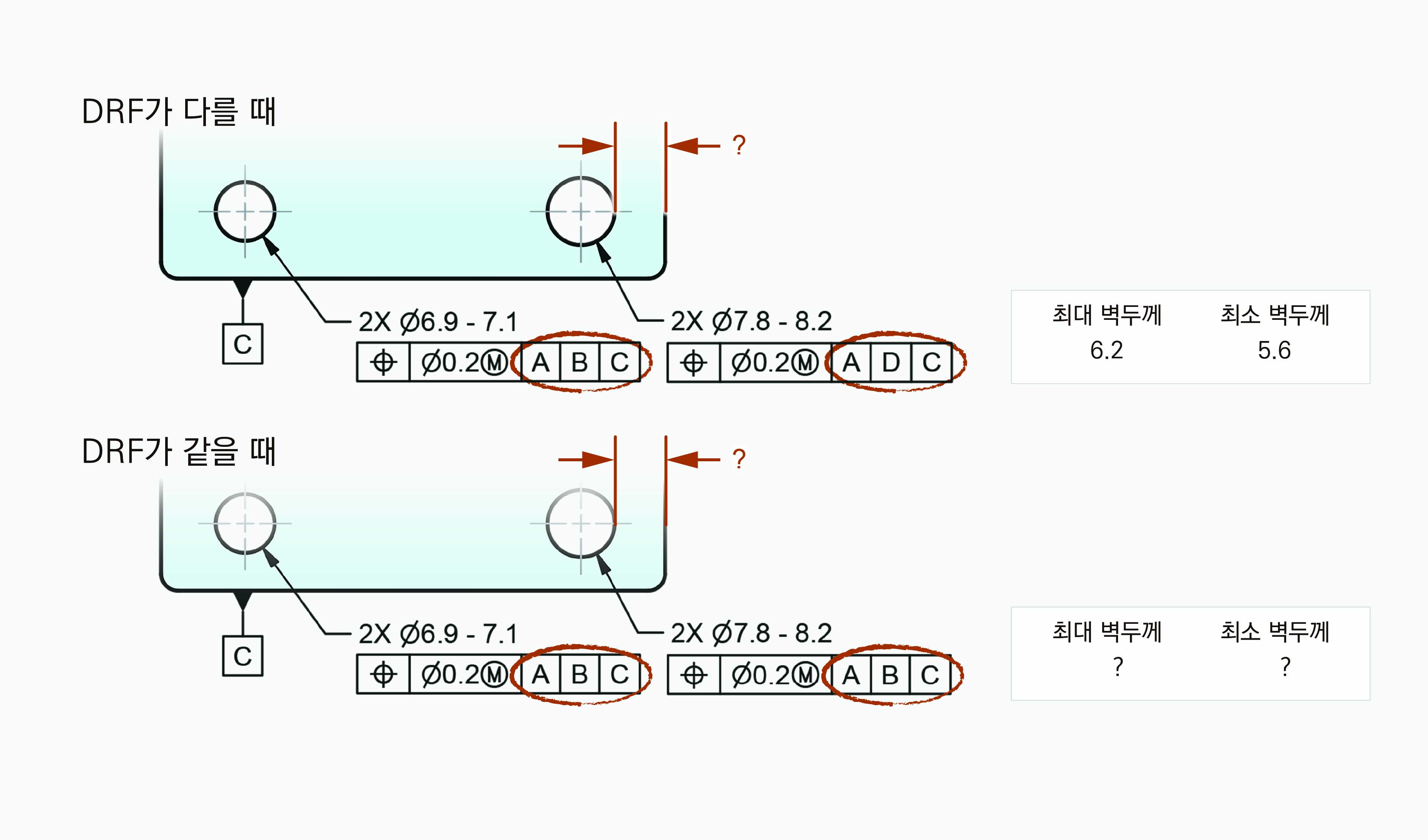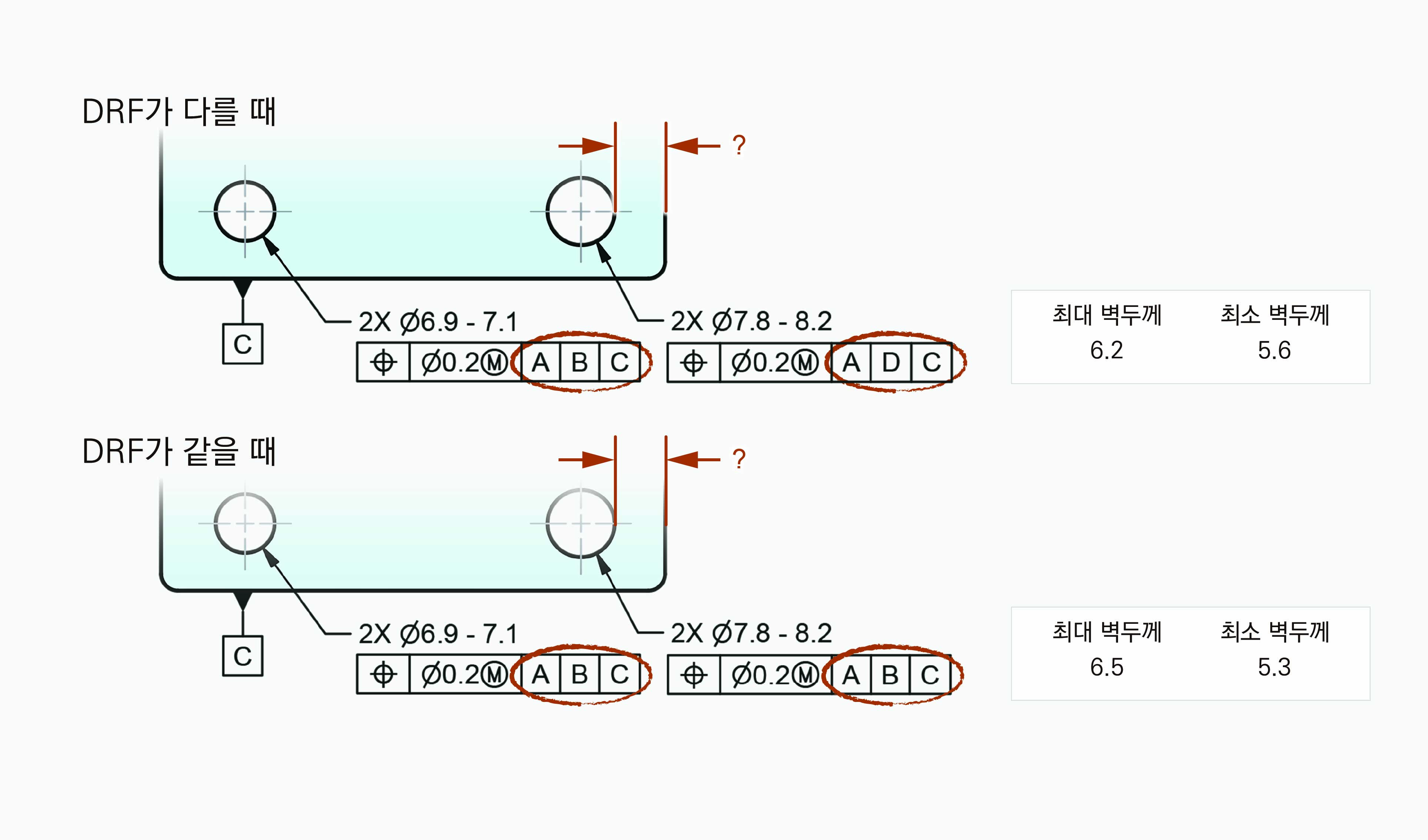 왼쪽 홀 2개의 2차 데이텀 피쳐는 데이텀 피쳐 B이고, 오른쪽 홀 2개의 2차 데이텀 피쳐는 데이텀 피쳐 D로 데이텀 피쳐를 다르게 참조하여 DRF가 다르게 설정되었다. 이는 보통 왼쪽 홀과 오른쪽 홀이 각각 다른 피쳐와 대응하여 조립될 때 이와 같은 DRF를 설정한다.