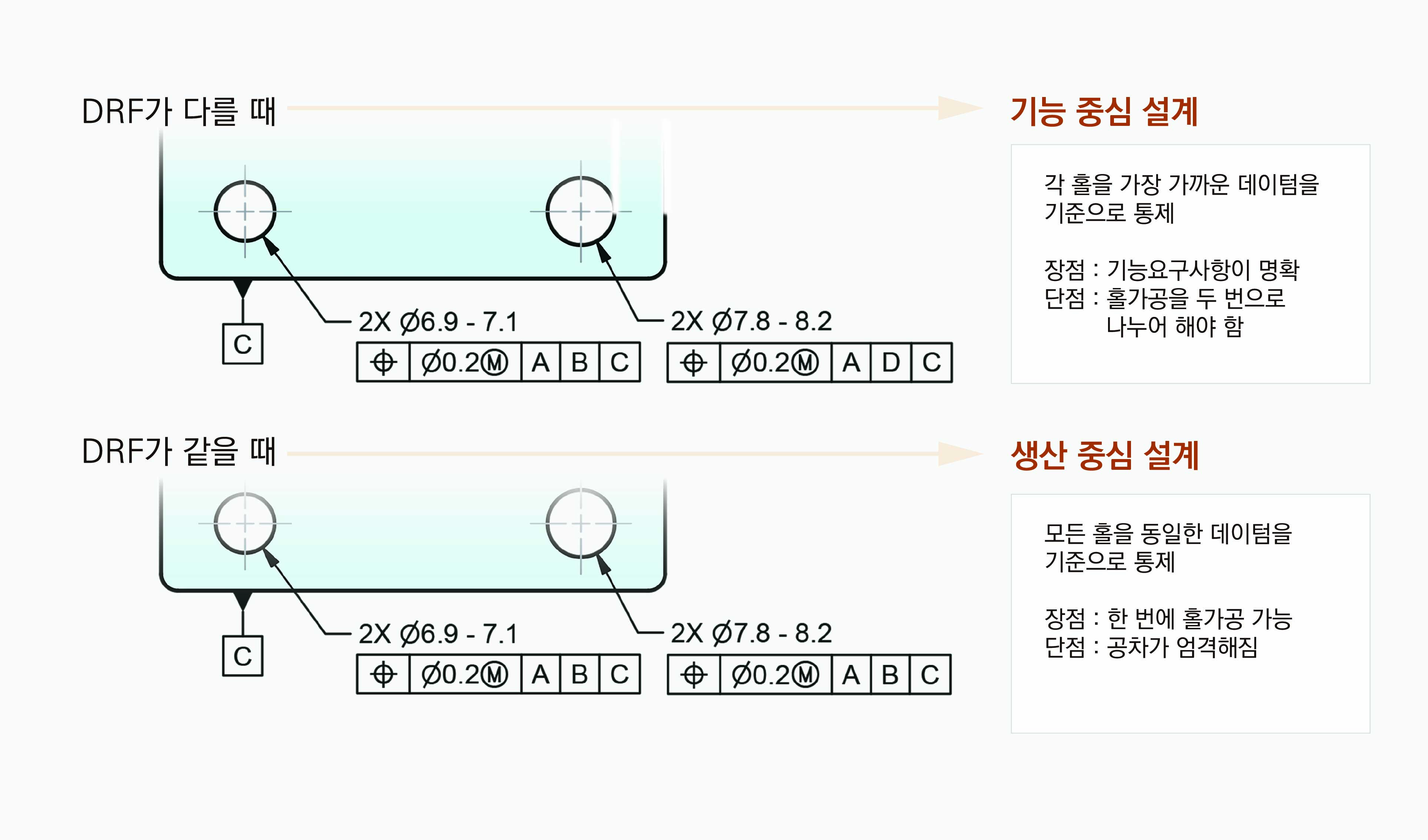 각 홀을 가장 가까운 데이텀을 기준으로 통제하도록 DRF를 다르게 설정하면, 기능요구사항을 명확하게 정의하는 장점이 있지만, 홀가공을 두 번으로 나누어 해야 하고, 검사도 두 번에 나누어 해야 하는 단점이 있다. 이는 생산입장에서 바람직하지 않은 조건이다.