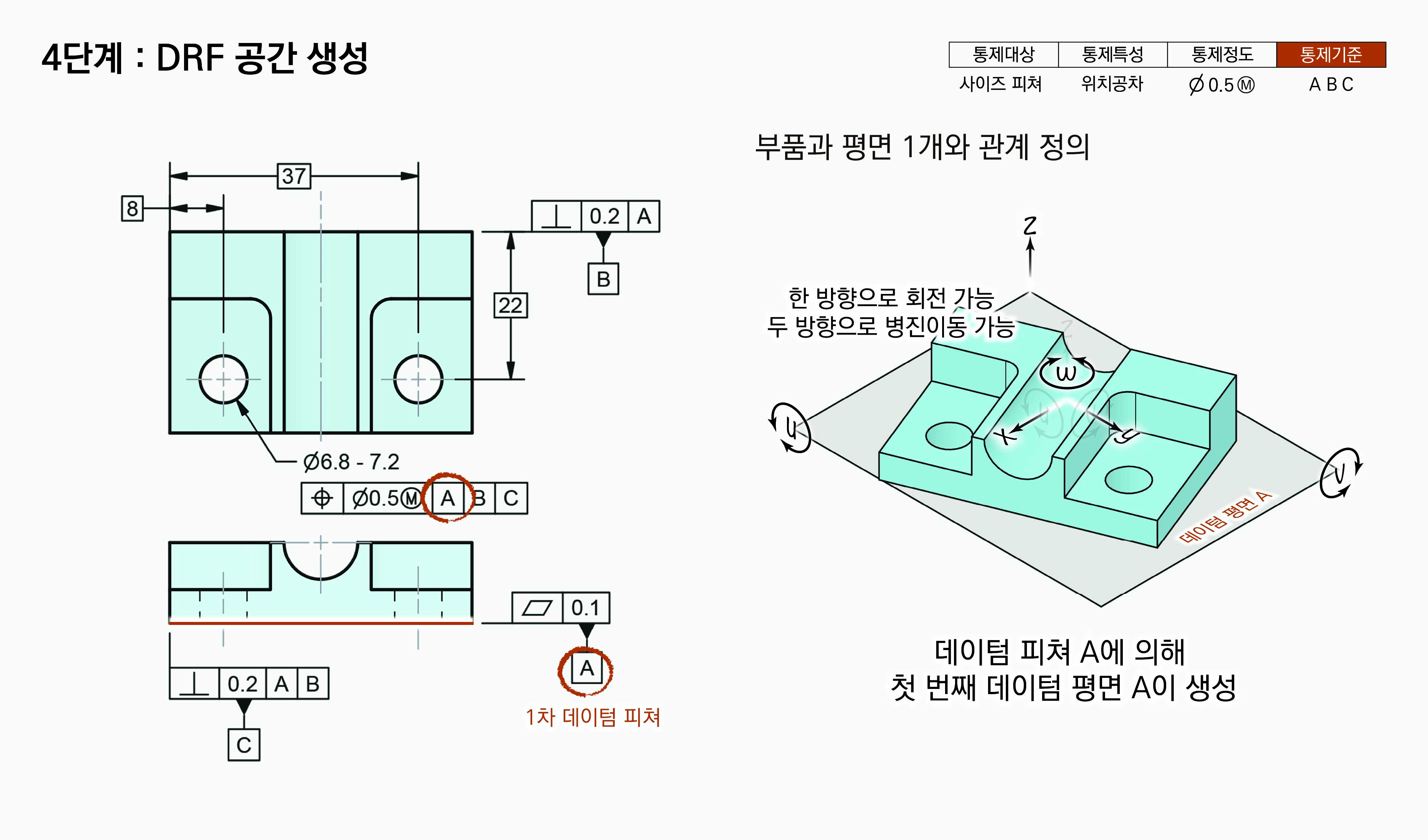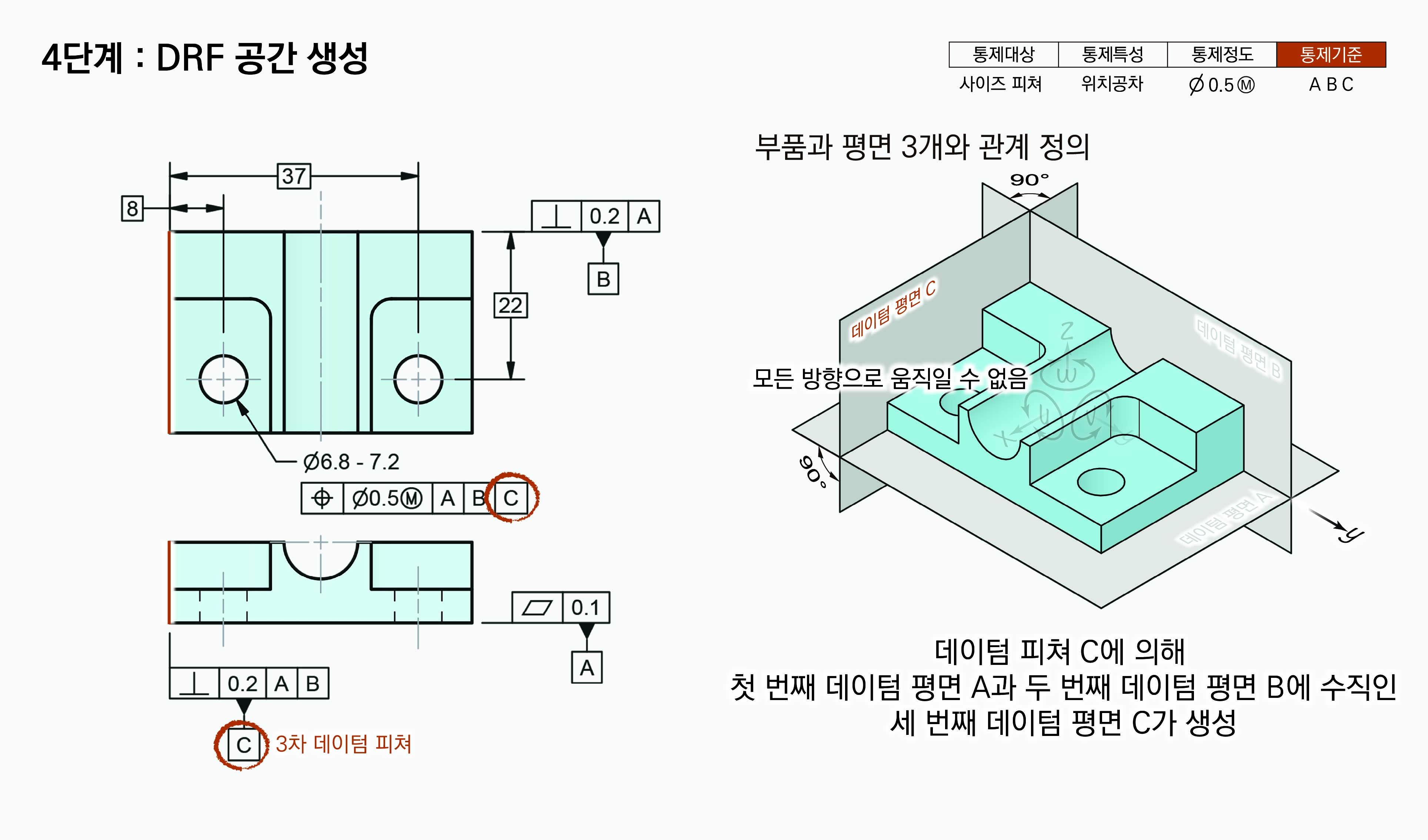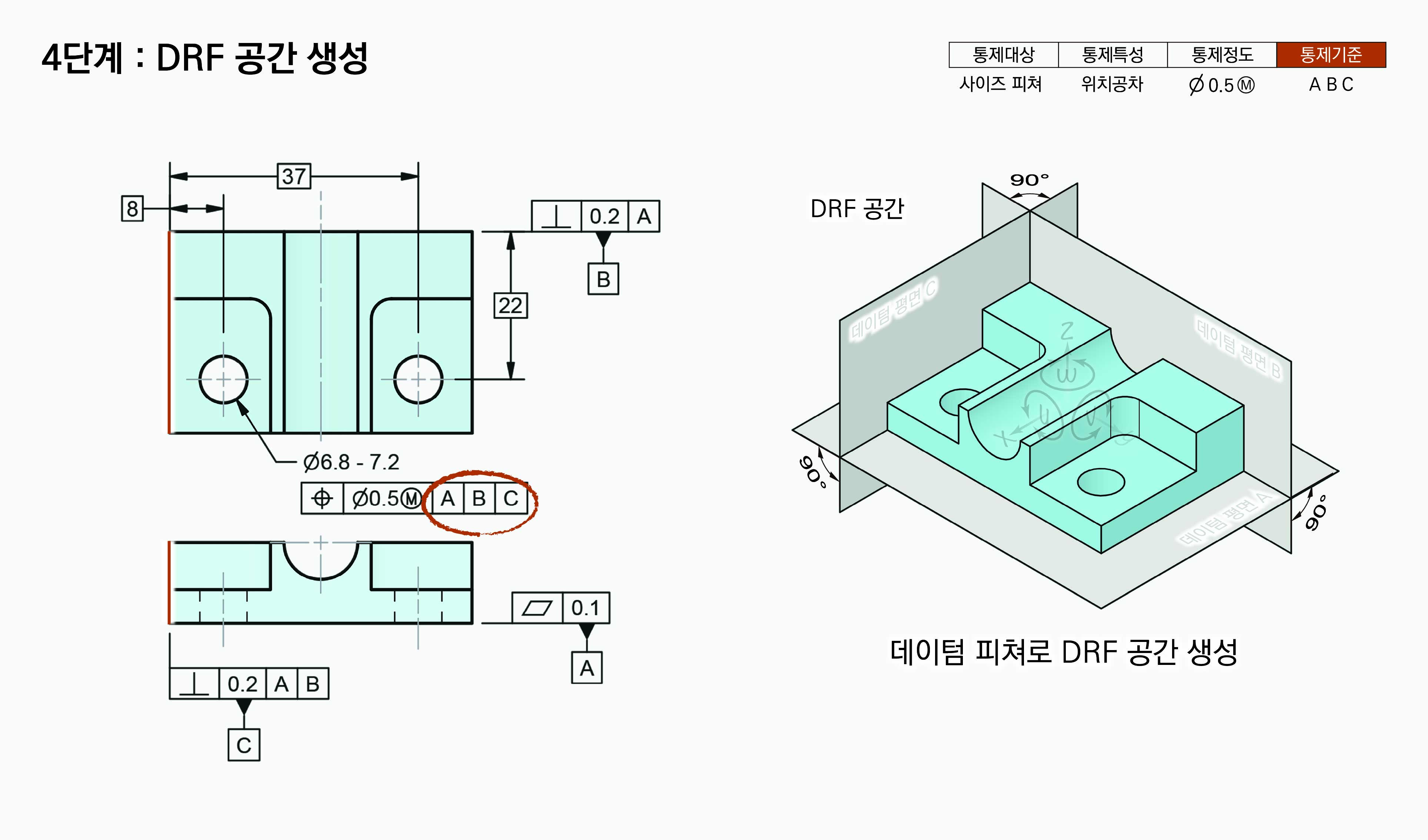 데이텀 피쳐에 의한 DRF 공간이 구축되었다. 이렇게 구축된 DRF공간에 공차영역이 생성된다. 공차영역은 DRF공간에서 각도관계와 거리관계에 의해 자세와 위치가 정의된다.