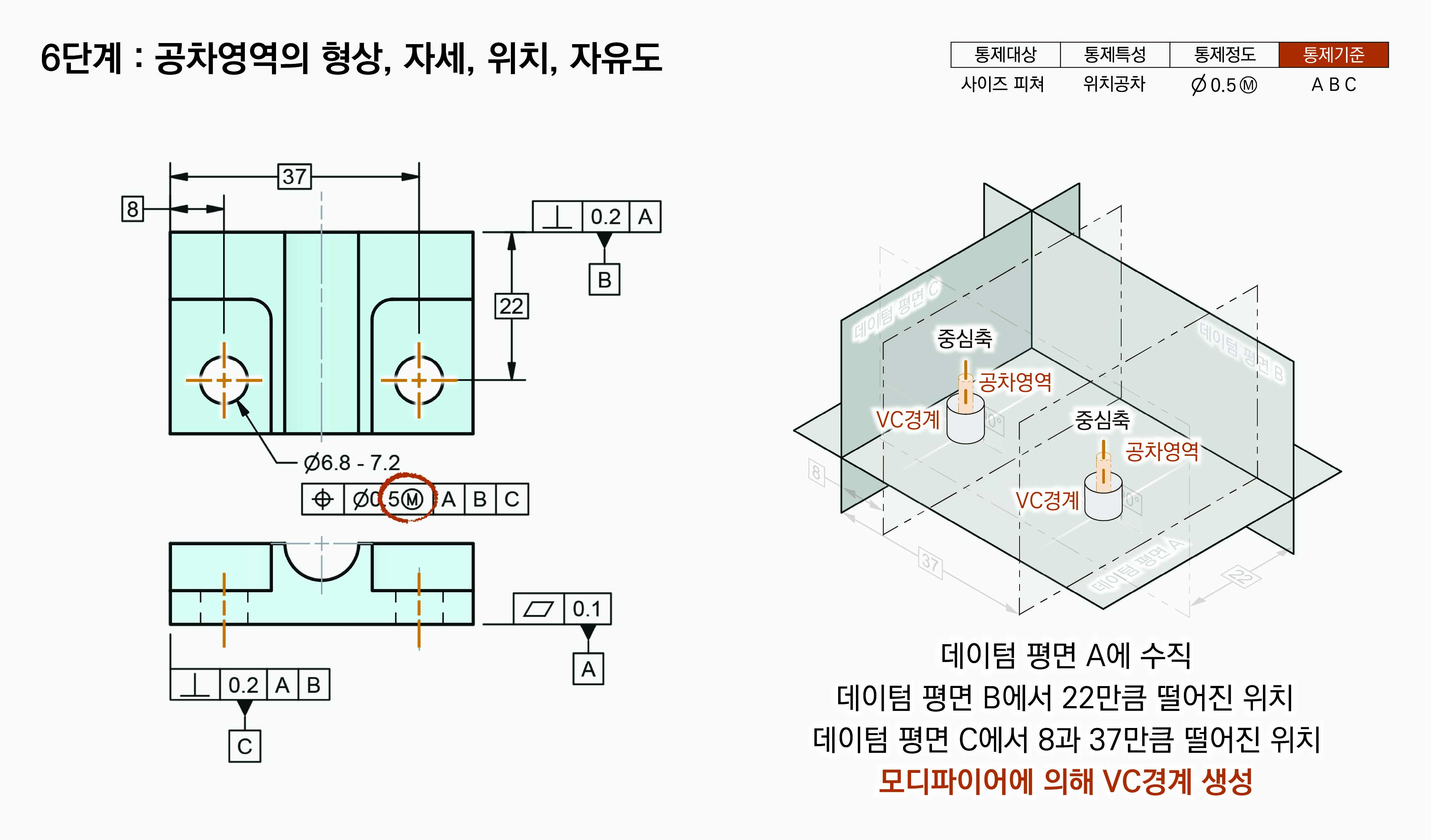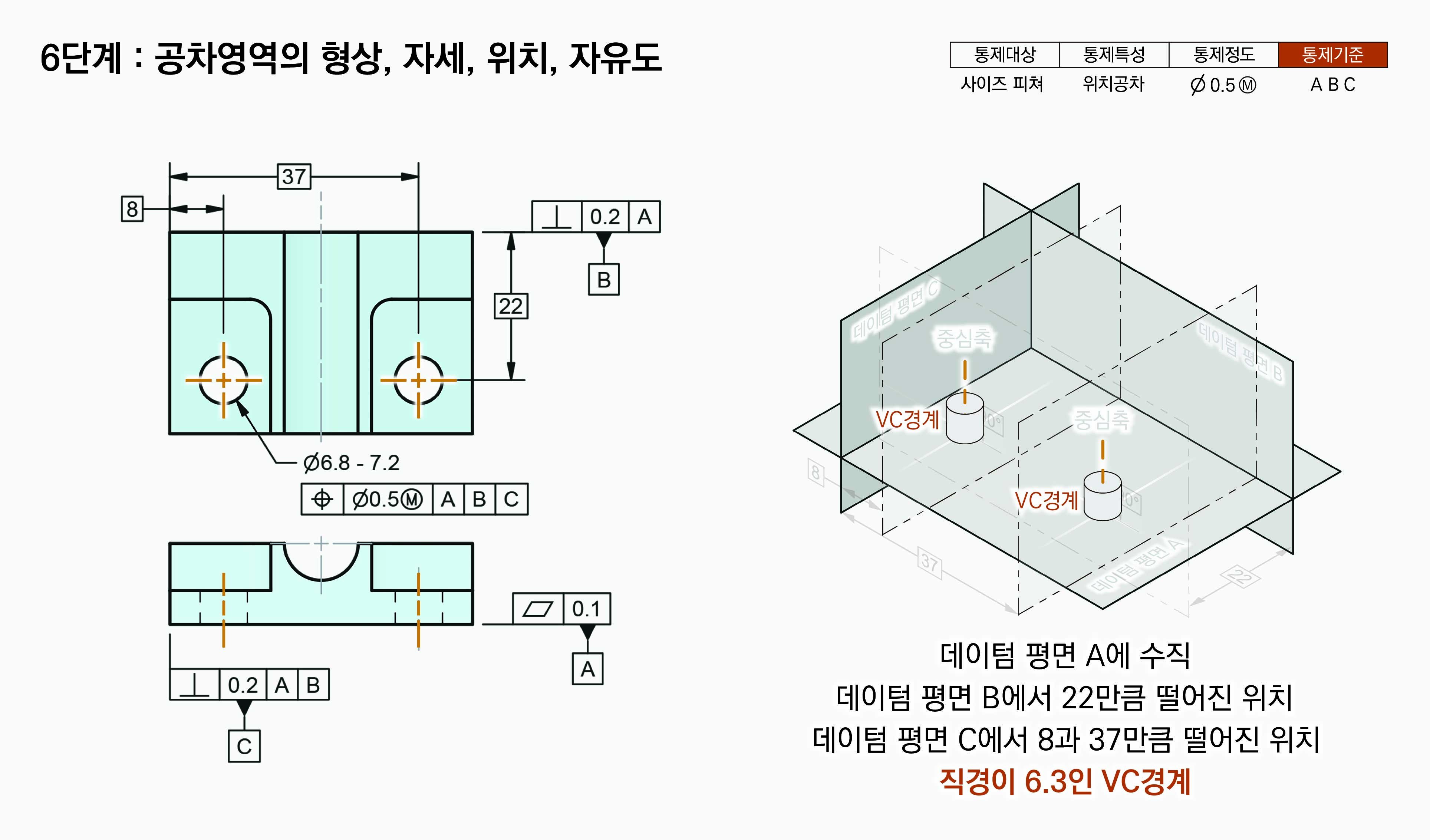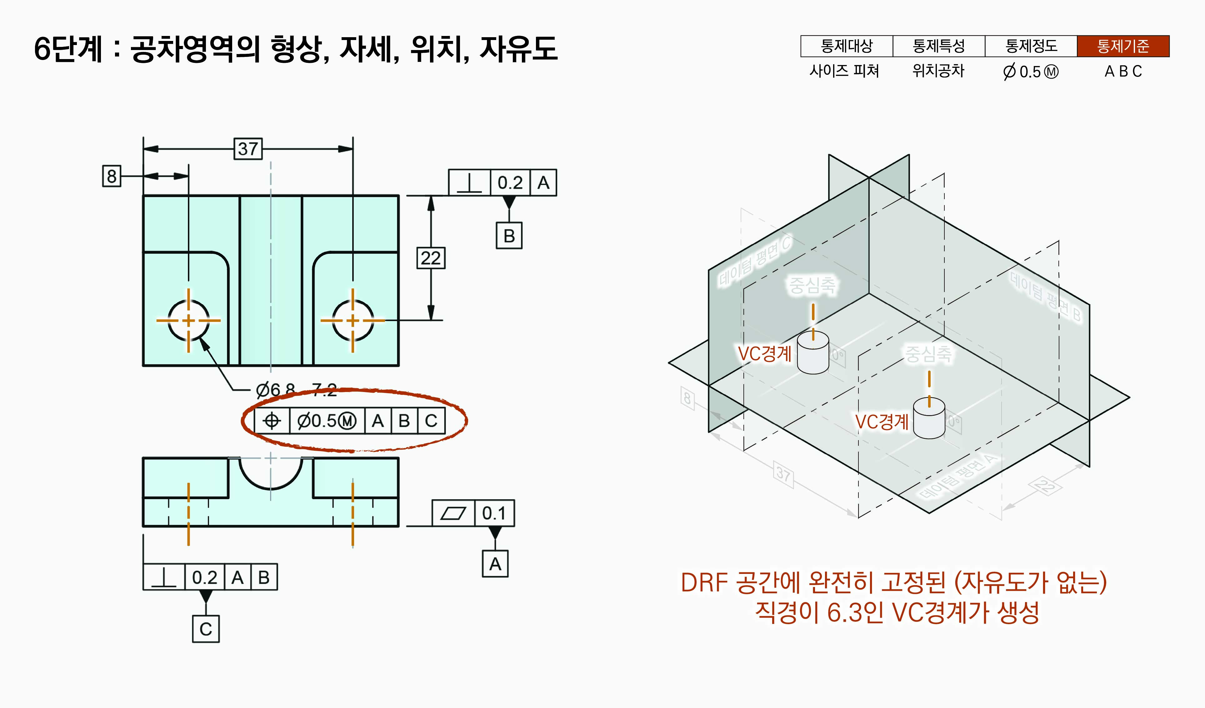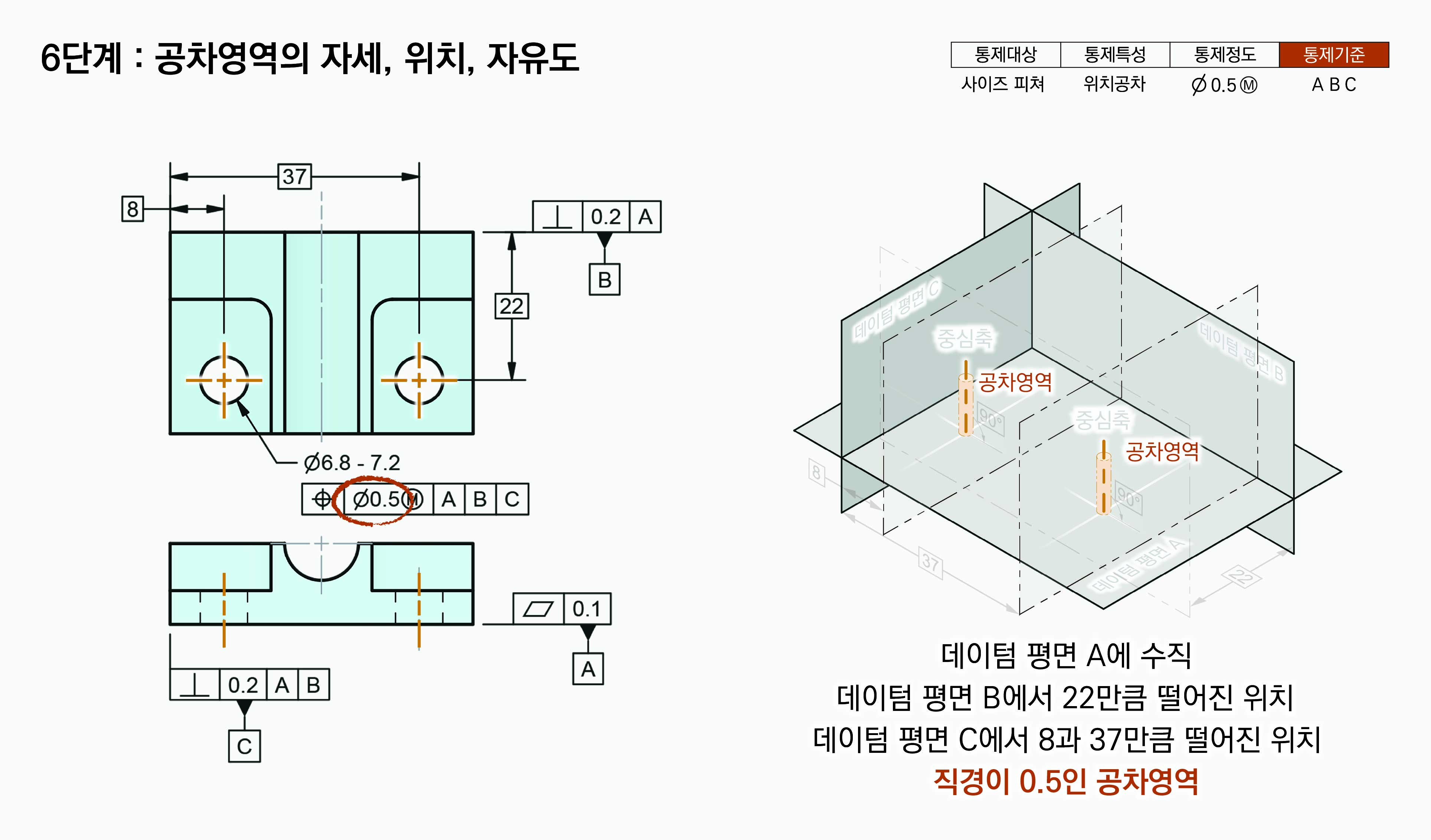 6) 통제기준 : 공차영역의 자세 및 위치, 자유도