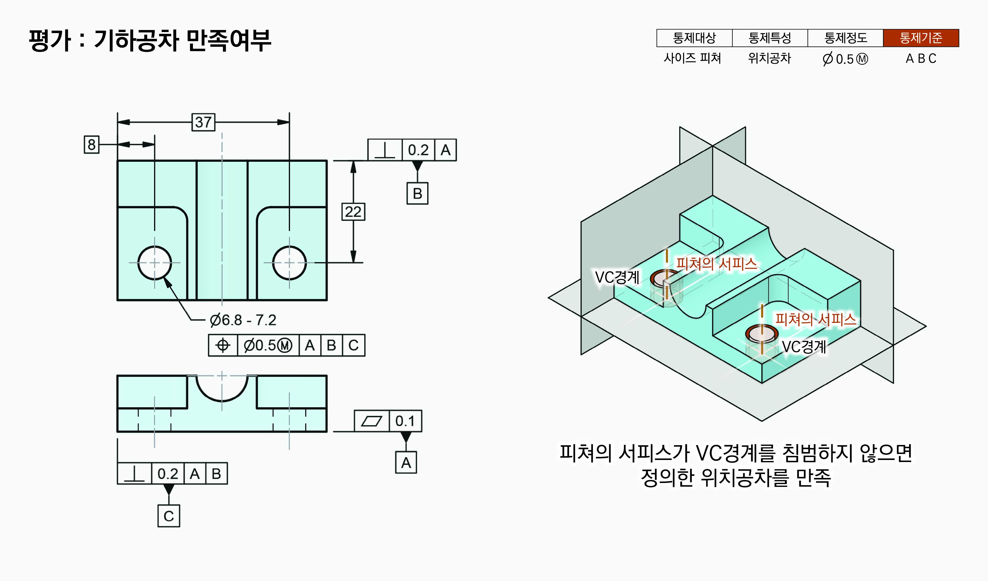 위치공차가 MMC에서 정의되었기 때문에 피쳐의 중심축이 아닌 서피스를 평가한다. 서피스가 VC경계를 침범하지 않으면 정의한 위치공차를 만족한 것으로 본다.