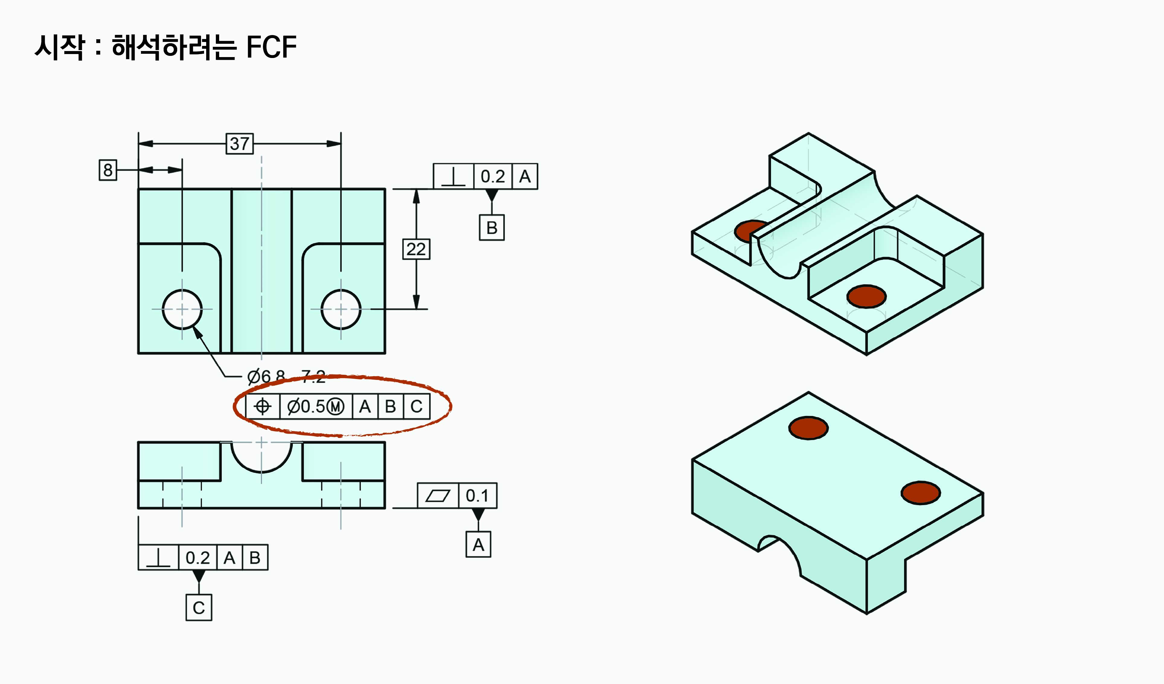 도면에서 가장 먼저 찾아야 할 것은 FCF이다. 기하공차 해석은 FCF에서 시작한다. 도면에 많은 기하공차 기호들이 있겠지만, 언제나 시작은 FCF이다. 해석하고자 하는 FCF를 정한다. 그리고 그 FCF에 정의된 규제 내용을 살펴보자.