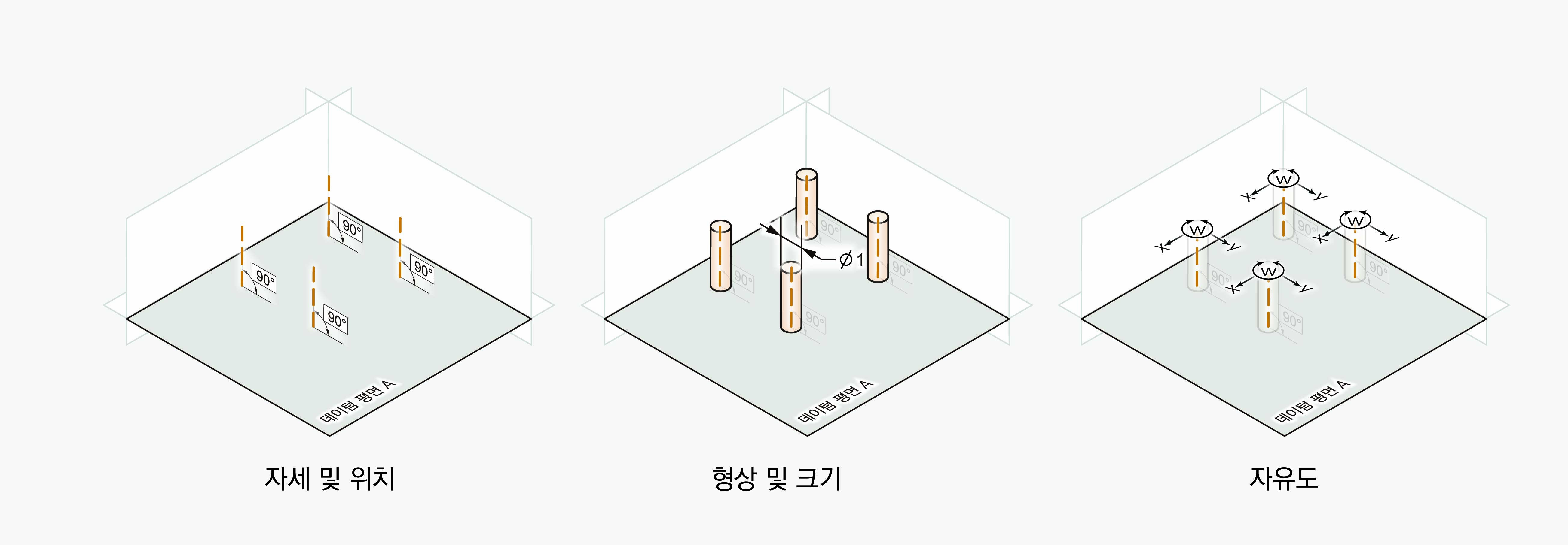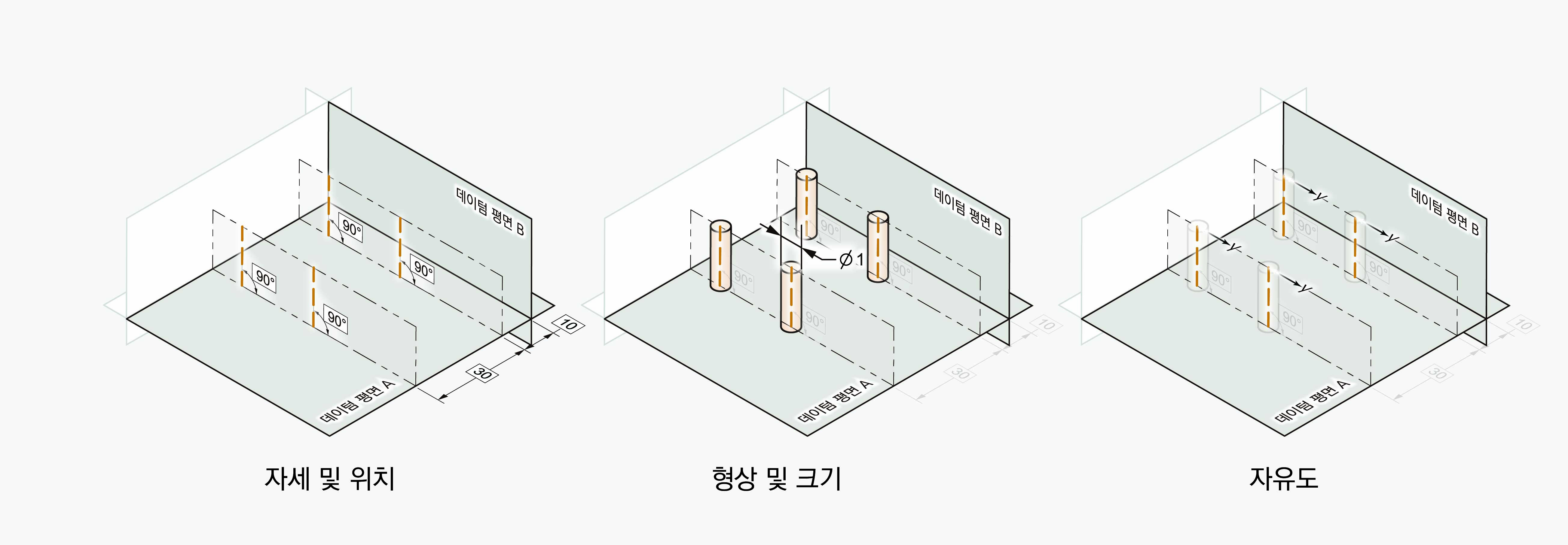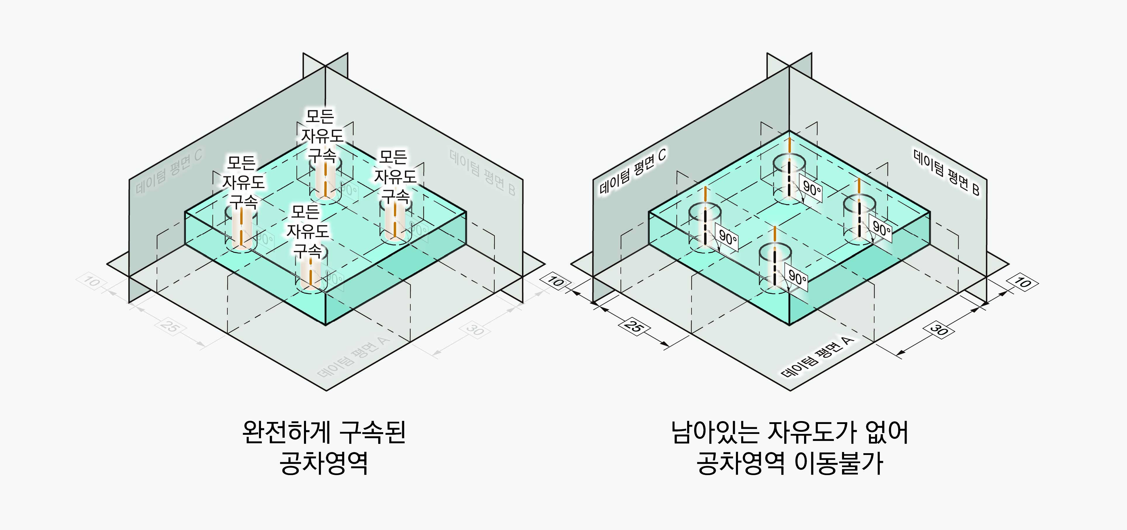 GD&T로 통제할 때 보통은 다음 그림과 같이 모든 자유도가 구속된 상태로 정의하고 통제한다.