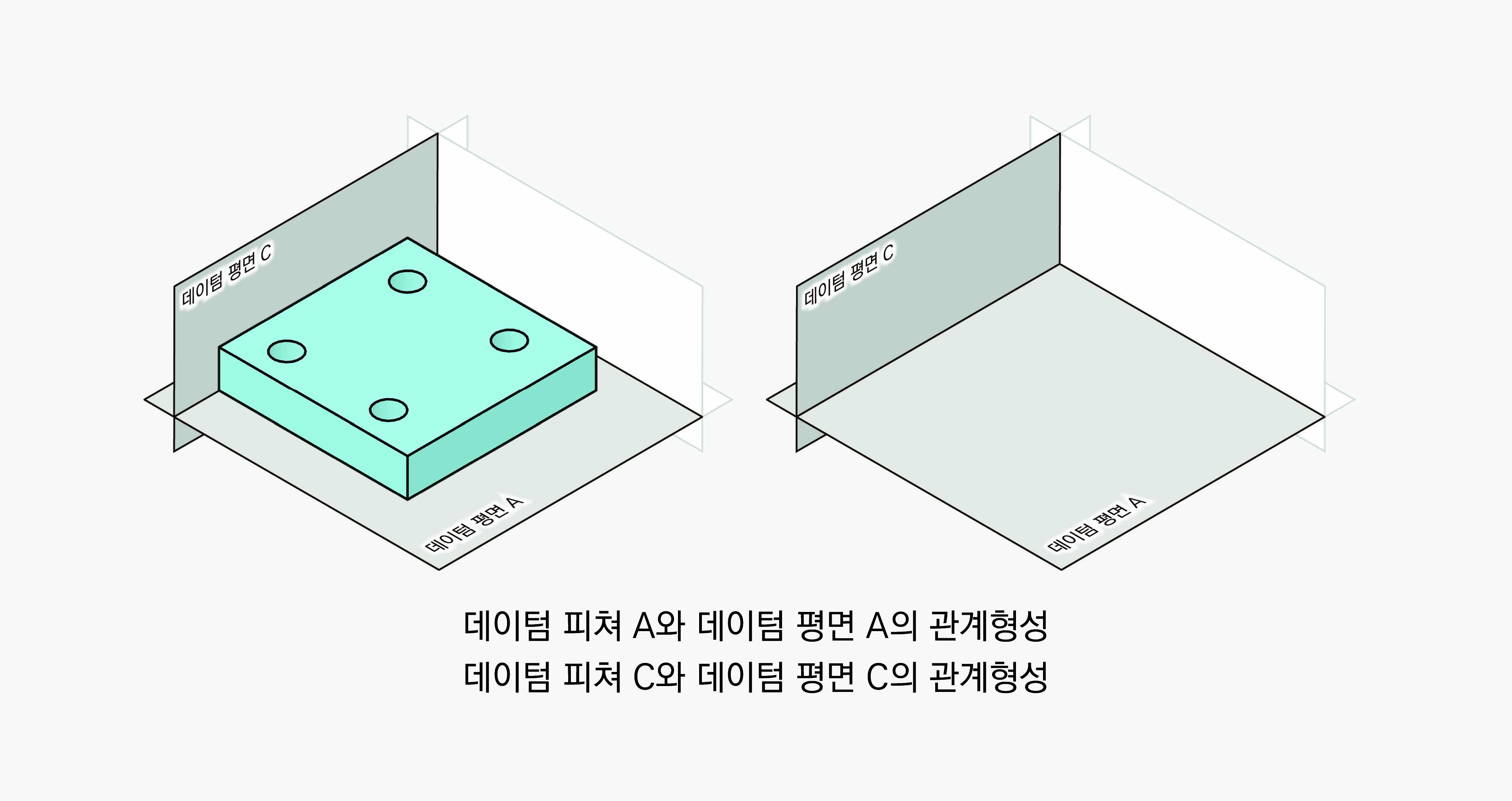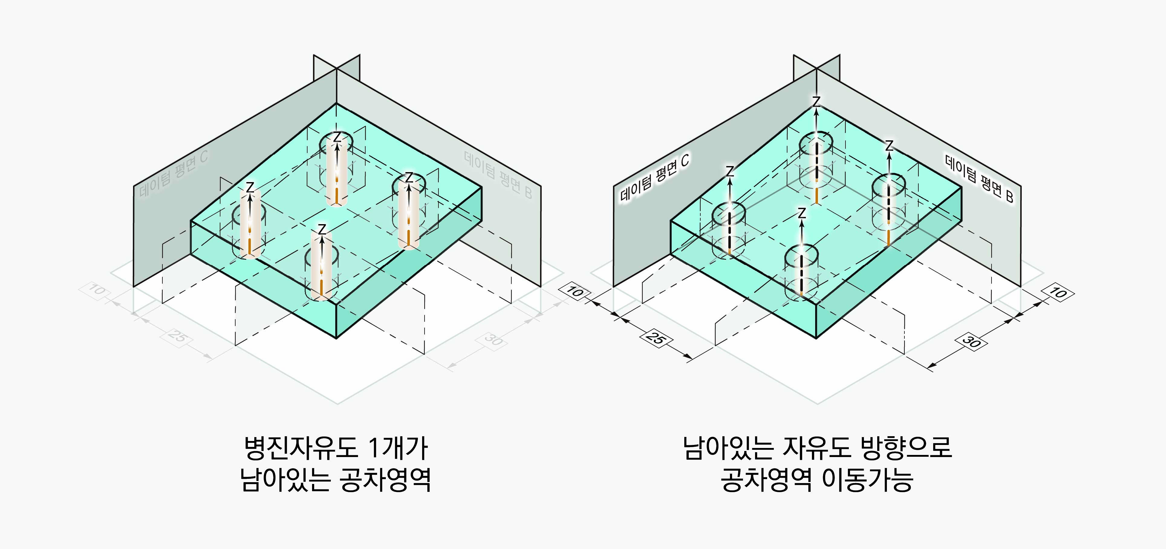 하지만 GD&T는 기능에 따라 공차영역의 자유도까지 이용할 수 있다. 부품은 기능에 따라 모든 자유도를 구속해야 하는 경우도 있지만, 일부 자유도만 제한하여도 충분한 경우가 있다. 일부 자유도만 제한하였을 때 부품의 형상은 어떻게 될 수 있는지 데이텀 피쳐 A, B, C를 참조할 수 있는 7가지 경우를 각각 살펴보자.
