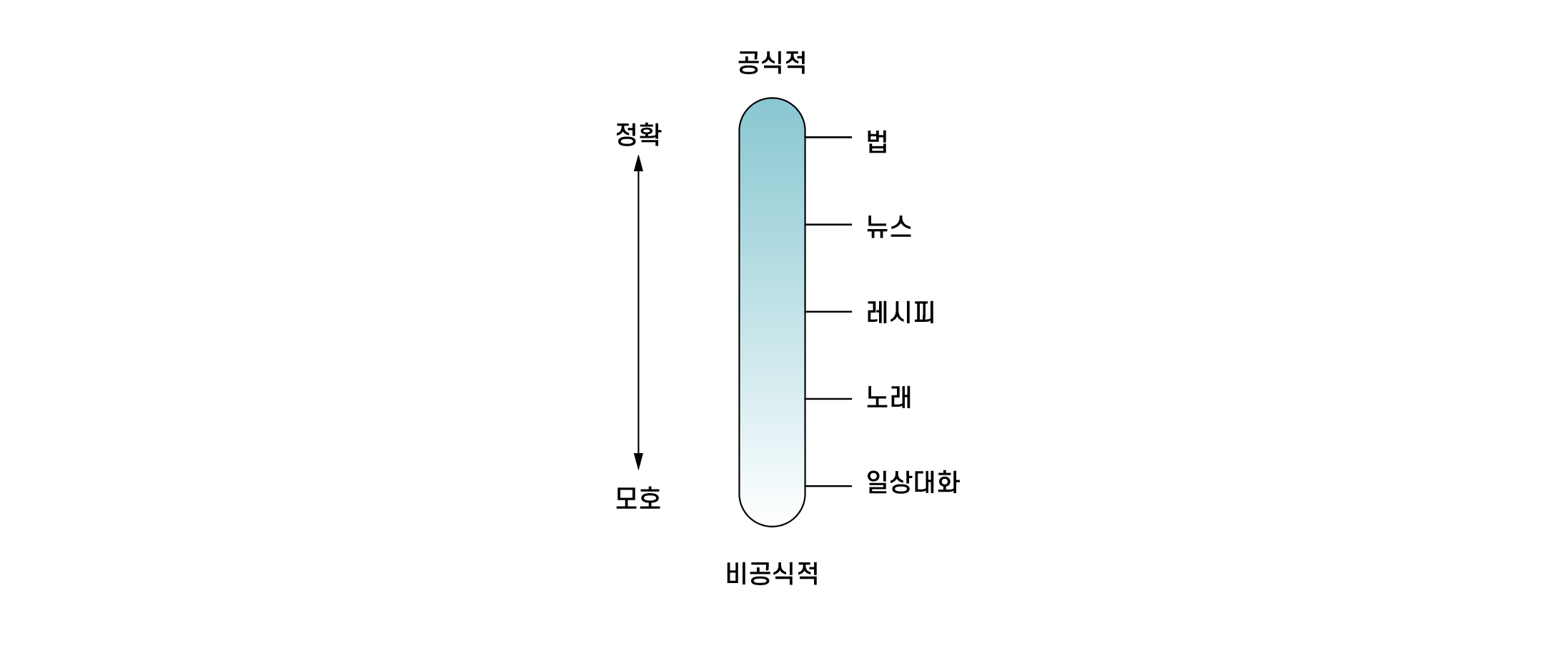 의사소통은 여러 종류가 있다. 공식적인 것도 있고, 비공식적인 것도 있다. 그림은 의사소통 종류에 따라 얼마나 정확성이 요구되는지를 나타낸다. 일상적인 대화나 노래 가사는 비공식적 의사소통으로, 어느 정도 모호함이 내재되어 있다. 하지만 법이나 뉴스는 정확성이 요구된다.