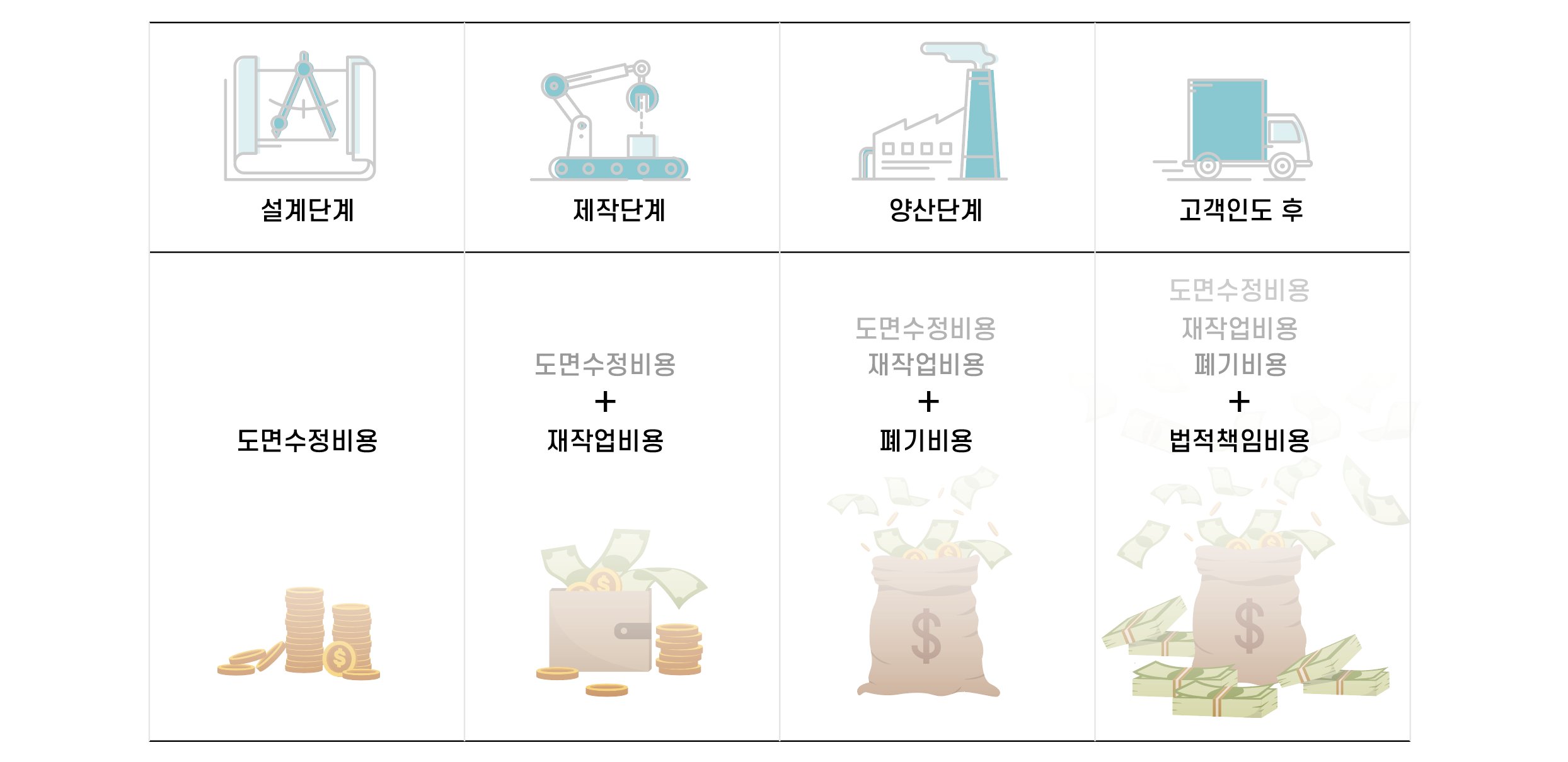 만약 도면오류가 제작단계에서도 발견되지 않은 채 양산에 들어가게 되면, 이 단계에서는 비용이 급격하게 증가하게 된다. 도면을 고치는데 필요한 서류작업에만 수천만원이 들고, 여기에 검사비용, 재작업비용, 폐기비용까지 추가되기 때문이다.